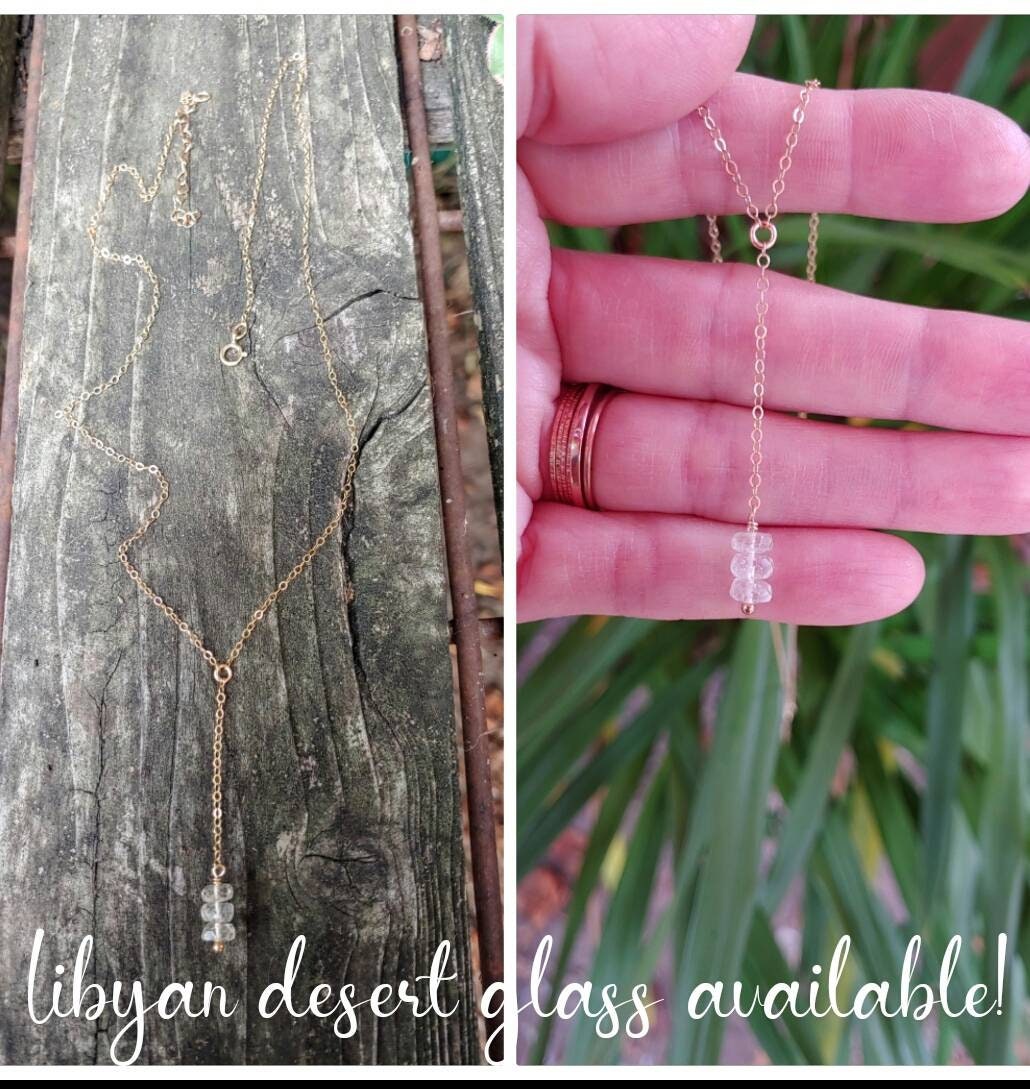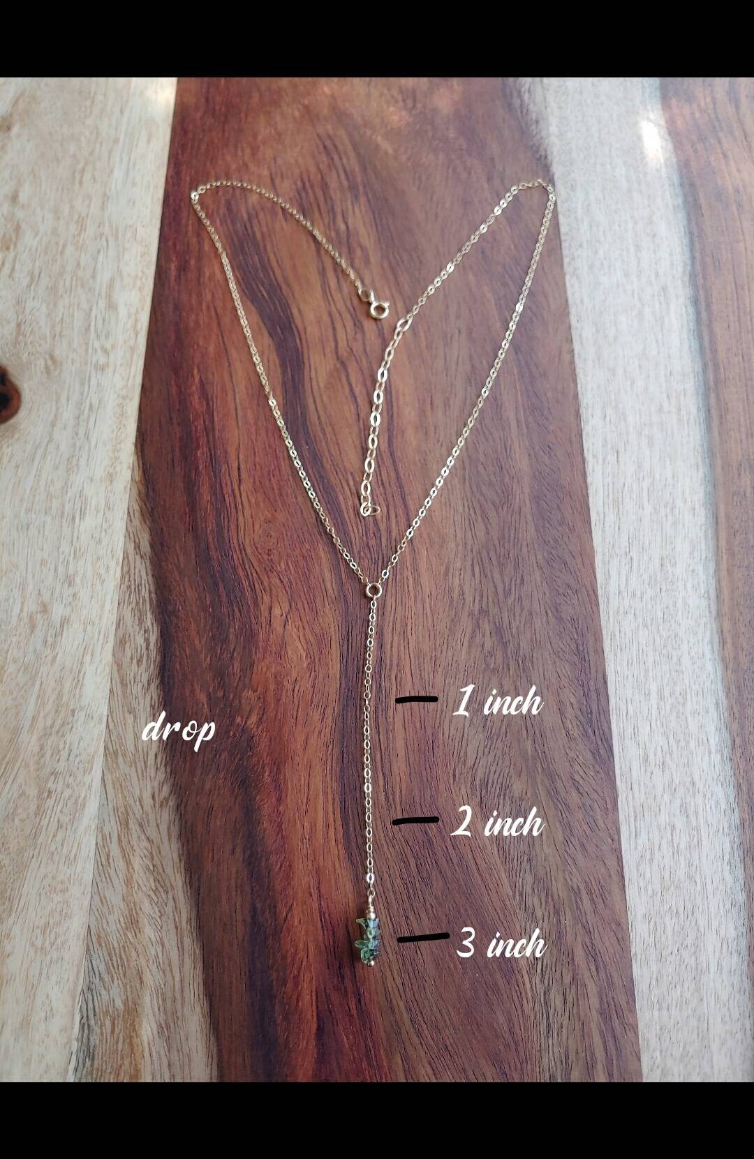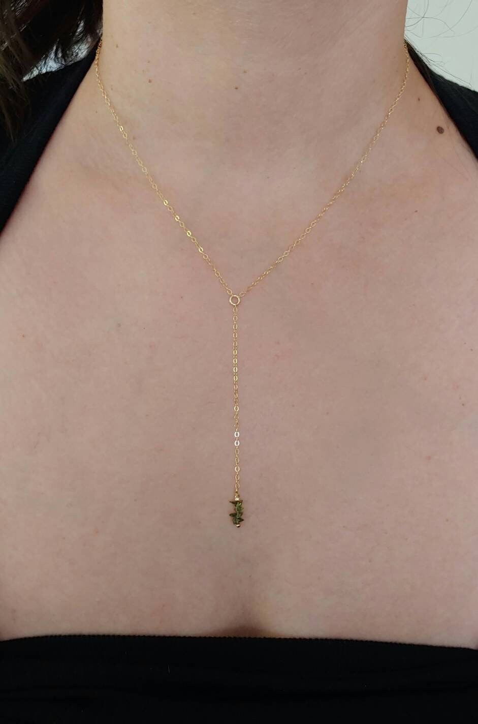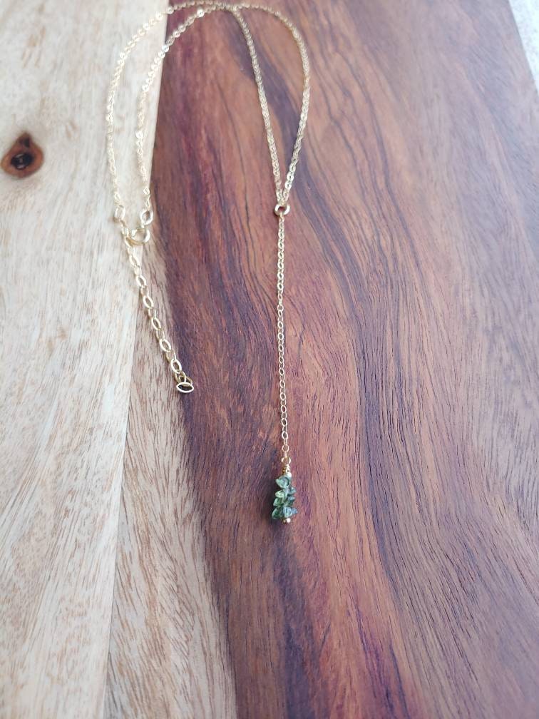 Smooth tumbled chipped lariat "Y" Moldavite necklace in gold filled, rose gold and Sterling silver. REAL moldavite gemstones handmade with love.