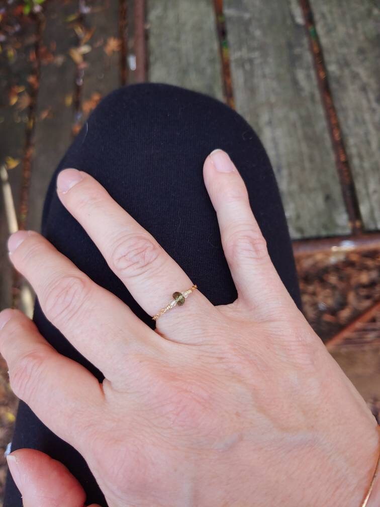 Sweet and dainty moldavite and phenakite ring. Available in gold, rose gold, or Sterling silver. Genuine moldavite gemstone.