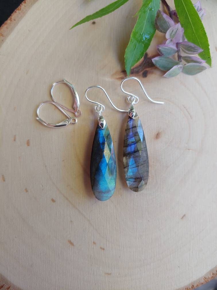 Teardrop shaped labradorite earrings comes in sterling silver and are faceted. Vibrant opalescent hues of labradorite is demure yet bold at the same time.
