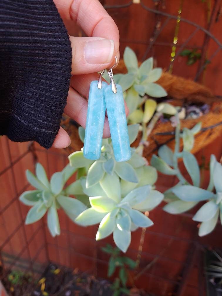 These unique rectangle amazonite earrings dangle approximately 2.5 inches from earlobe. These have wonderful baby blue hues that shows the quality of these gemstones. ❤️