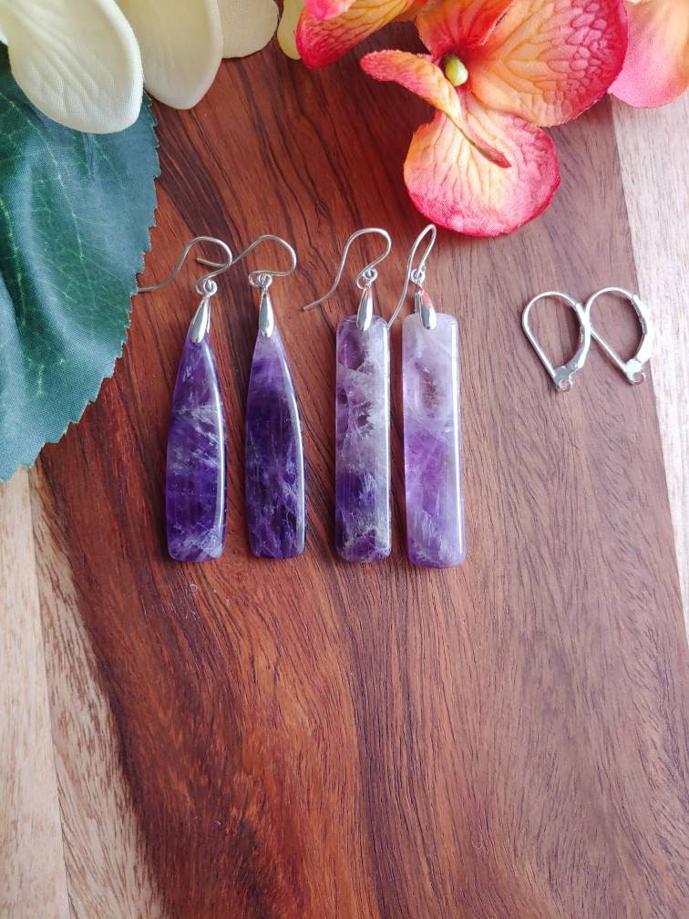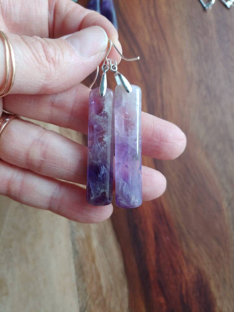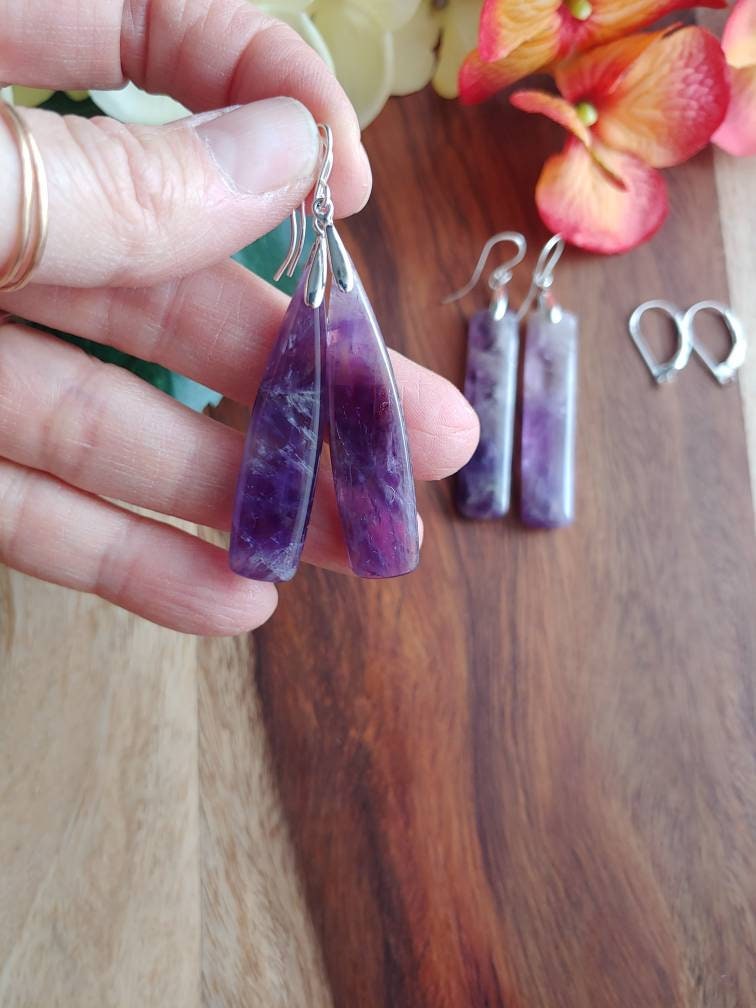 Beautiful amethyst earrings dangle approximately 2.5 inches from earlobe. These have wonderful purple hues that shows the quality of these gemstones.
