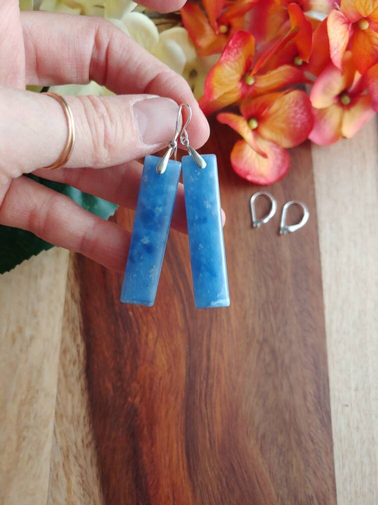 Sterling silver blue onyx earrings. Beautiful blue onyx earrings have a touch of periwinkle hues in them.