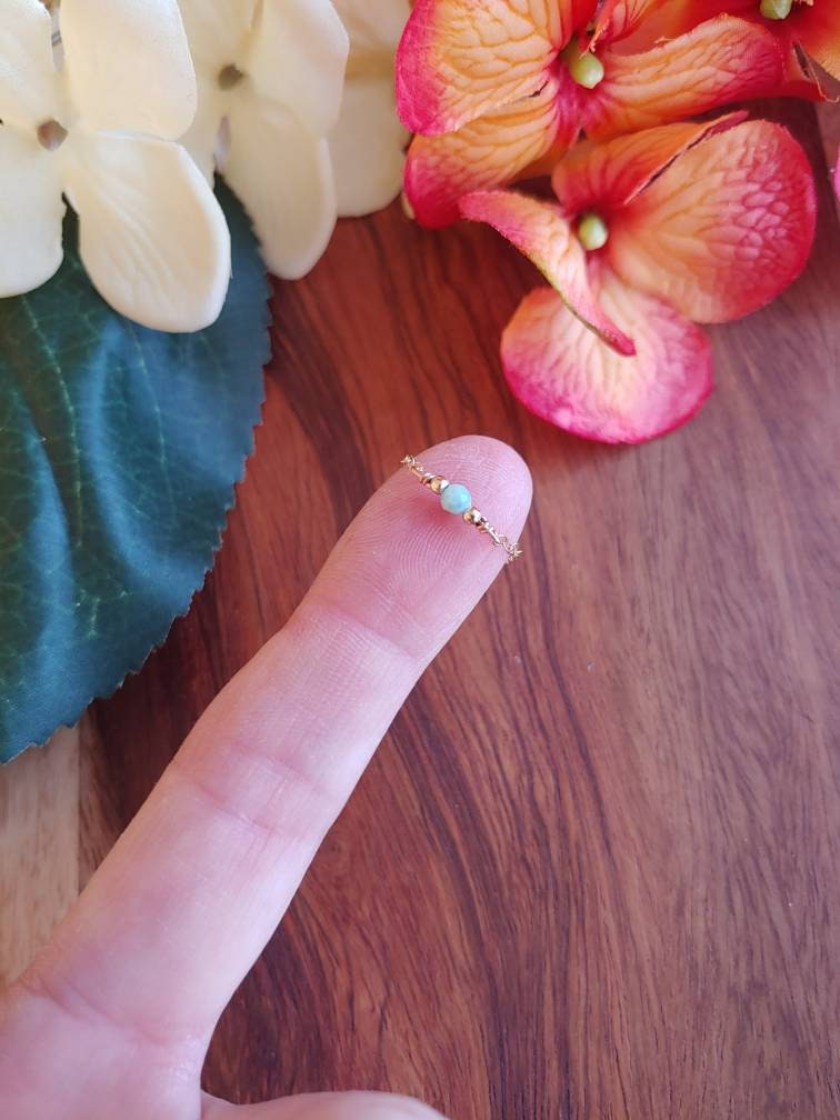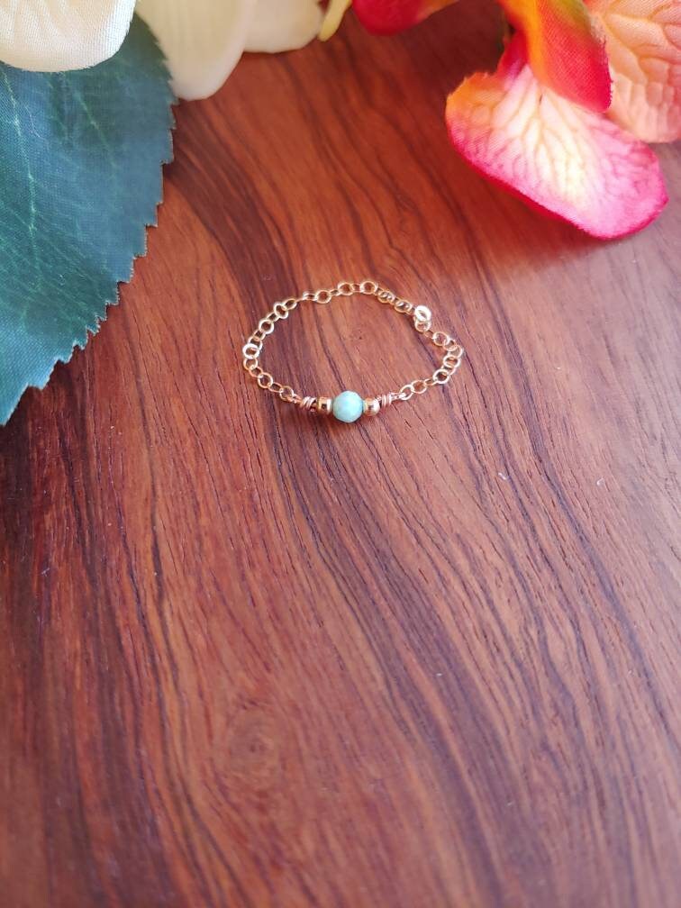 Sweet and charming baby blue larimar chain ring. Available in gold filled, rose gold, and Sterling silver. Great dainty midi ring. Hand wired with love! Gemstone is approx 2-3mm with 2mm beads. Sweet and charming!