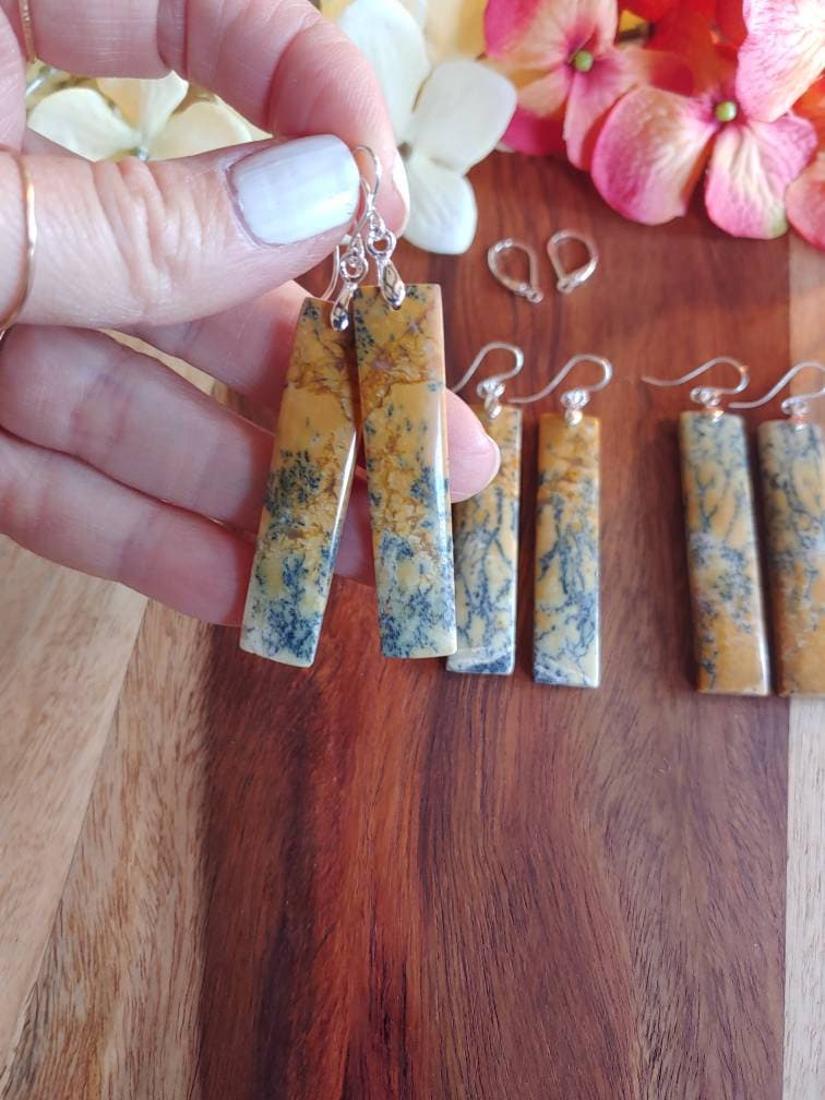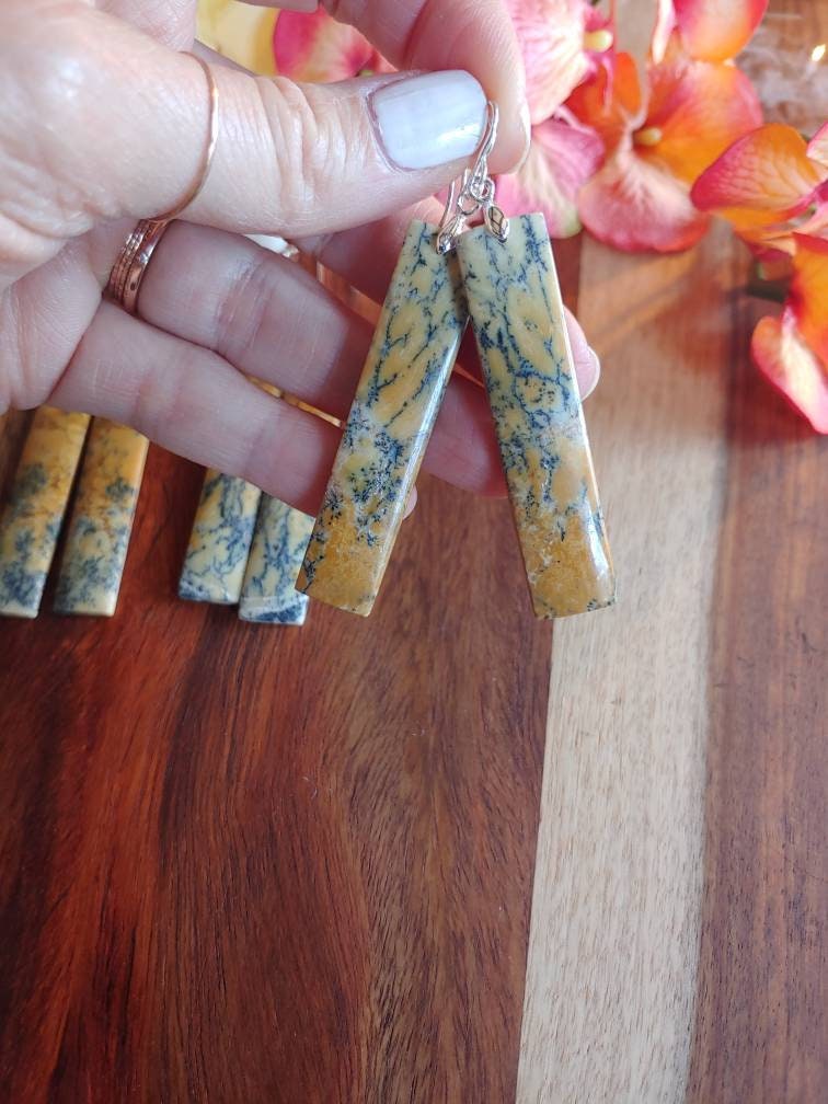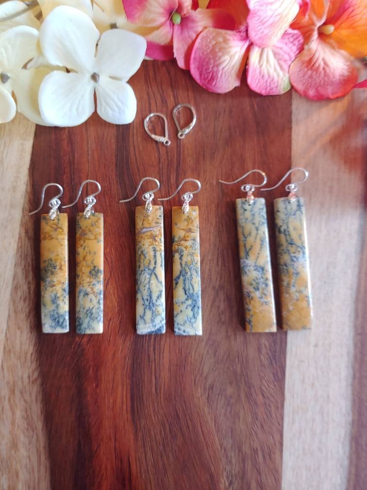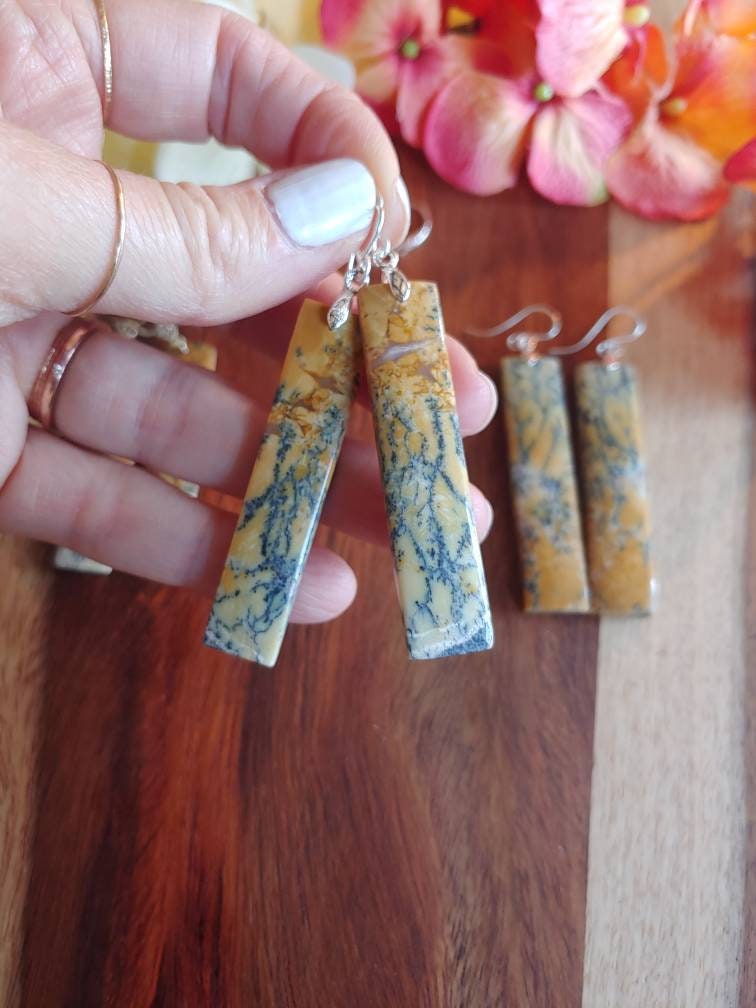 Unique opal earrings. These dangle approx 3 inches from earlobe. Yellow Dendrite opal earrings.