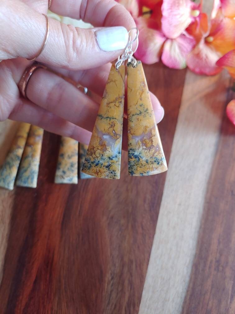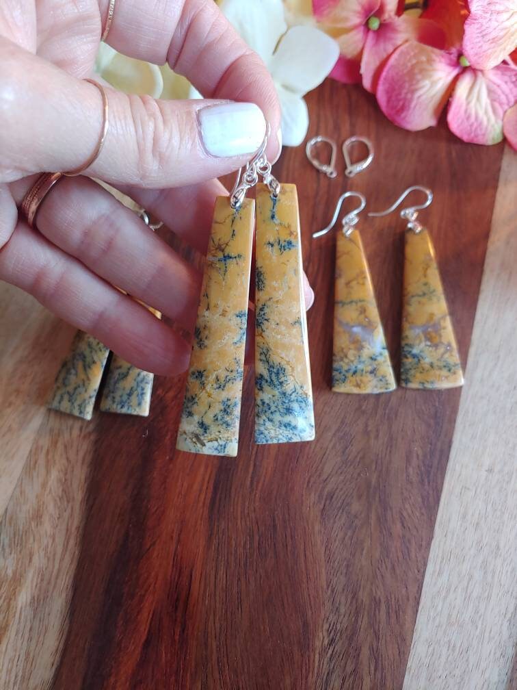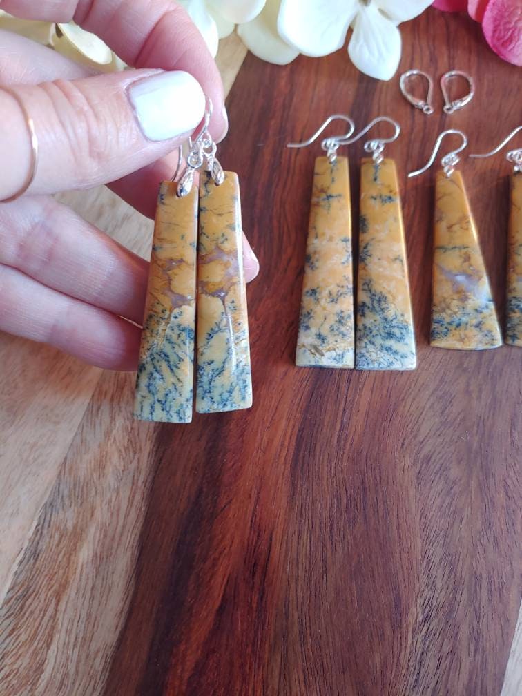 Unique opal earrings. These dangle approx 3 inches from earlobe. Yellow Dendrite opal earrings.