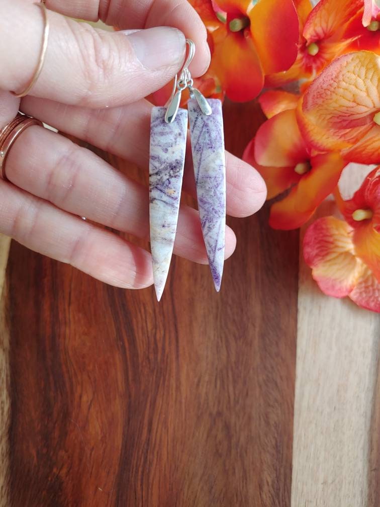 These beauties have the sweetest purple hues and have multiple purple colors throughout. These dangle approximately 2 inches from earlobe. ❤️