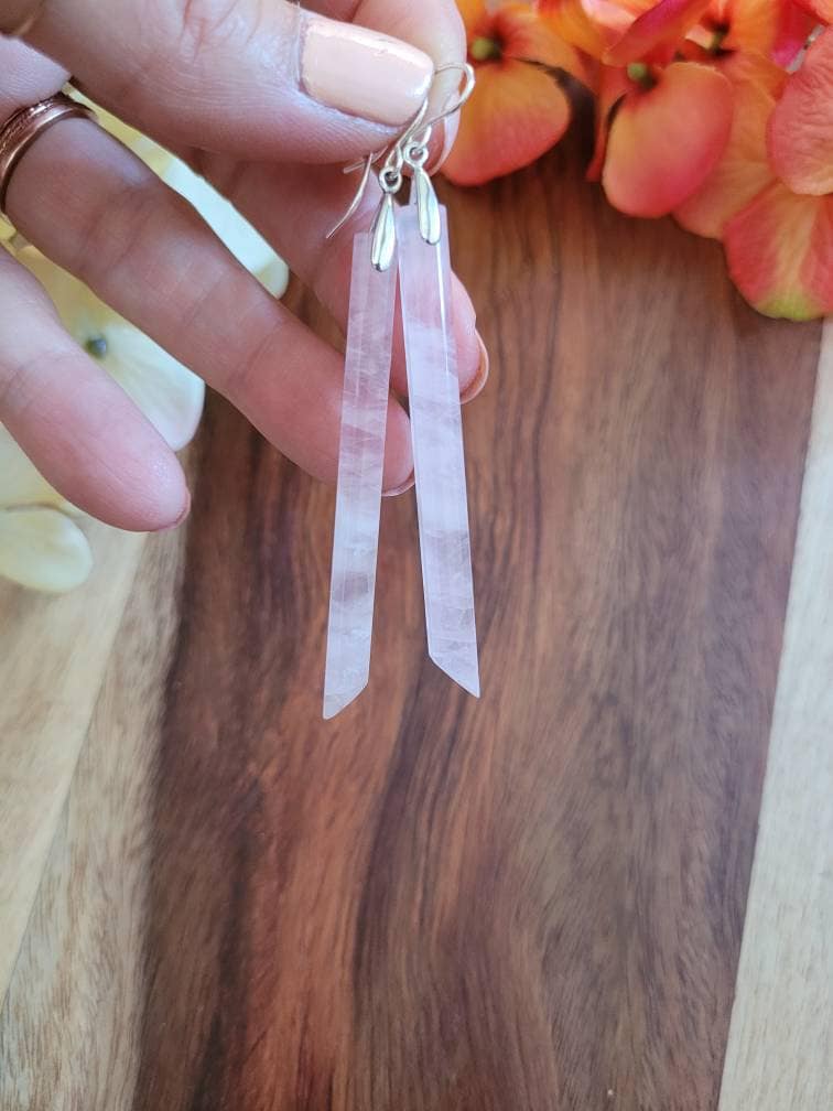 Long dangle drop rose quartz earrings. Available in Sterling silver only.