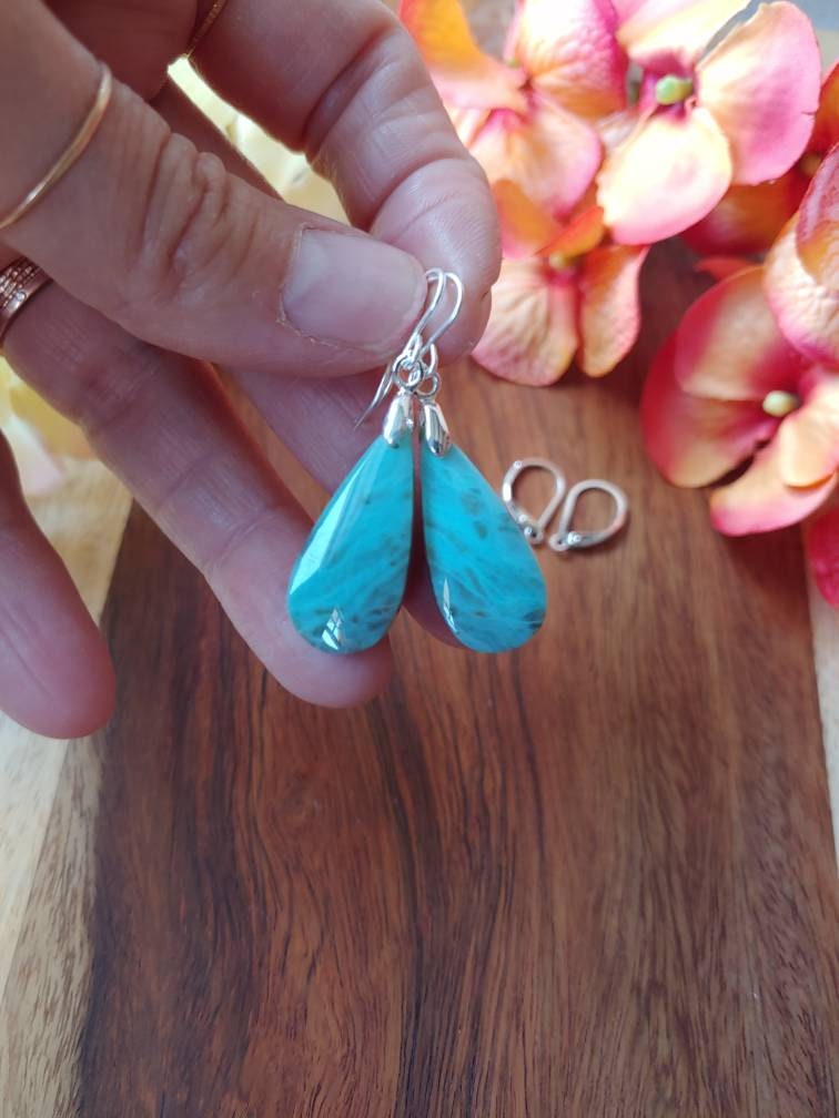 Unique blue opalized wood gemstone earrings. These beauties dangle approx 1 inch from earlobe.