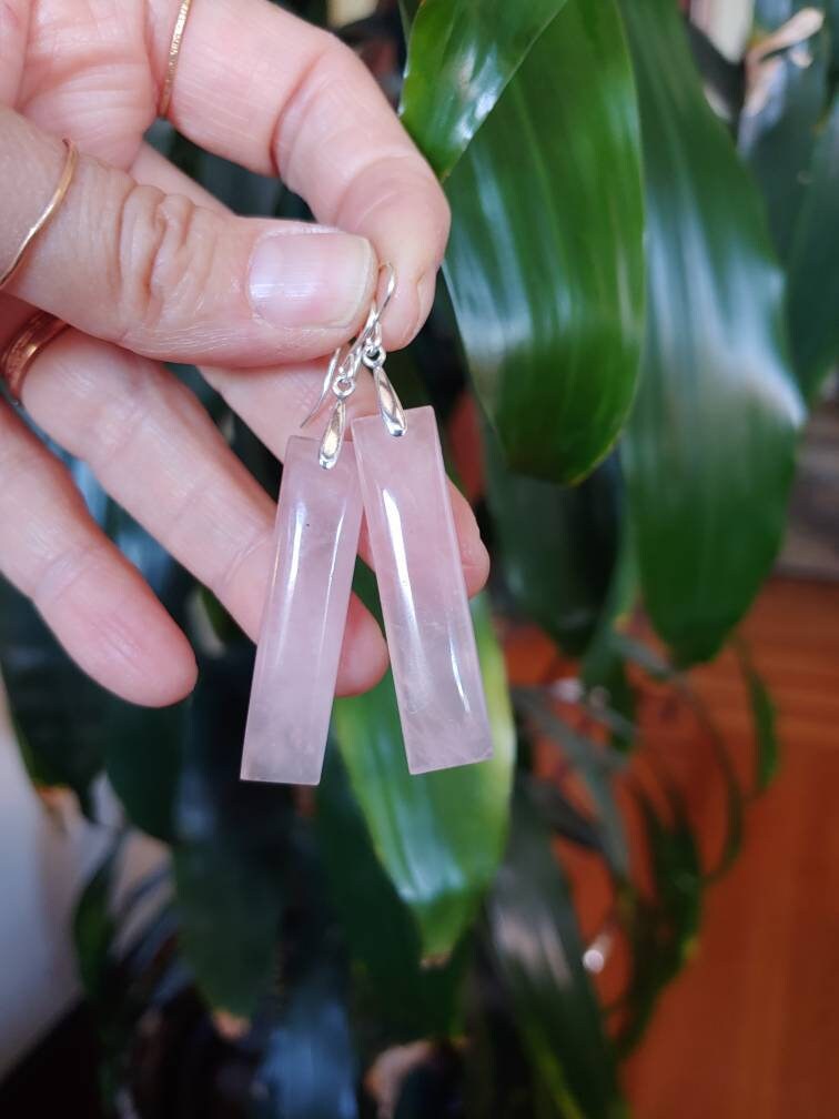 Long rose quartz earrings. Available in Sterling silver only.