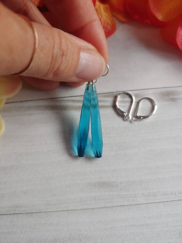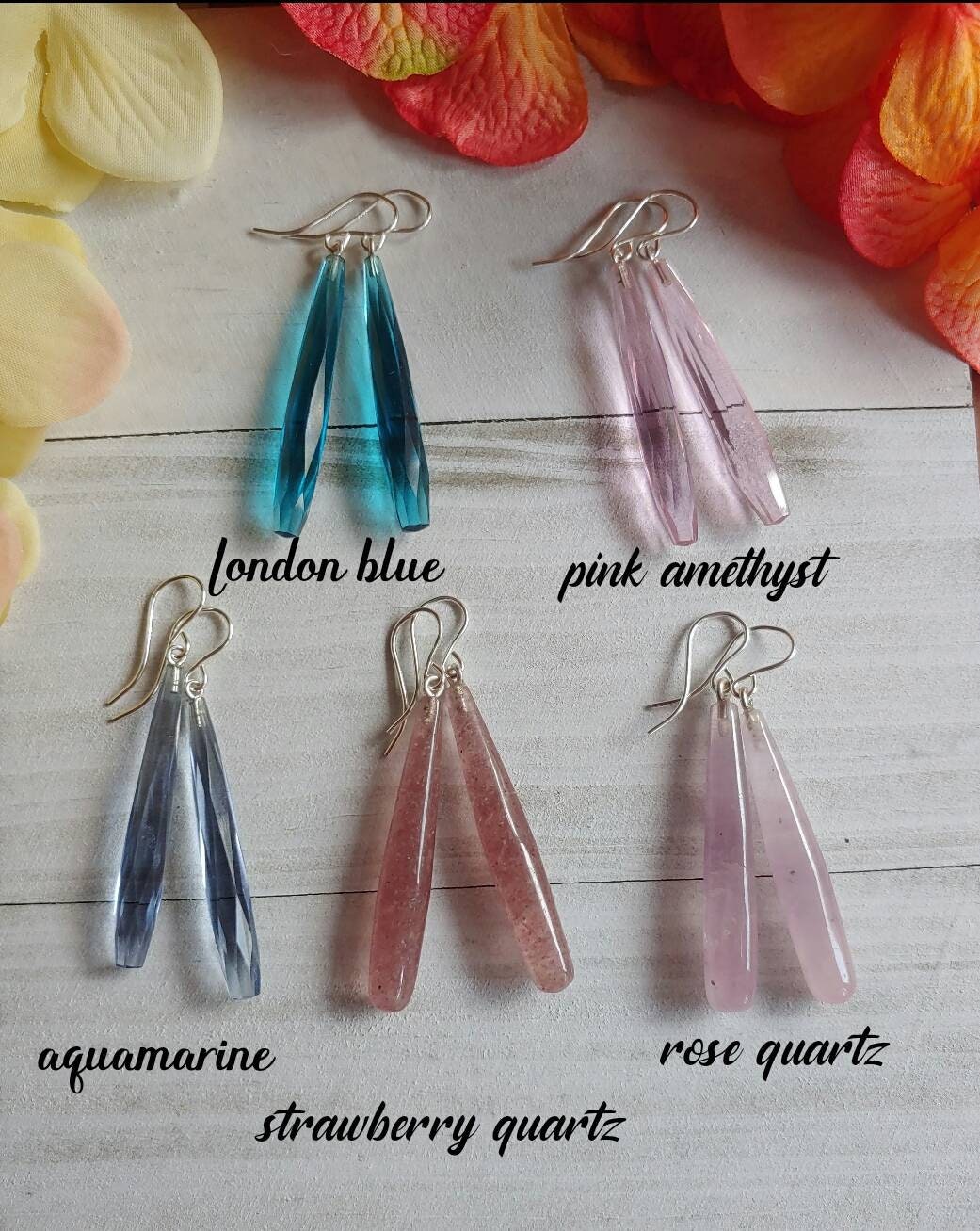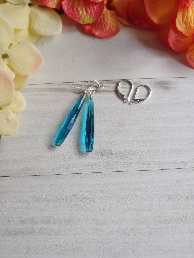 Unique cut of London blue topaz quartz earrings. Beautiful color of vibrant blue in a long teardrop.