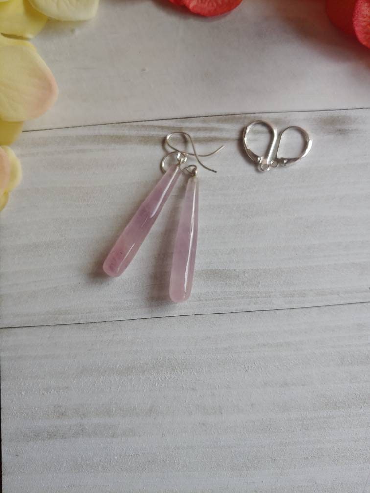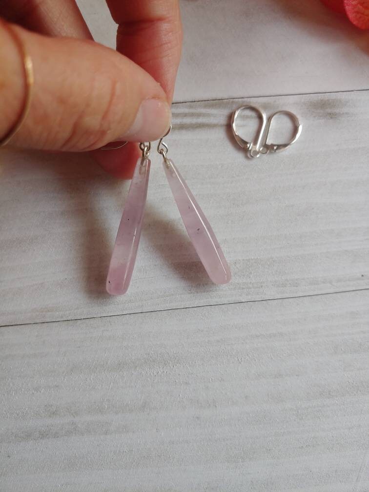 Smooth cut of pink rose quartz earrings. Beautiful color of light pink in a long teardrop.