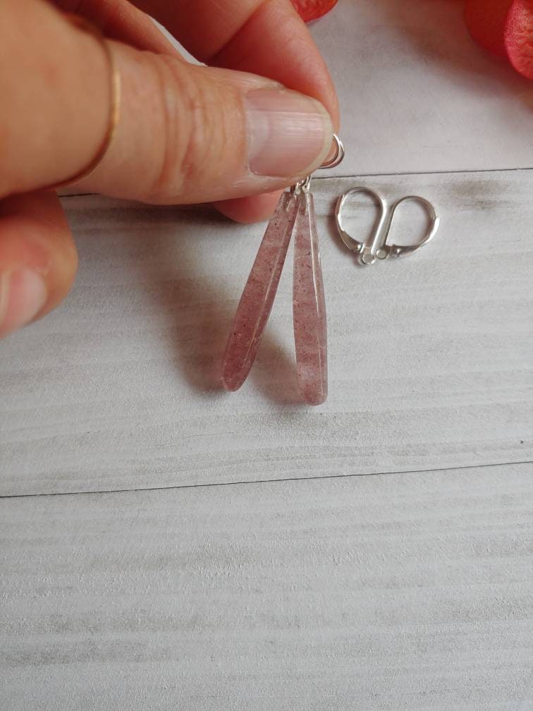 Unique smooth cut of pink strawberry quartz earrings. Real strawberry quartz gemstone in a long teardrop. Available in sterling silver only