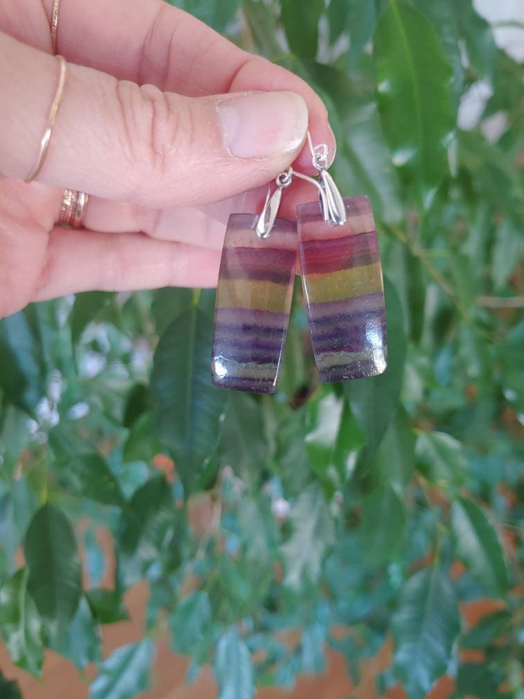 Rectangle fluorite natural gemstone earrings. Avail in sterling silver only