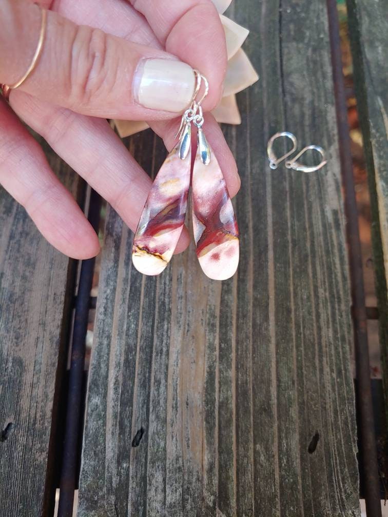 These mookaite jasper earrings are truly stunning. These dangle approximately 1.5 inches from earlobe.