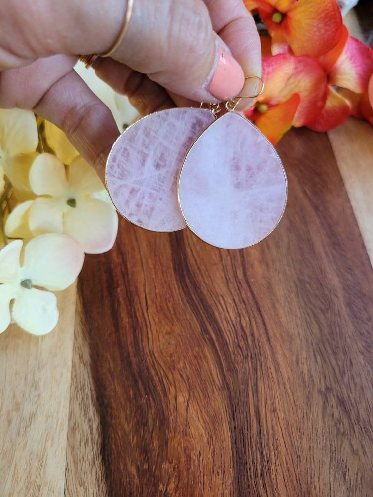 Dangle approx 2 inches from earlobe. These are smooth teardrop rose quartz gemstones