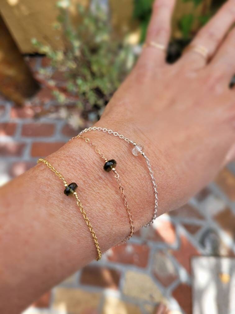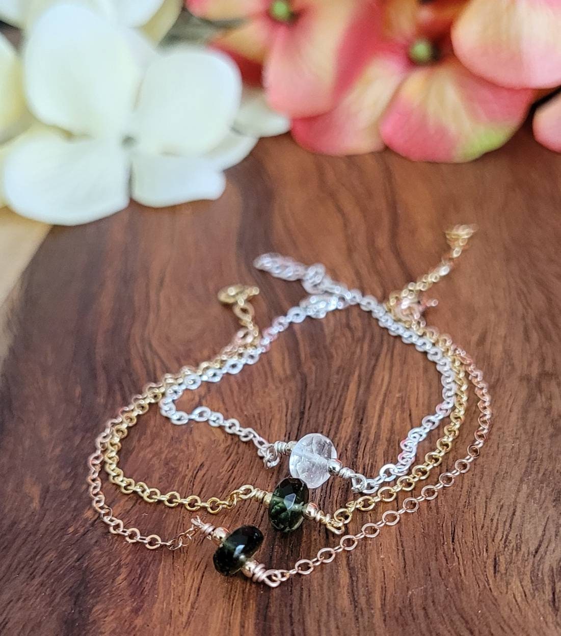 Genuine Moldavite bracelet in gold filled (GF), rose gold filled ( RGF) and Sterling silver (SS). 8mm rondelle faceted REAL moldavite gemstones hand wired with love. Libyan desert glass also available!