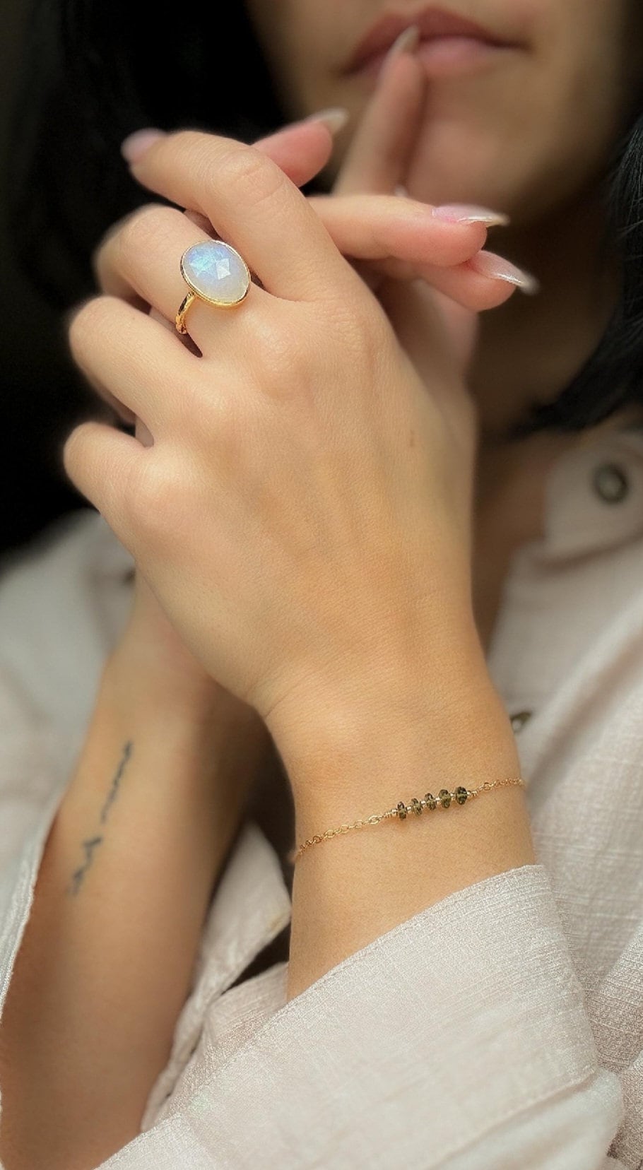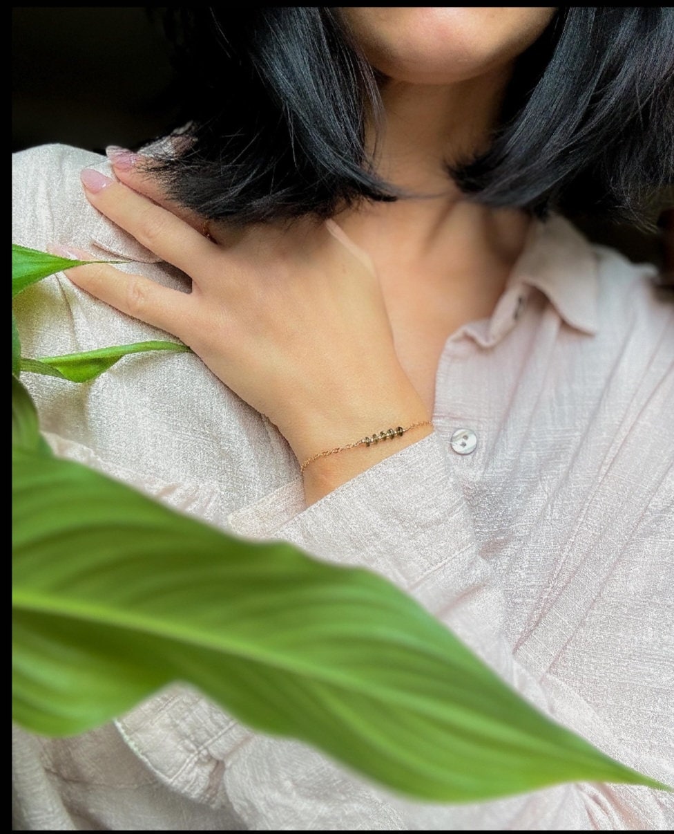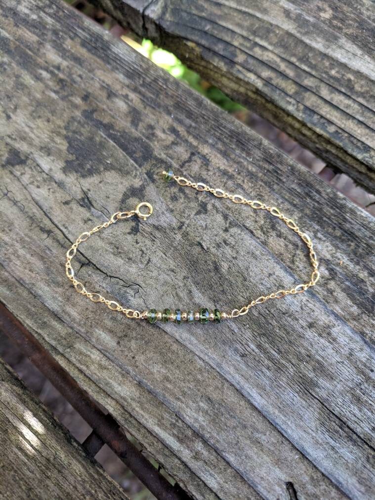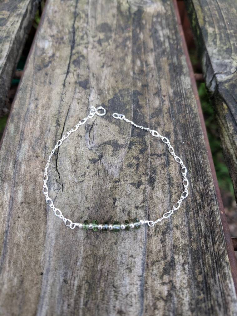 Dainty and unique moldavite bracelet (andlonger lemgths for anklet) comes in gold, rose gold or sterling silver. 3x4 mm faceted tektite gemstones with tiny beads between of your choice of metal. Delicate and dainty ankle bracelet.