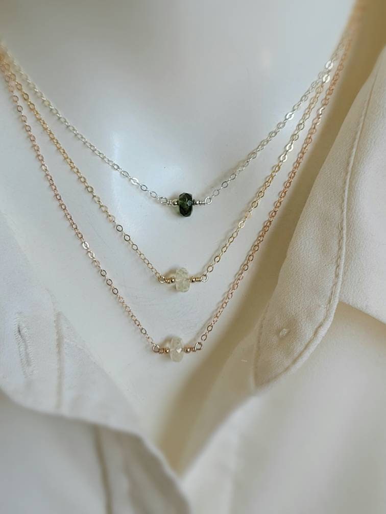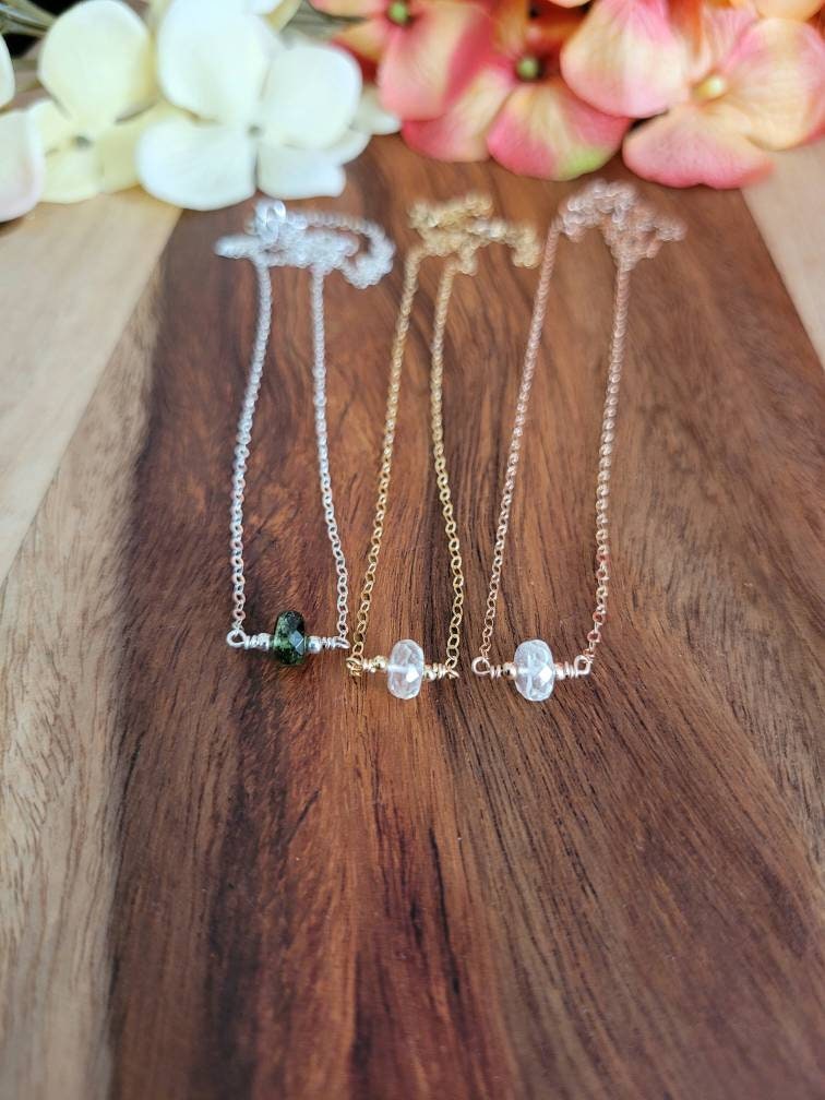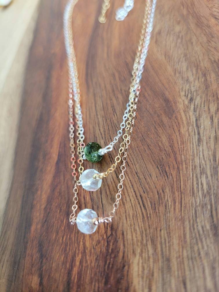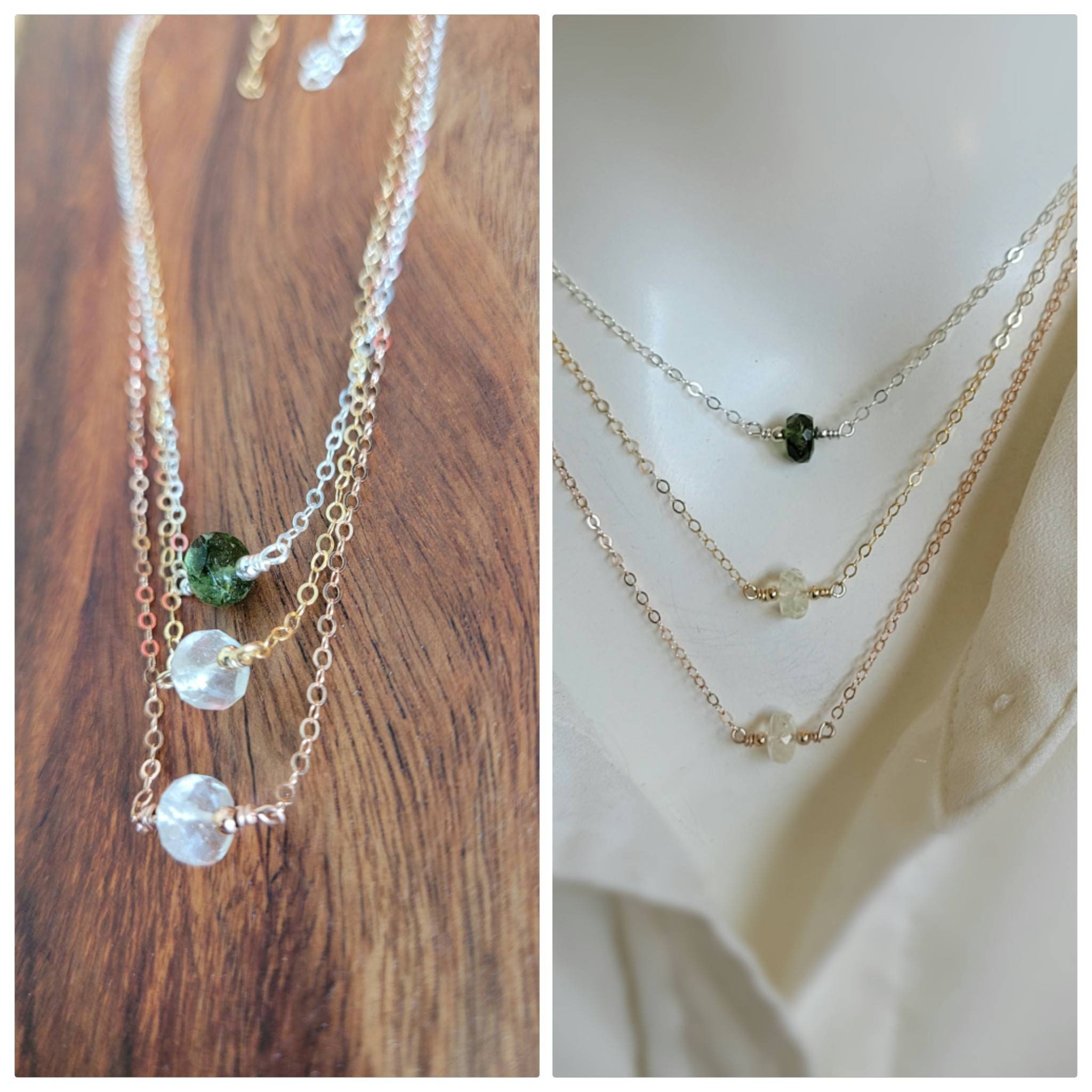 Genuine Moldavite necklace in gold filled (GF), rose gold filled ( RGF) and Sterling silver (SS). 8mm rondelle faceted REAL moldavite gemstones hand wired with love. Libyan desert glass also available!