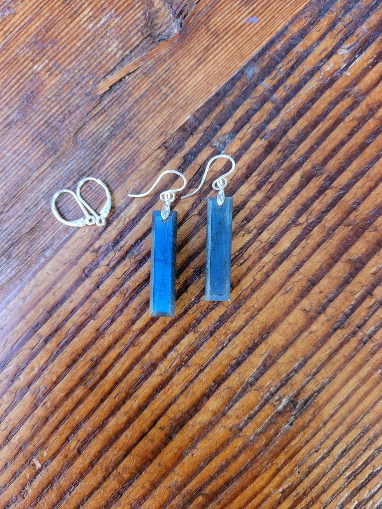 Labradorite gemstones dangle 1.5 inches from earlobe