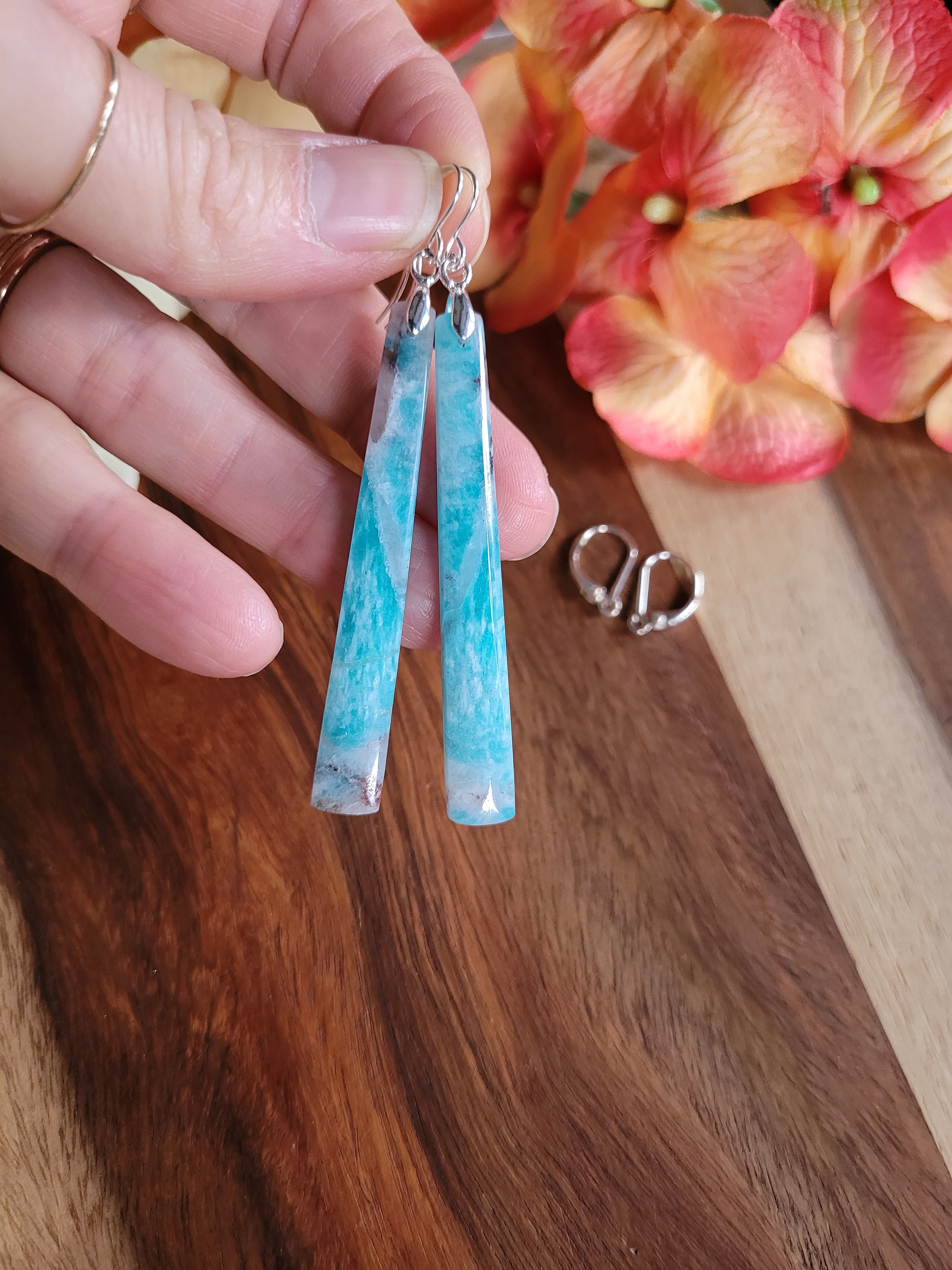 These unique stick amazonite earrings dangle approximately 3 inches from earlobe. These have wonderful baby blue hues that shows the quality of these gemstones. ❤️