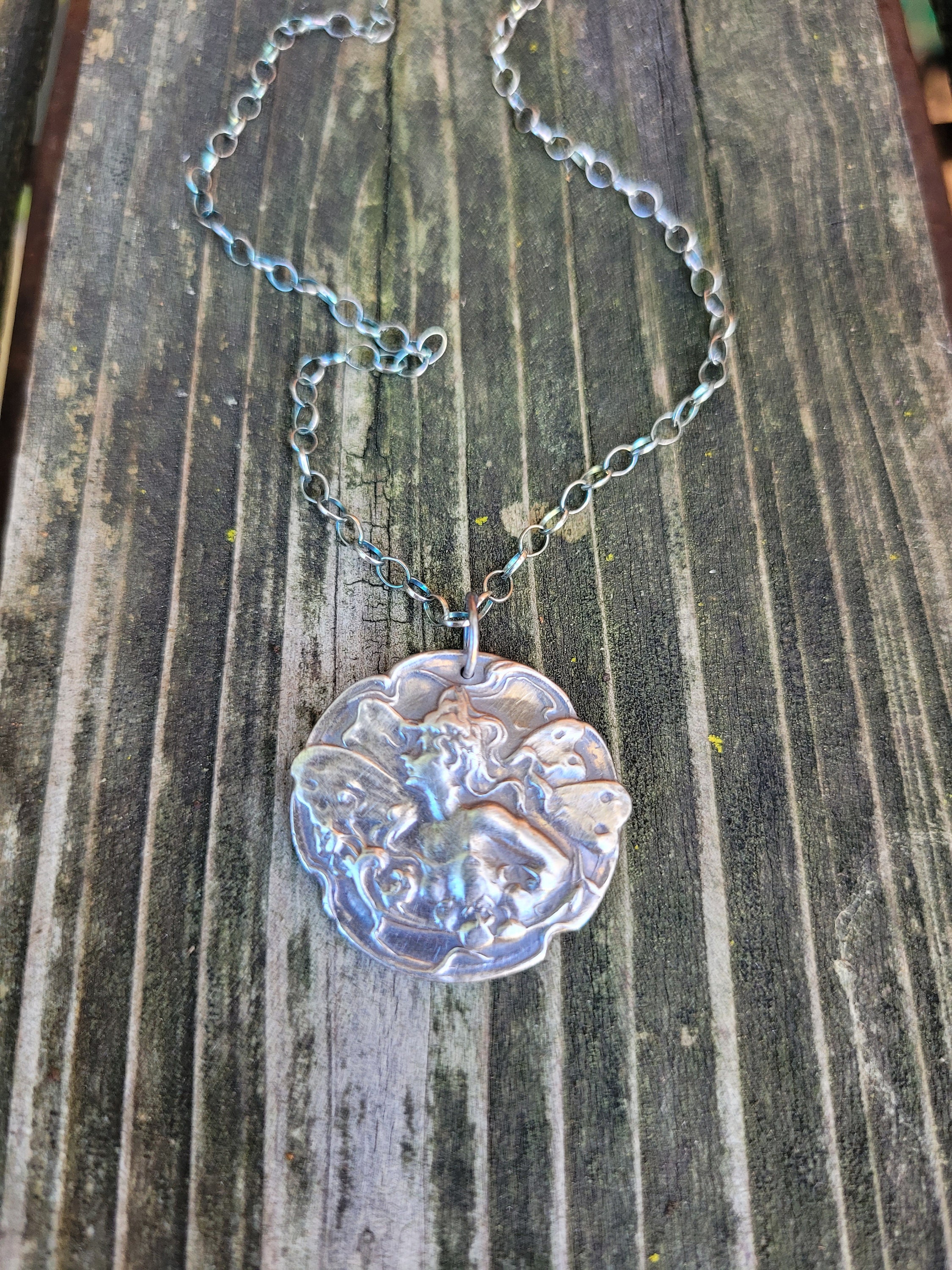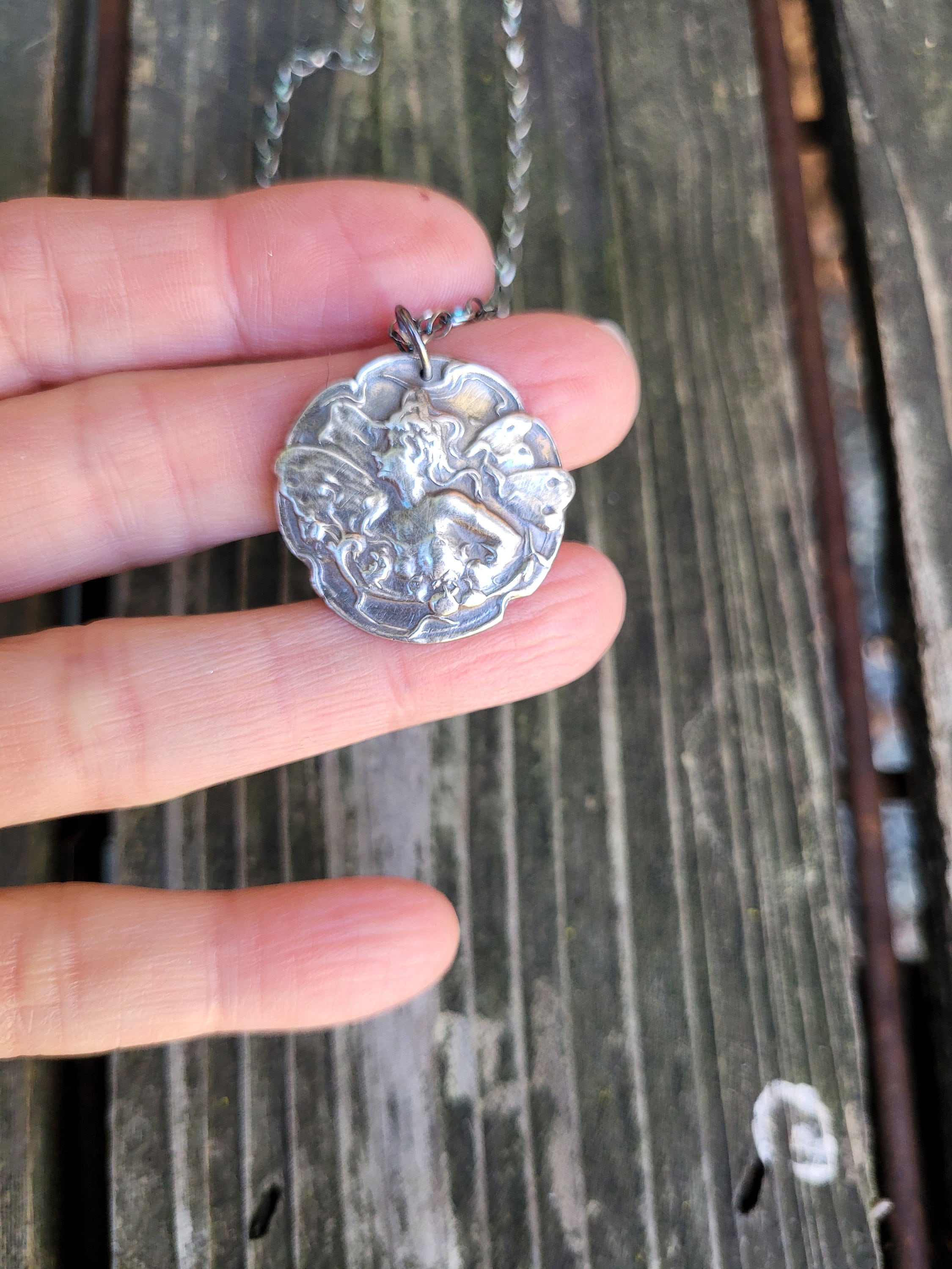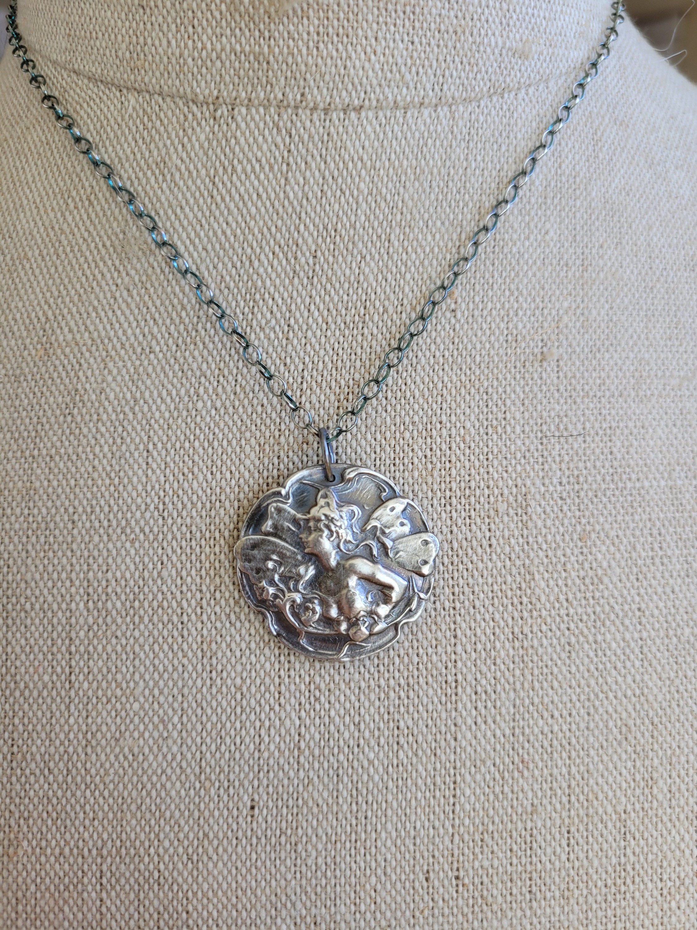 Art nouveau French fairy pendant necklace. She's whimsical and feminine and stunning! Her wings are delicately defined and this is a stunning piece!