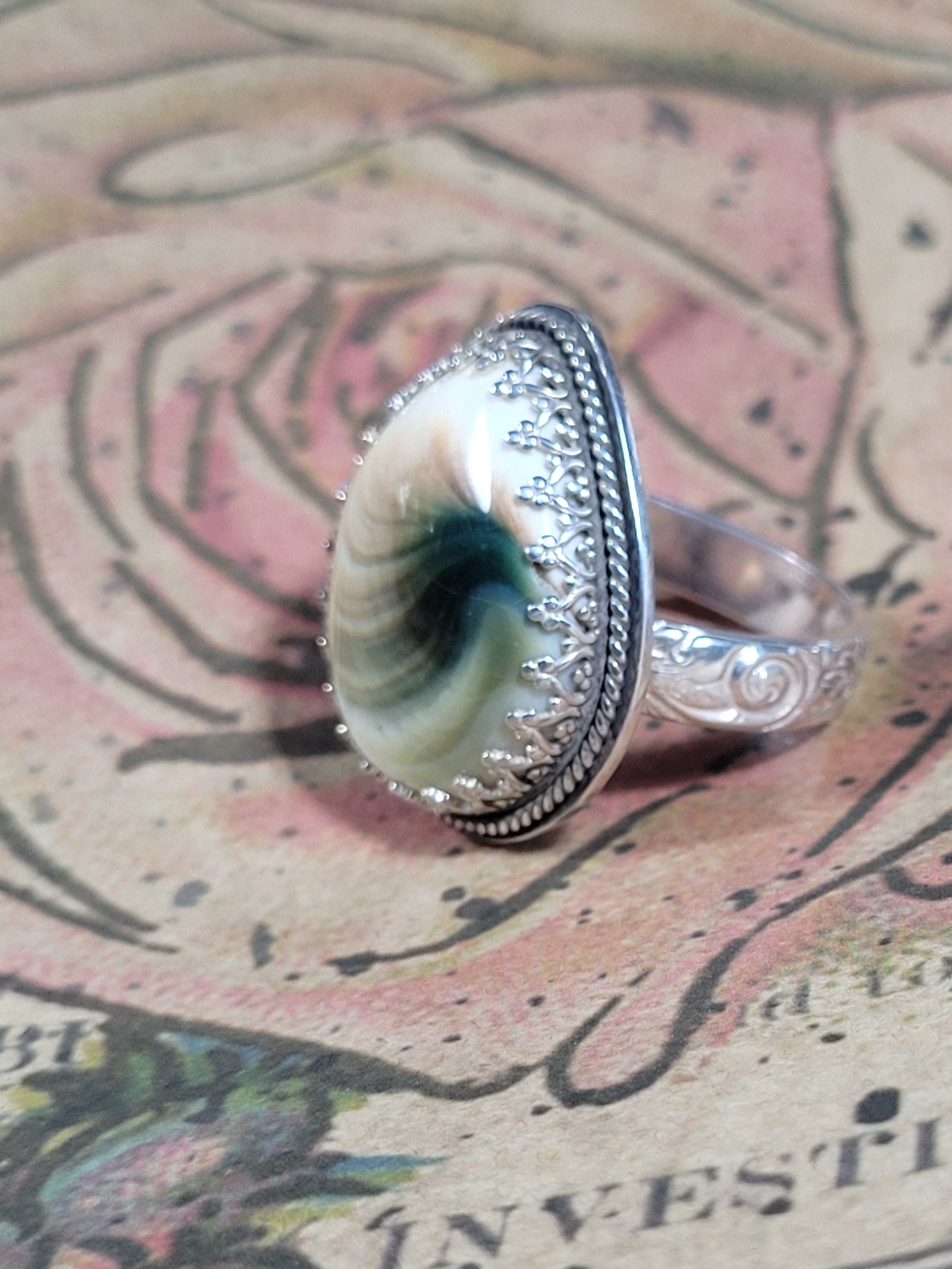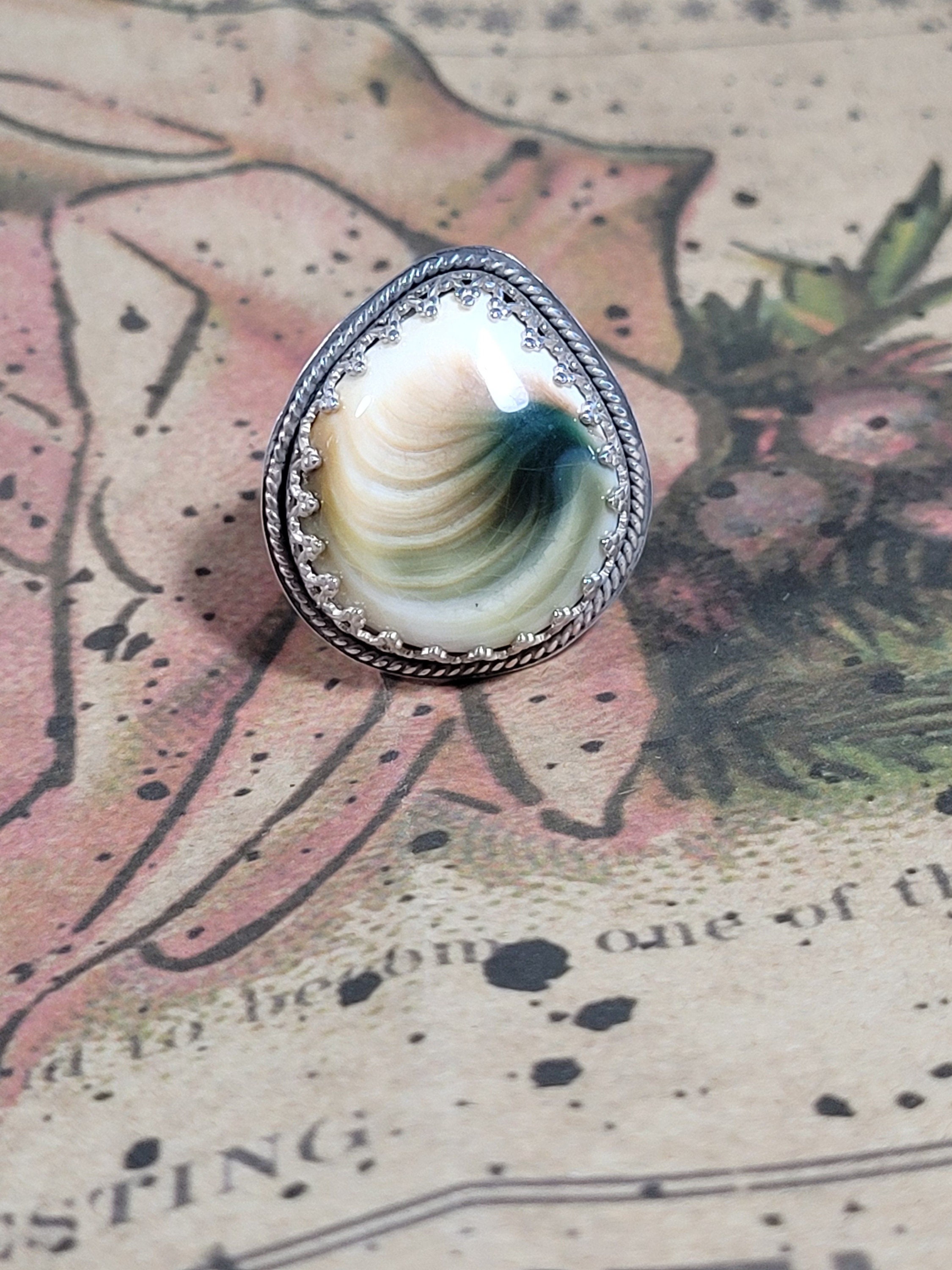 Natural shell ring. The colors are not enhanced. simply gorgeous!! size 11 and ready to ship