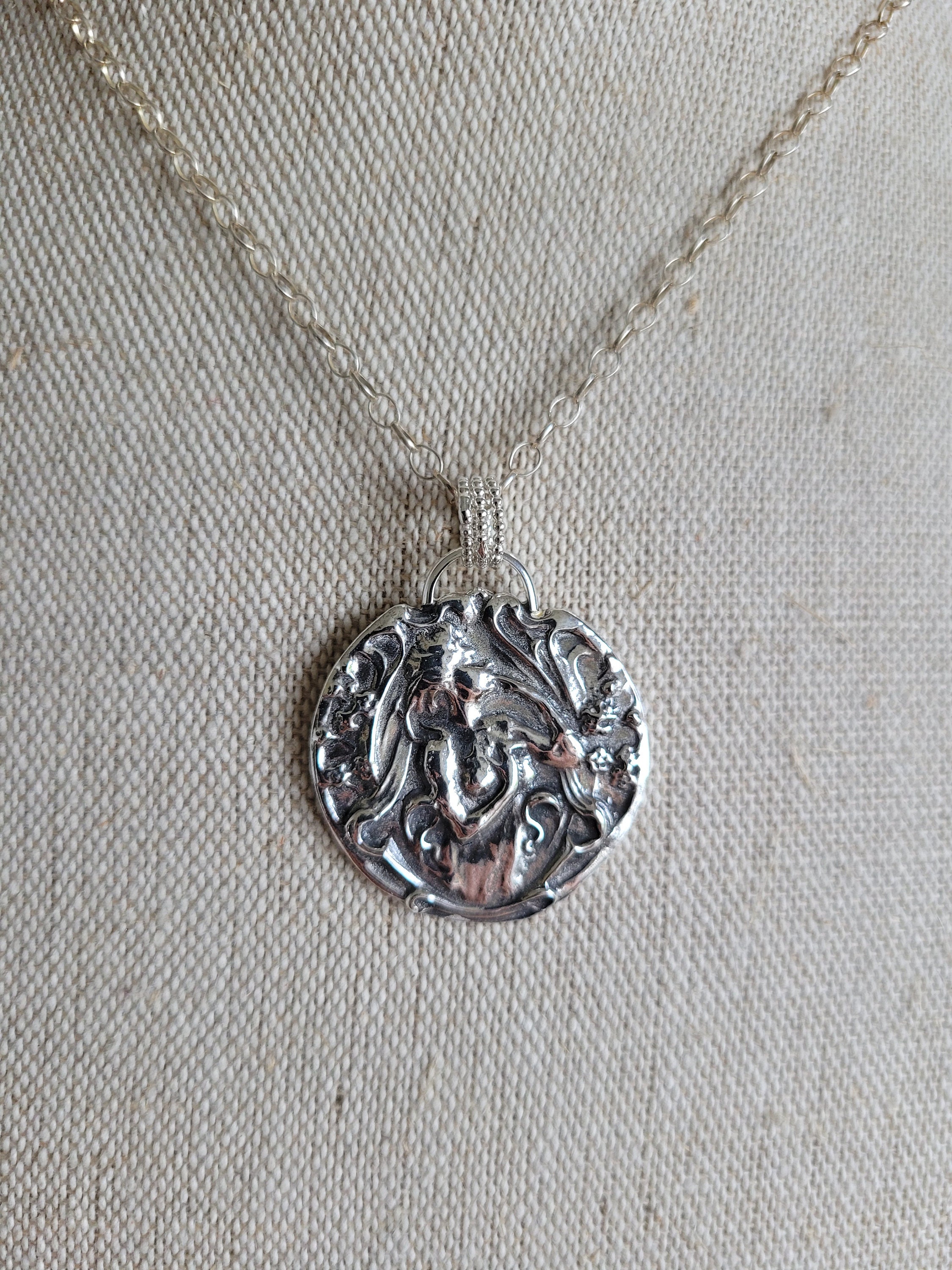 Your choice of "pendant only" or on 16/18 inch or 18/20 inch necklace. Comes with a 2 inch extension chain.