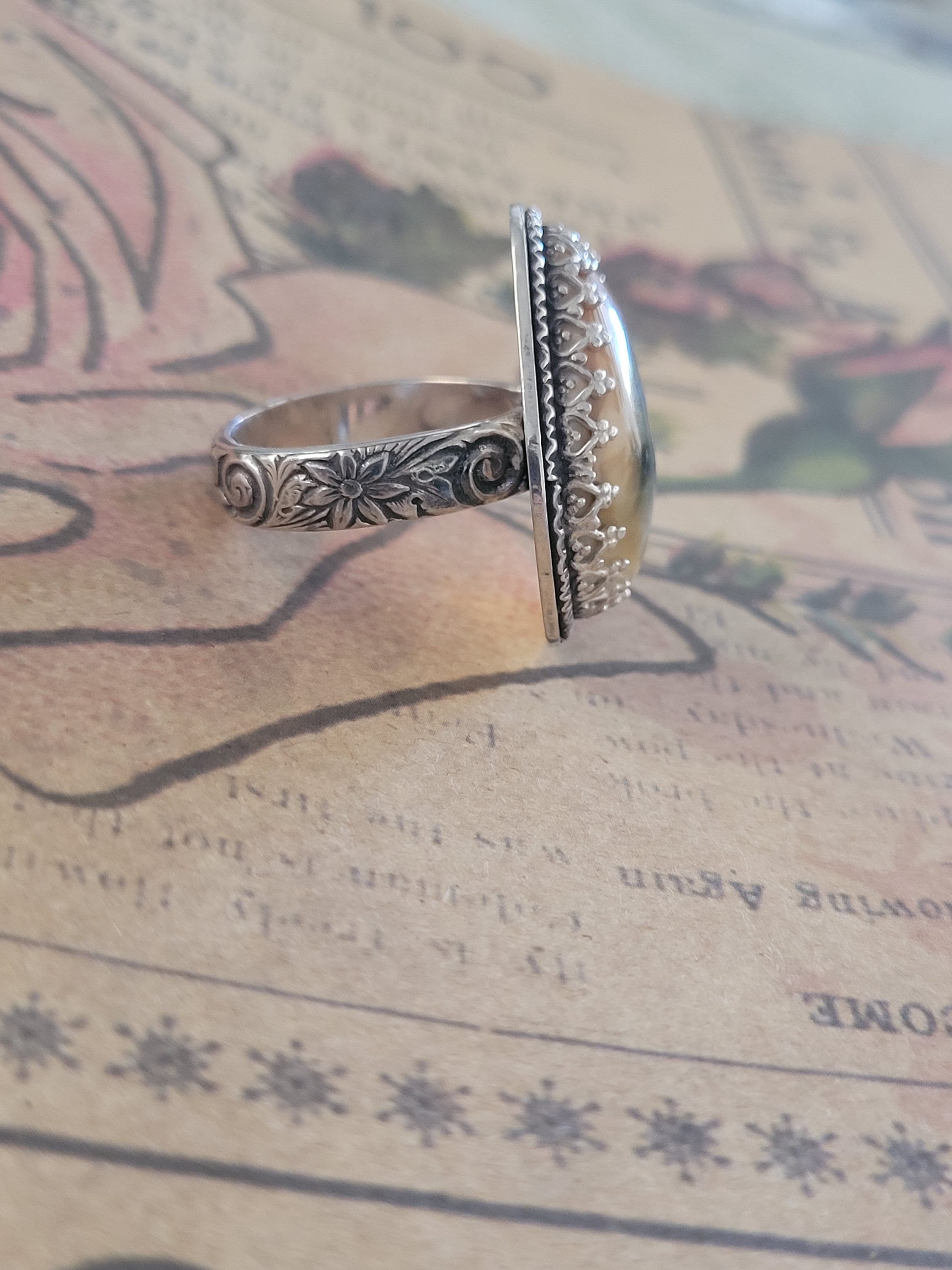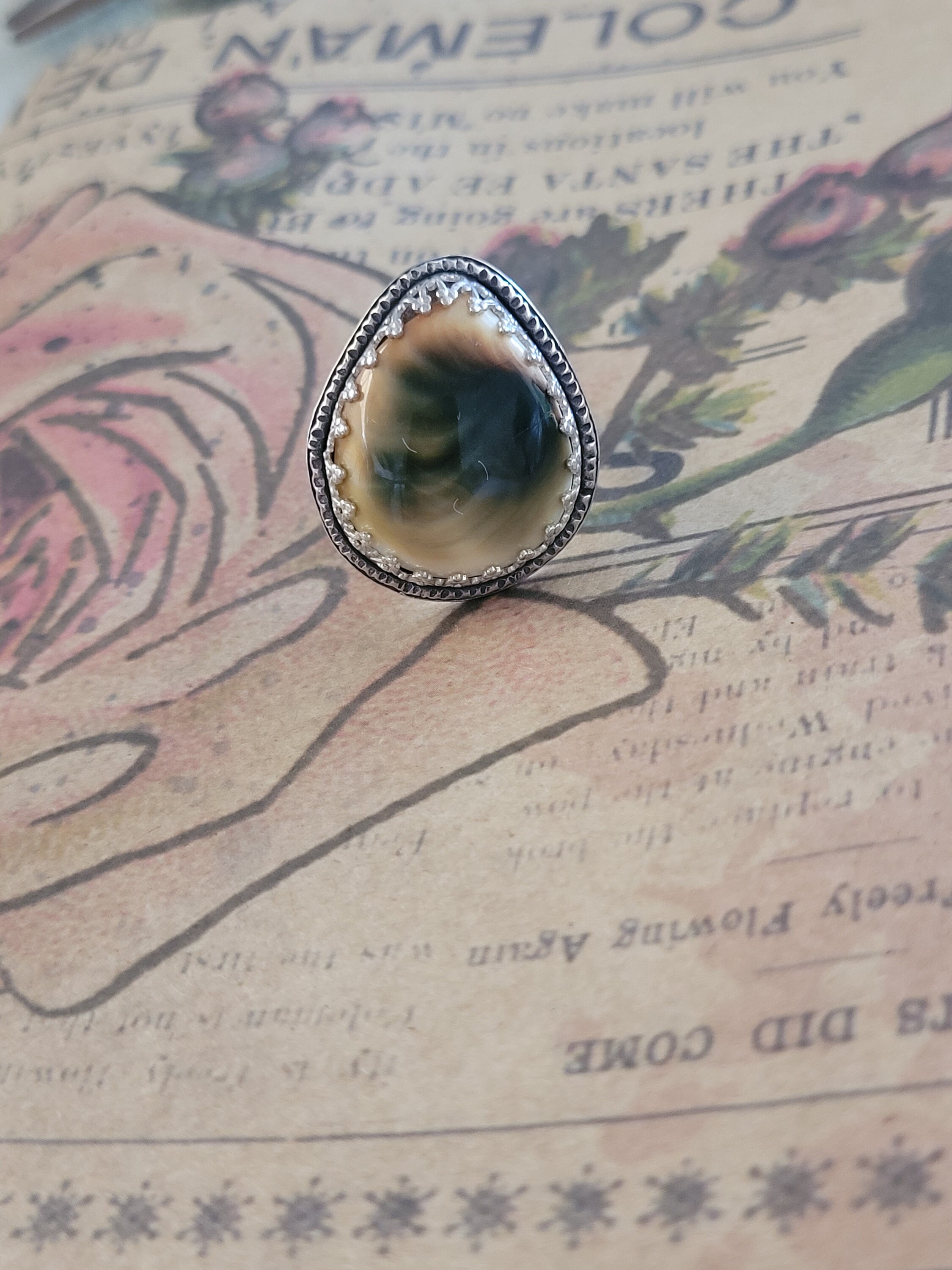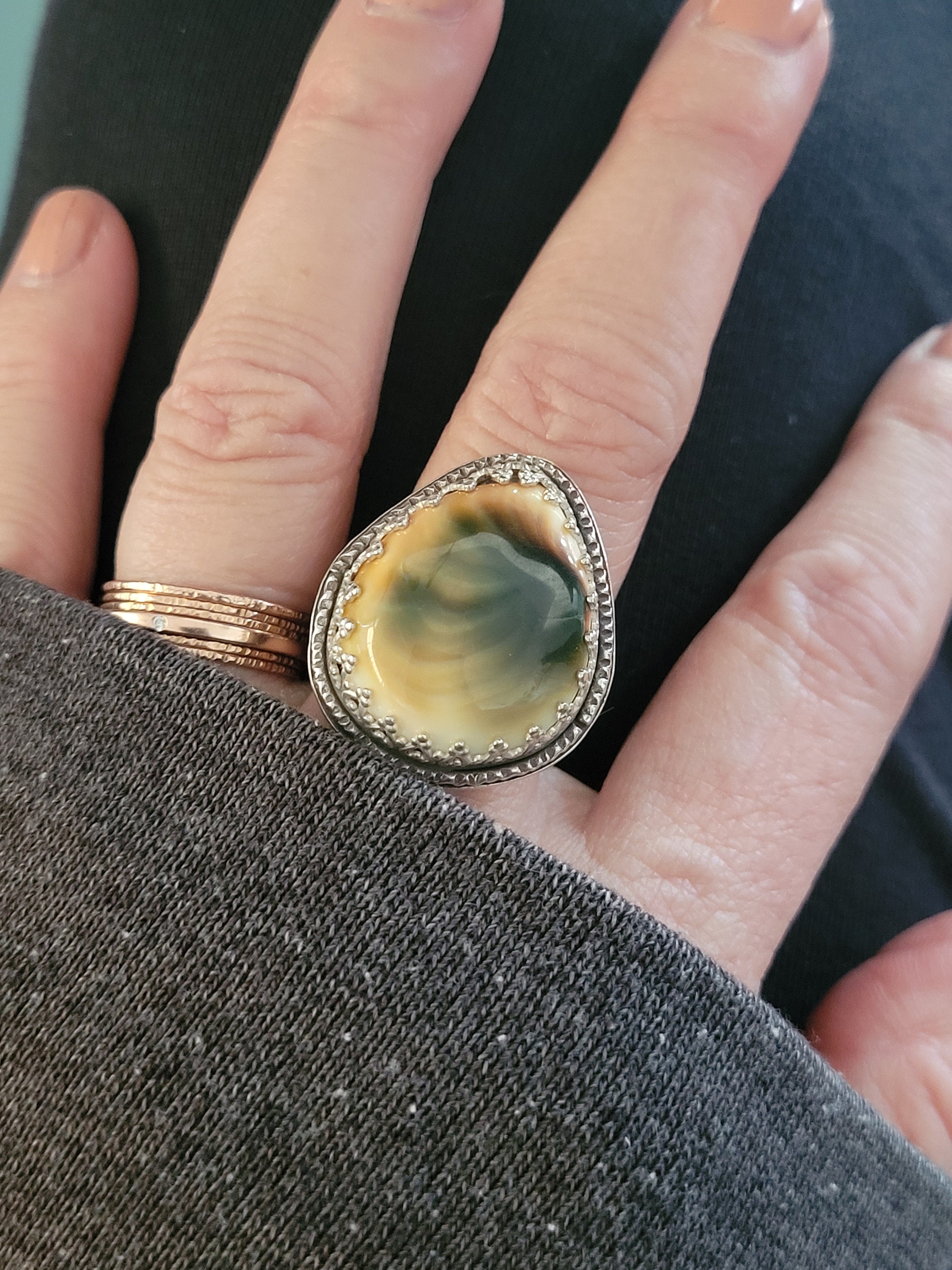 Natural shell ring. The colors are not enhanced. simply gorgeous!! size 8 and ready to ship