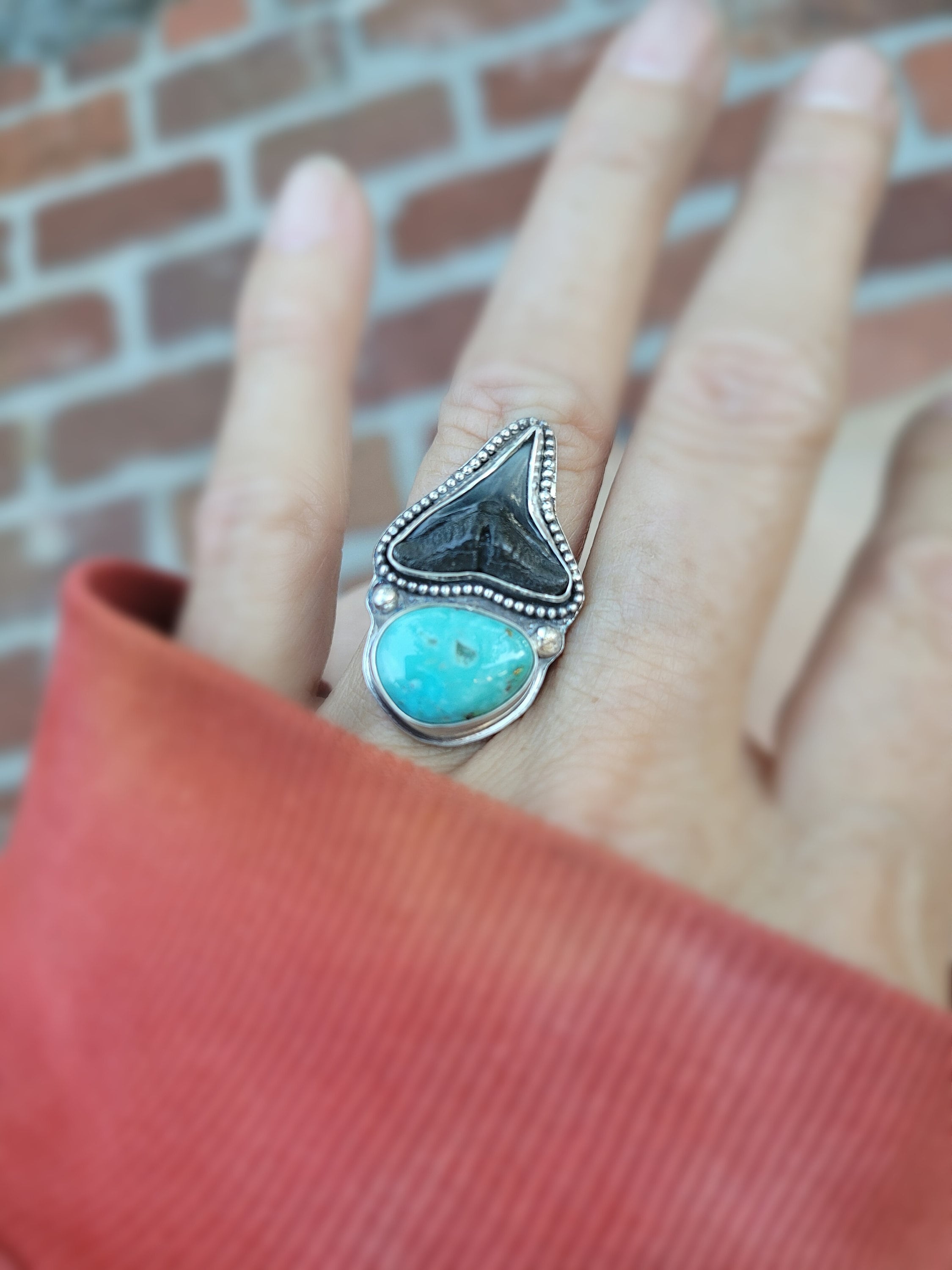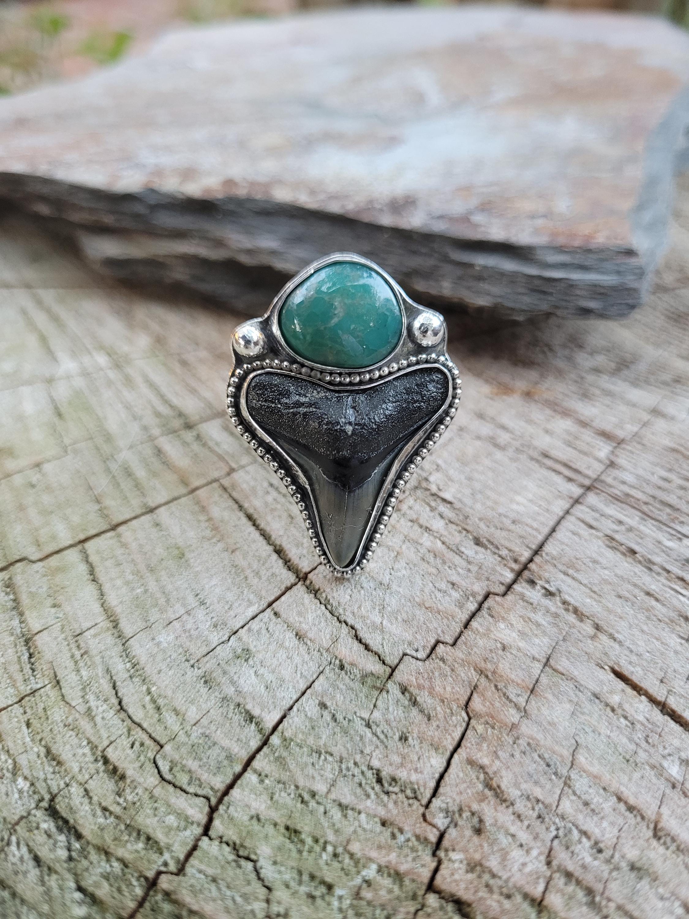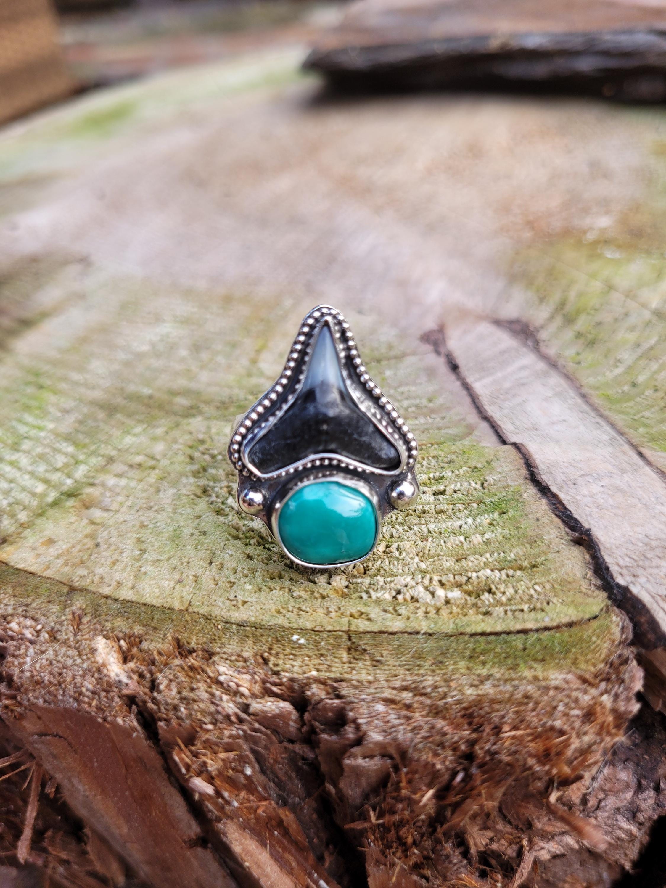 Ethically sourced shark tooth ring with gorgeous turquoise gemstone.