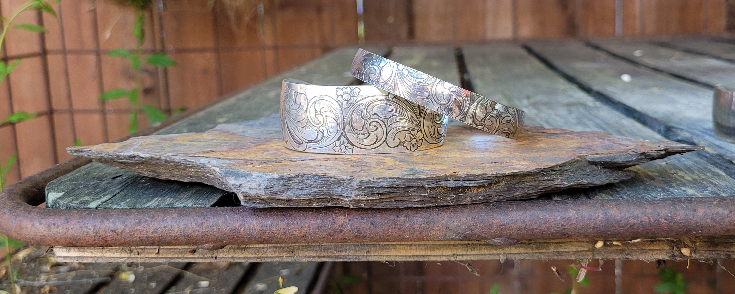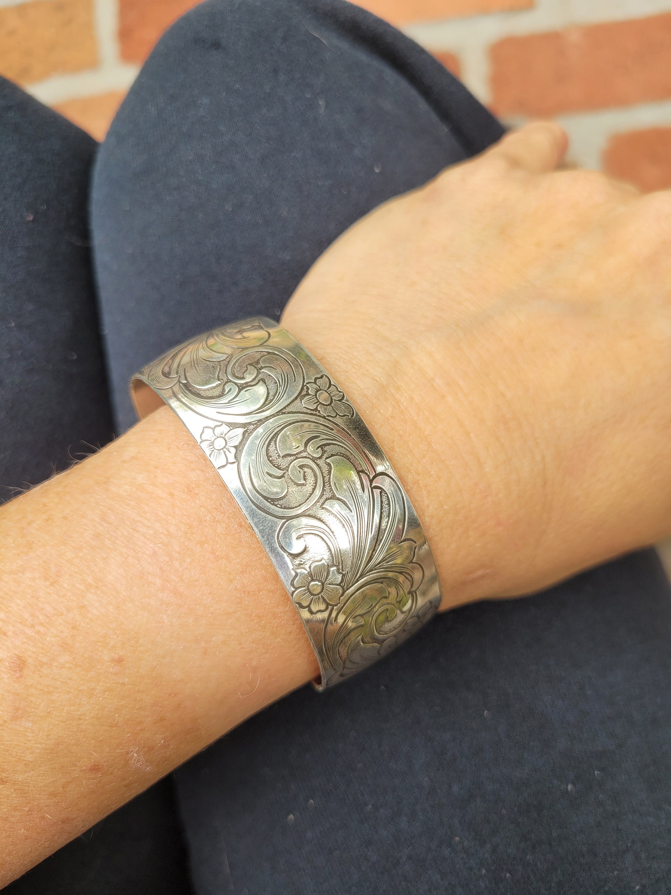 This stunning vintage pattern cuff bracelet speaks for itself. Gorgeous swirling flowing pattern wraps around the whole bracelet. I make these from an early design from late 1800's- early 1900's replica die.
