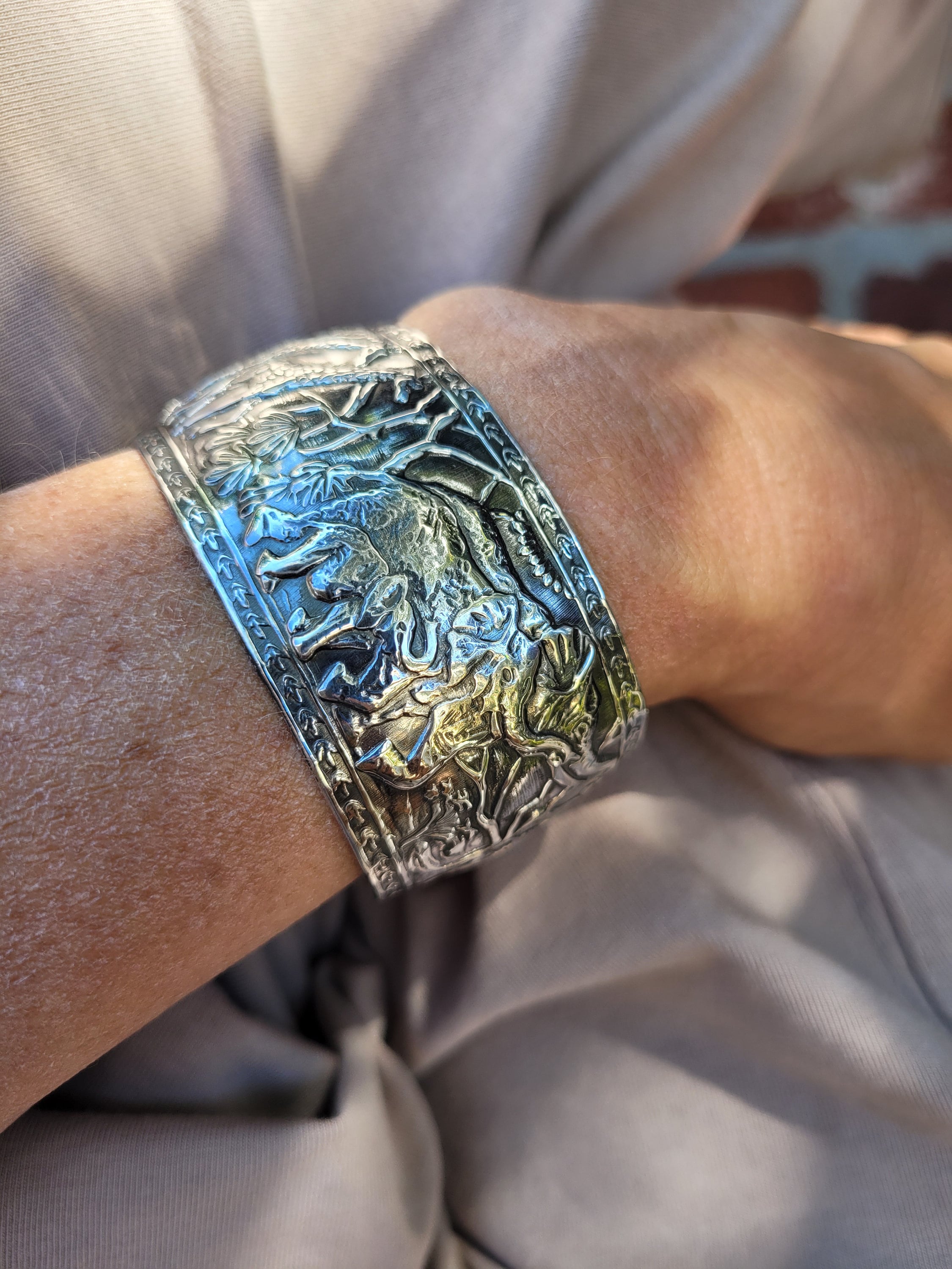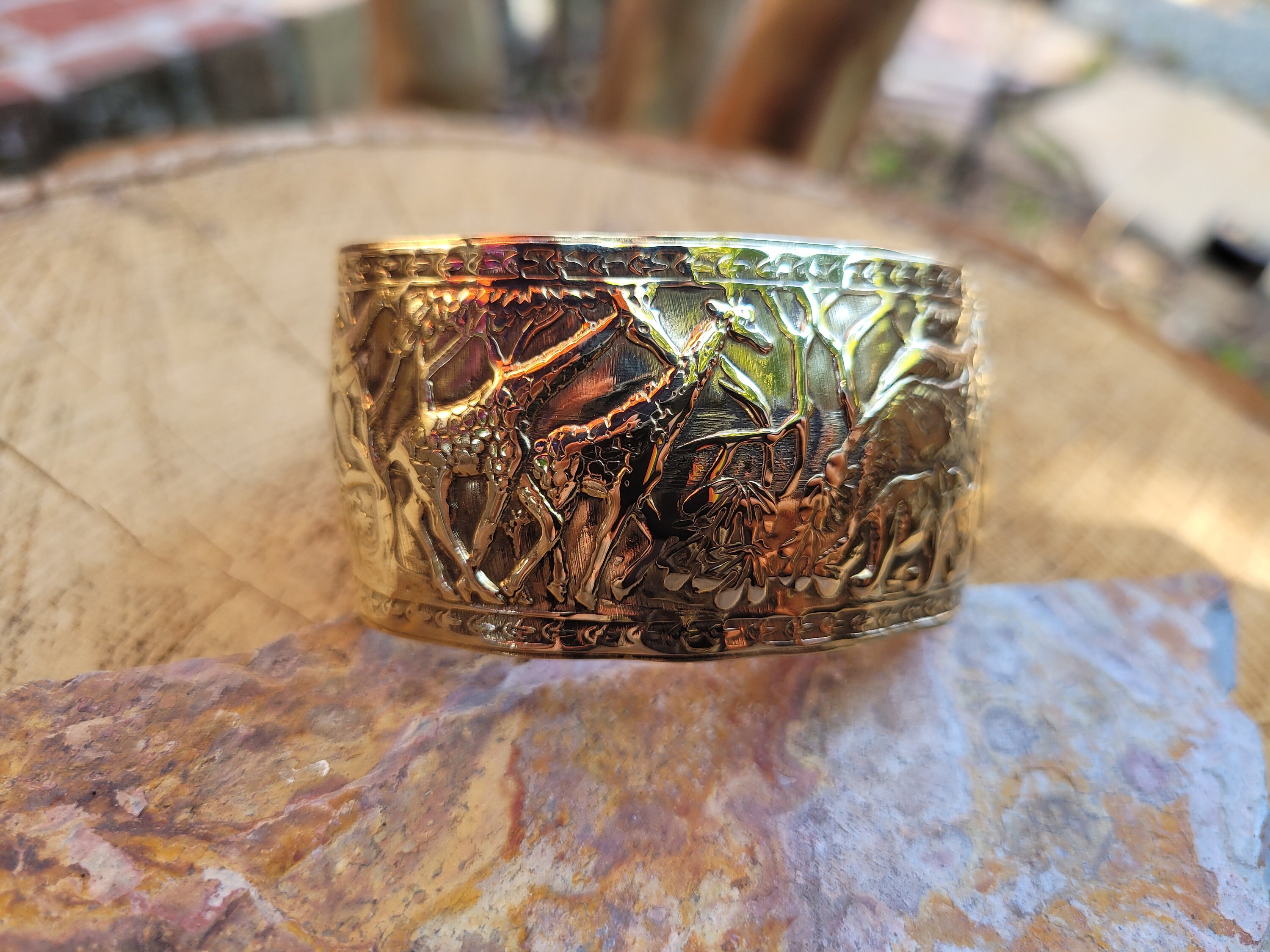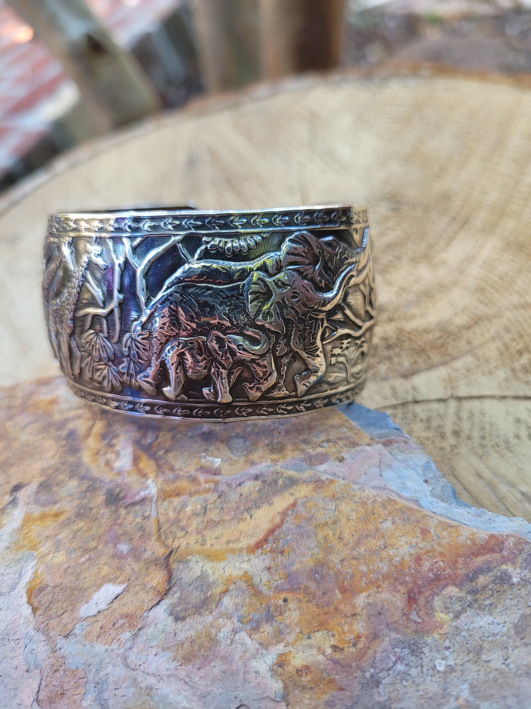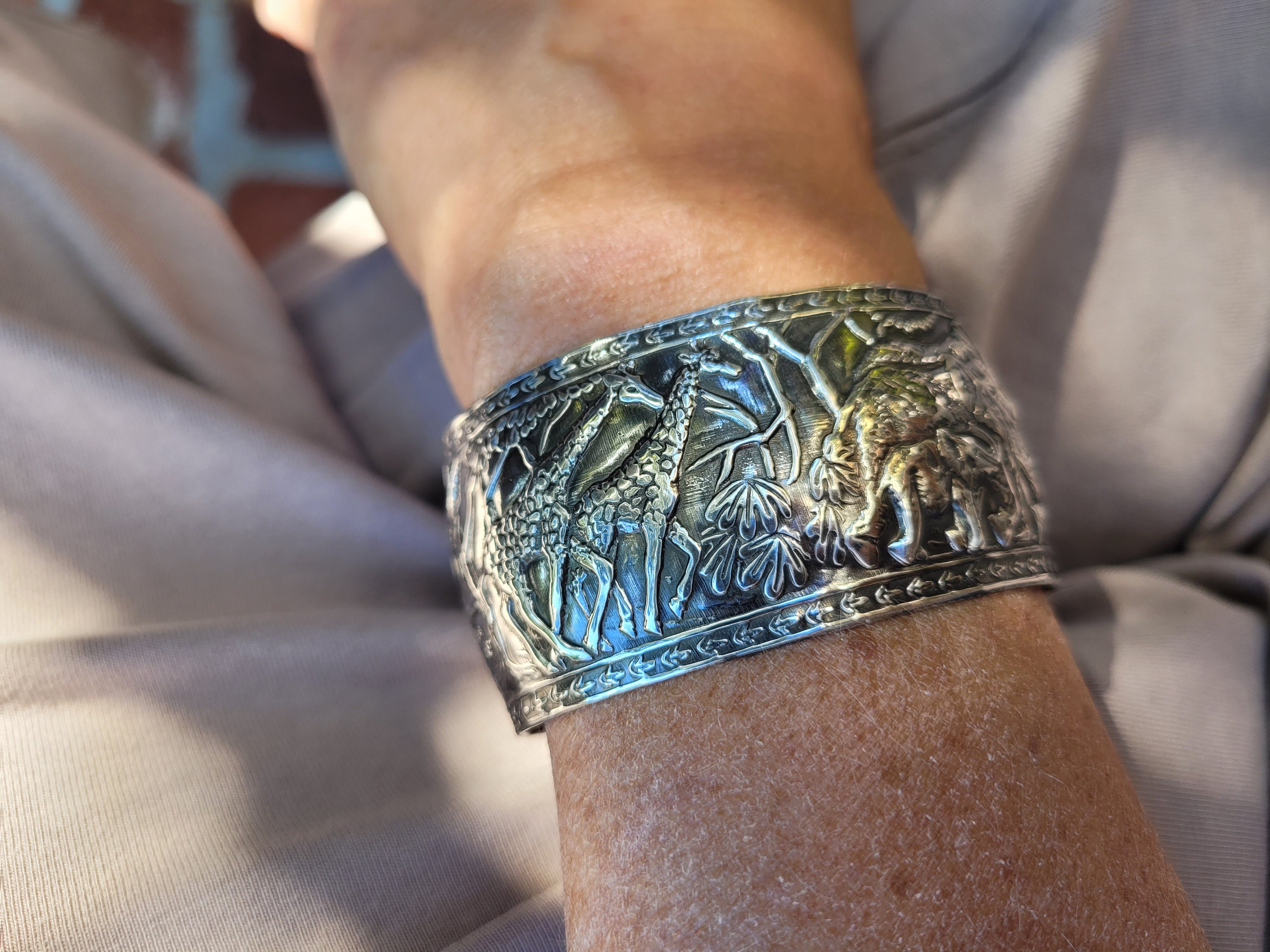 This stunning safari pattern cuff bracelet speaks for itself. Gorgeous design of giraffes and elephants wraps around the whole bracelet.