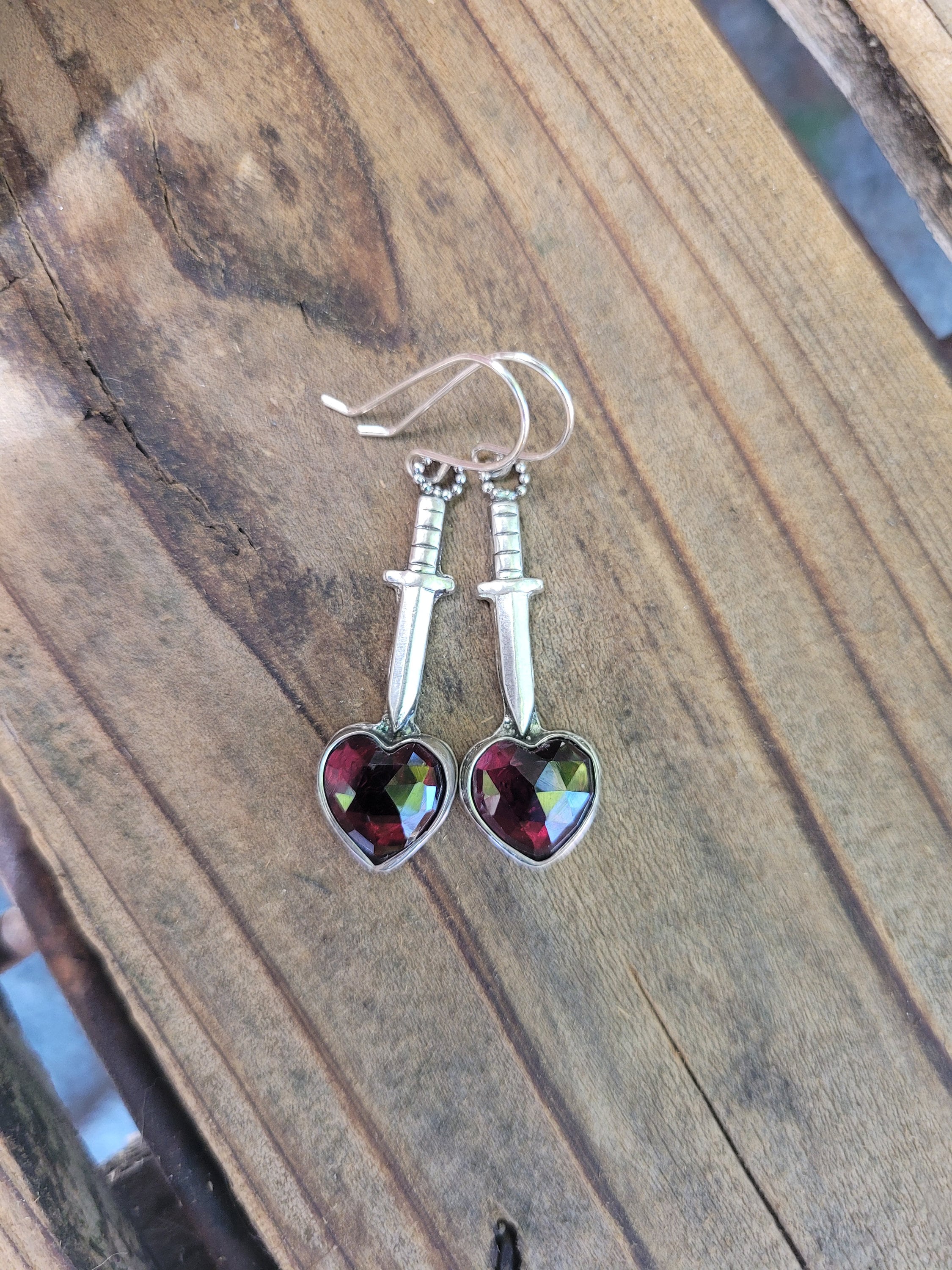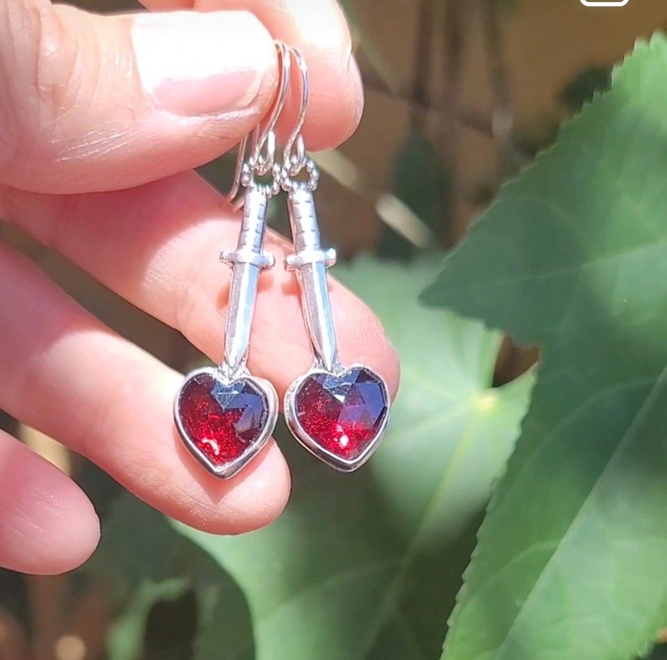 Deep red garnet heart shaped earrings with hand cut dagger knives. All hand forged and cut and polished by hand. Only this pair available