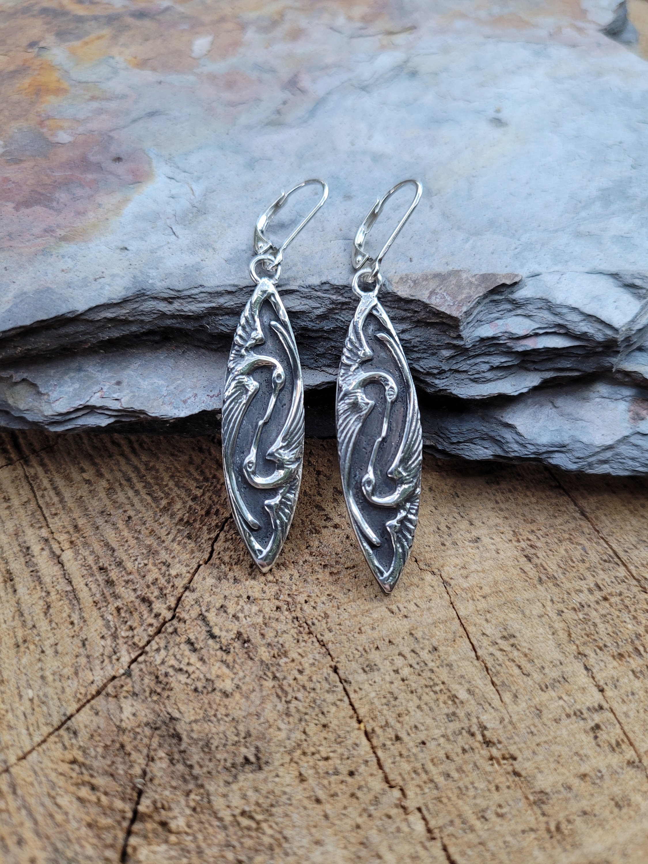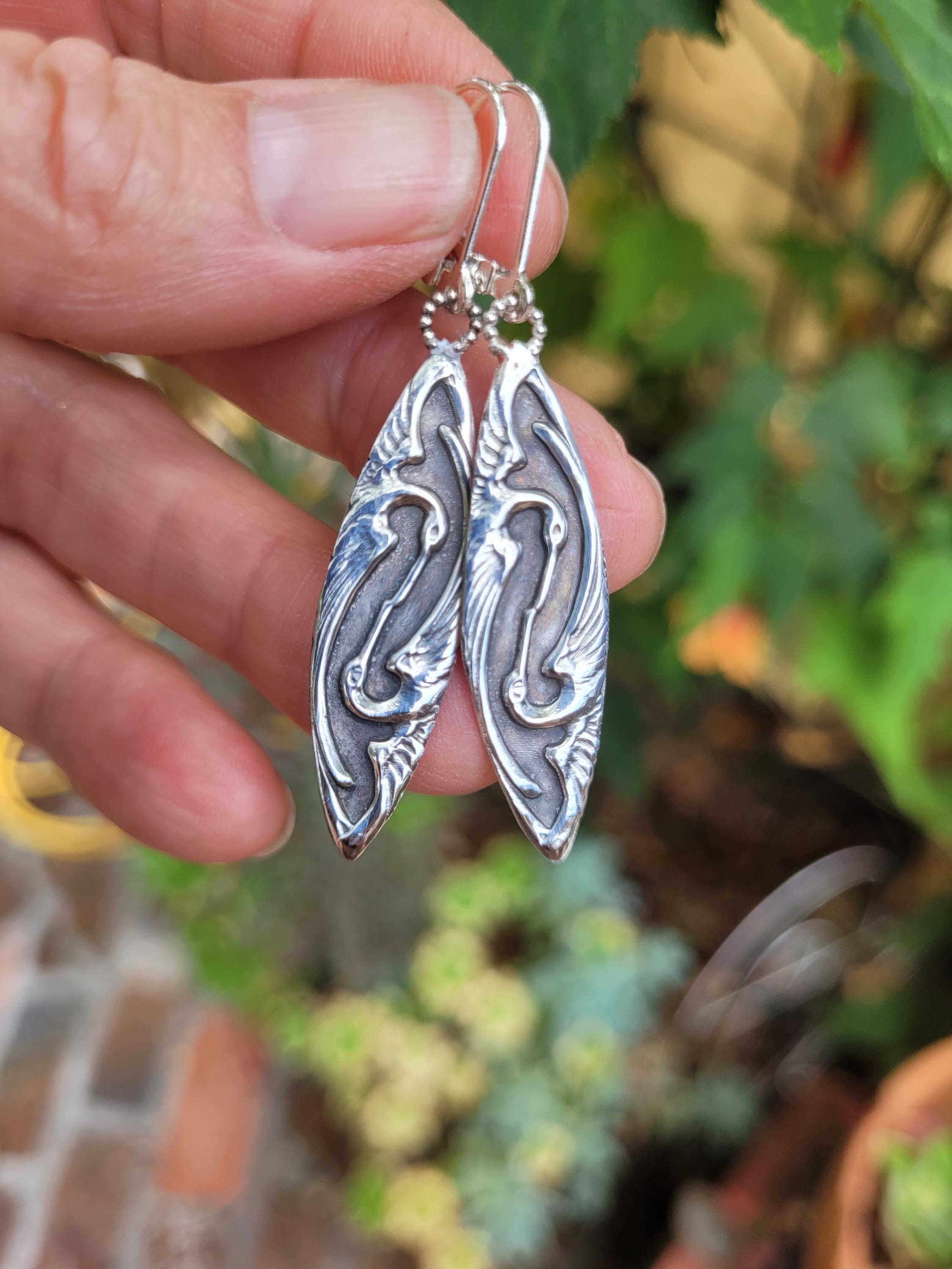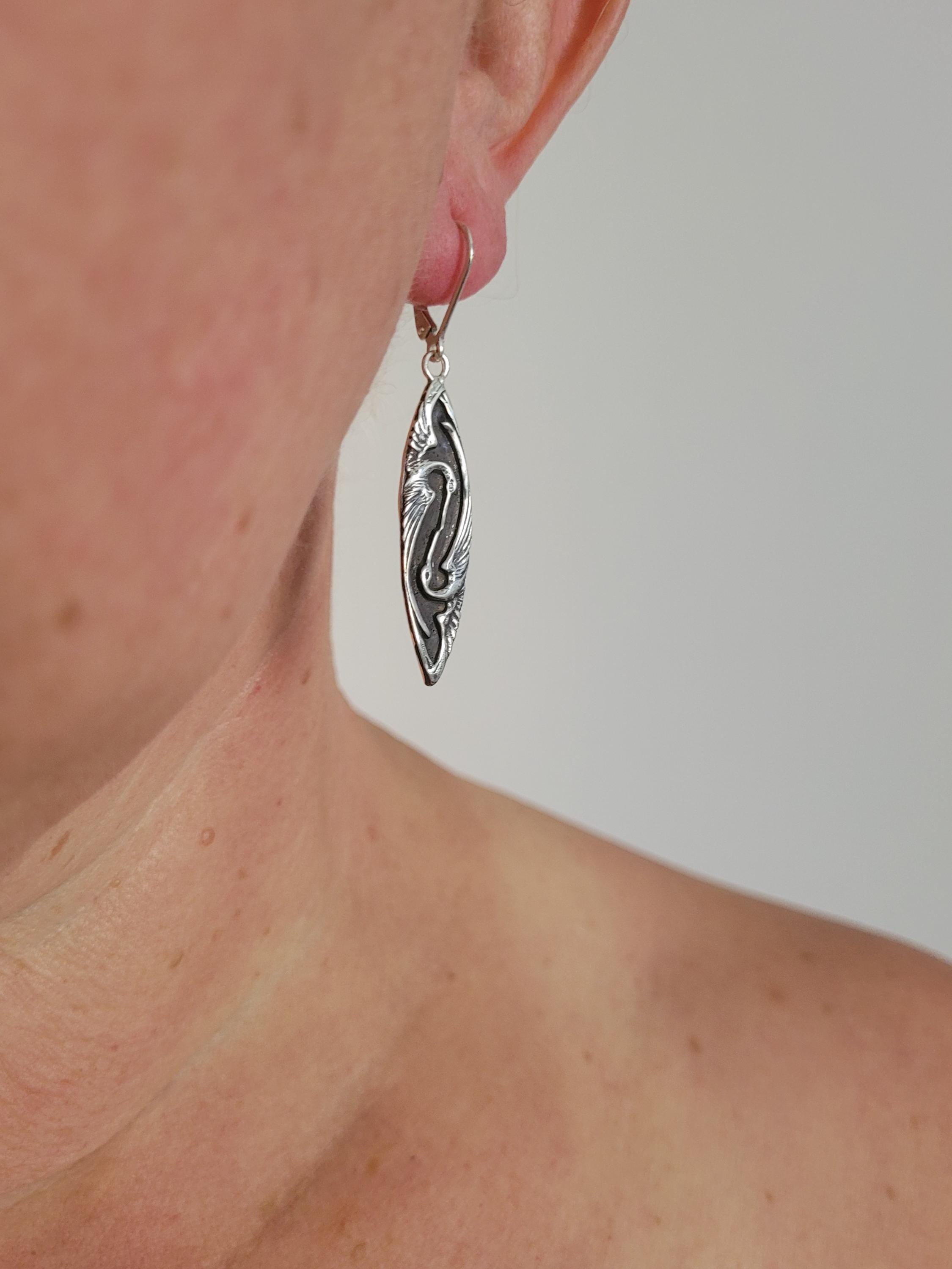 Handmade in sterling silver. These dangle 1.5 inches from earlobe. Lightweight yet sturdy I hand forged, press, cut and polish everything