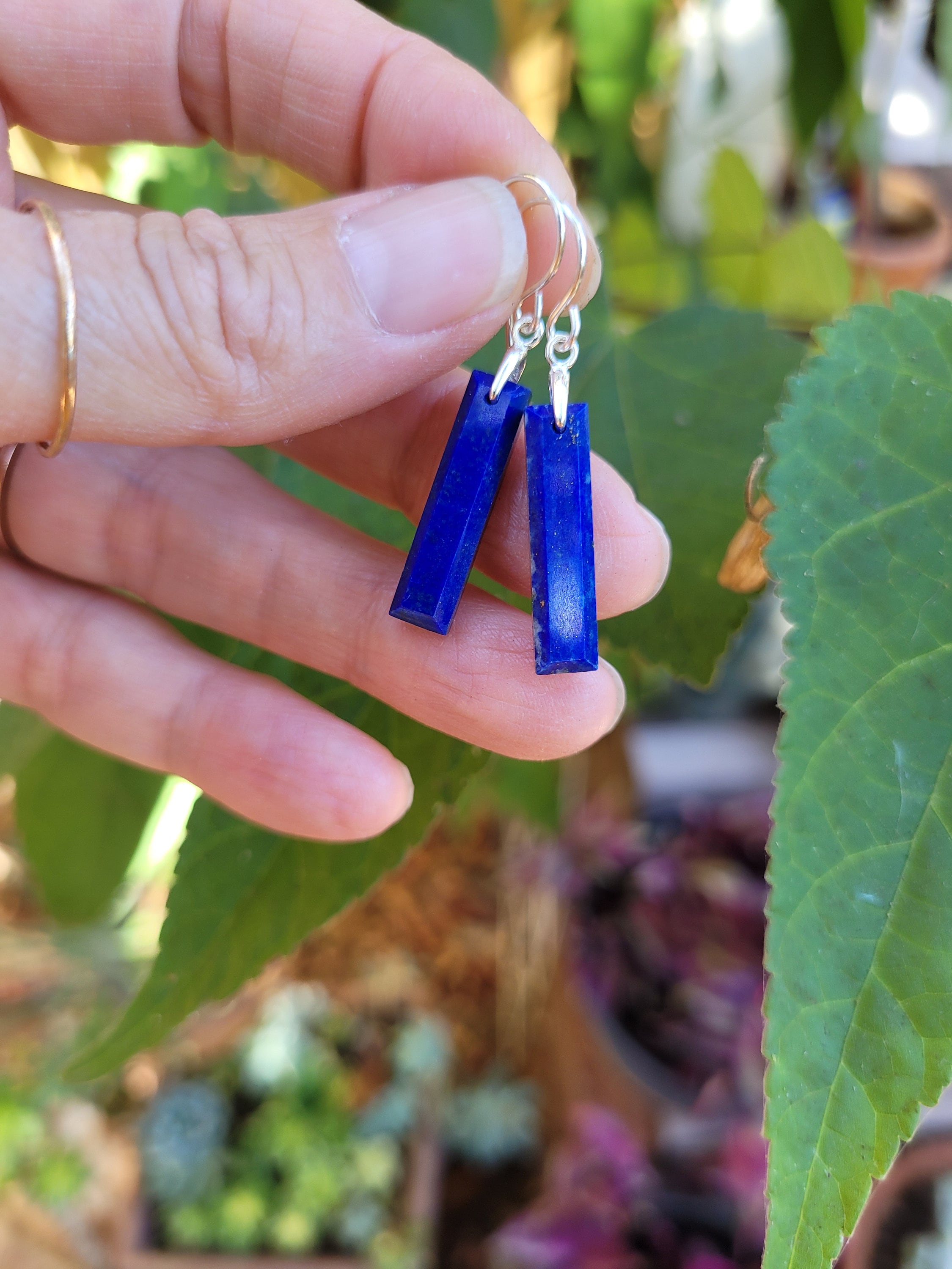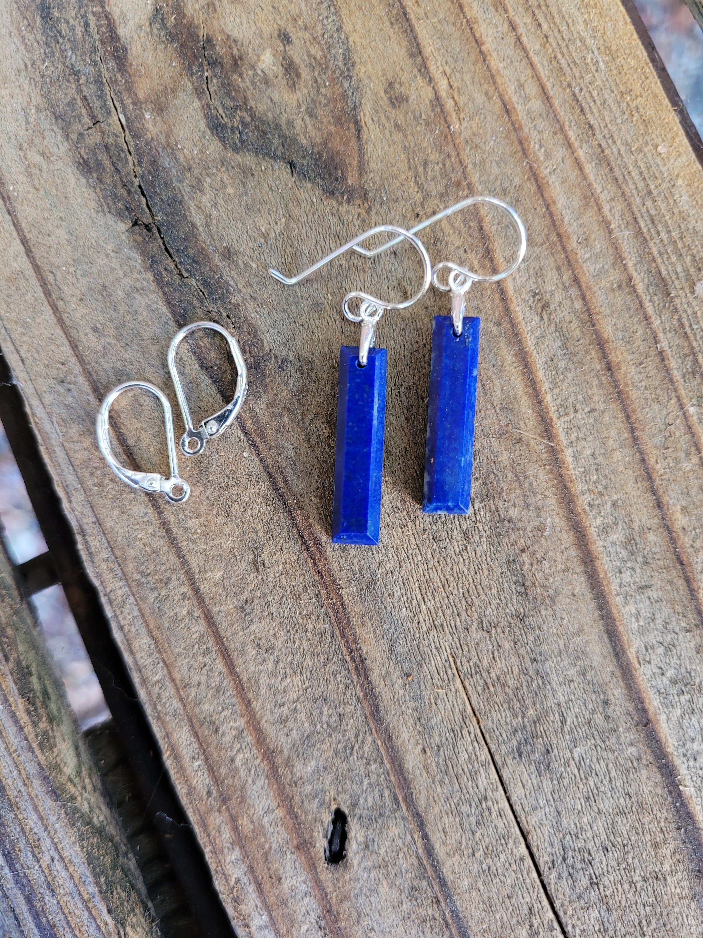 Beautiful denim lapis earrings dangle approximately 1 inch from earlobe. These have wonderful quality of blue that shows the quality of these gemstones.