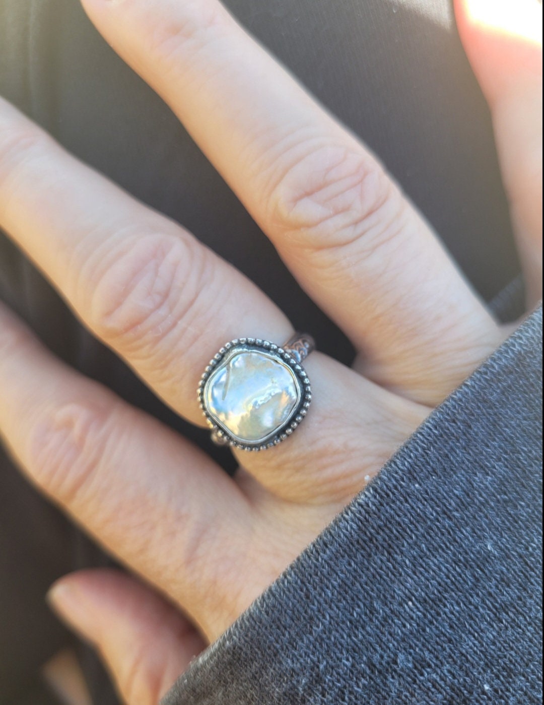 Sweet and charming flat cornflake pearl ring. Available in sterling silver only. Sweet pearl ring. Hand made with love! Sweet and charming! Elegant swirling band with delicate nouveau swirls under the pearl