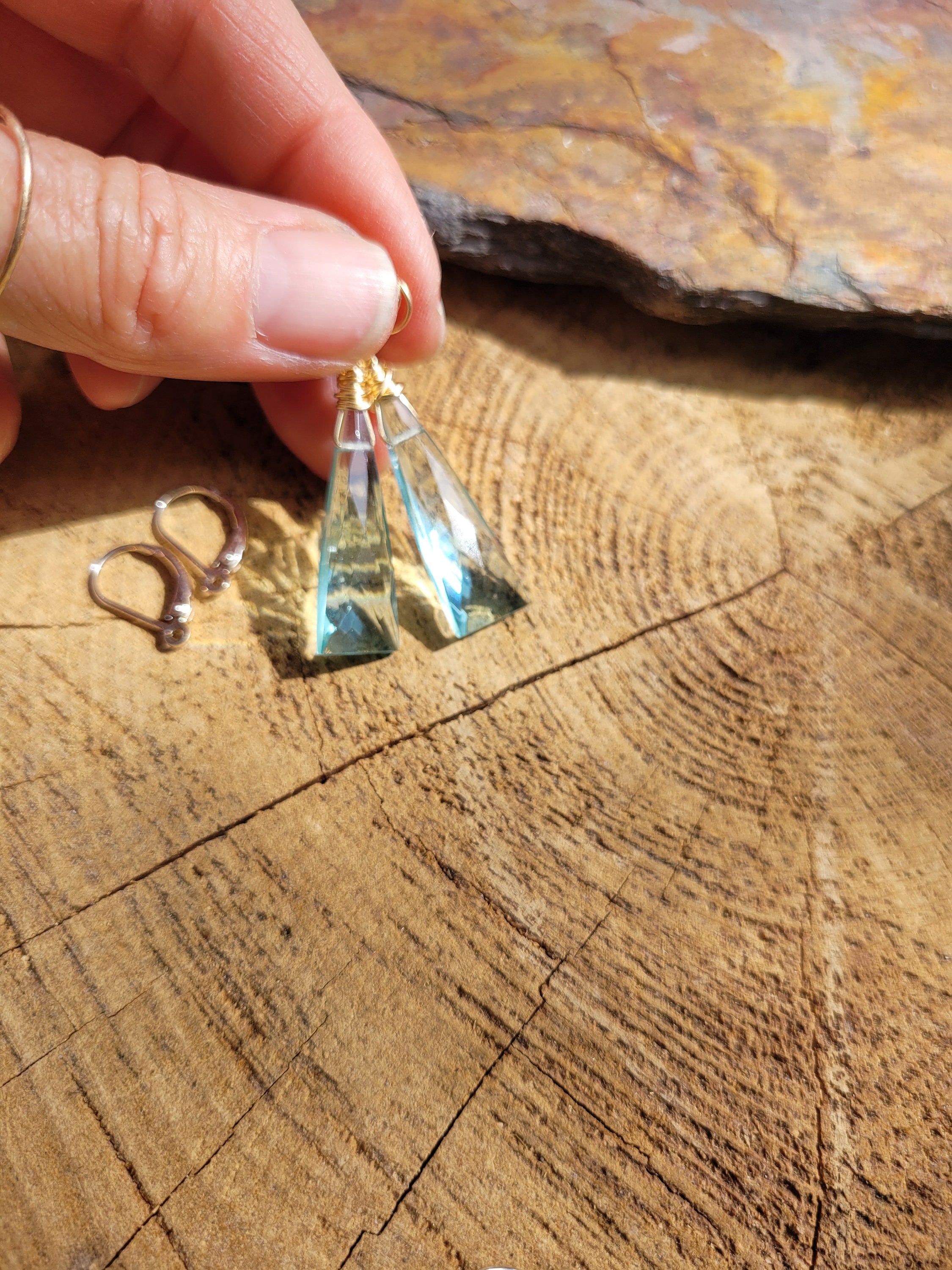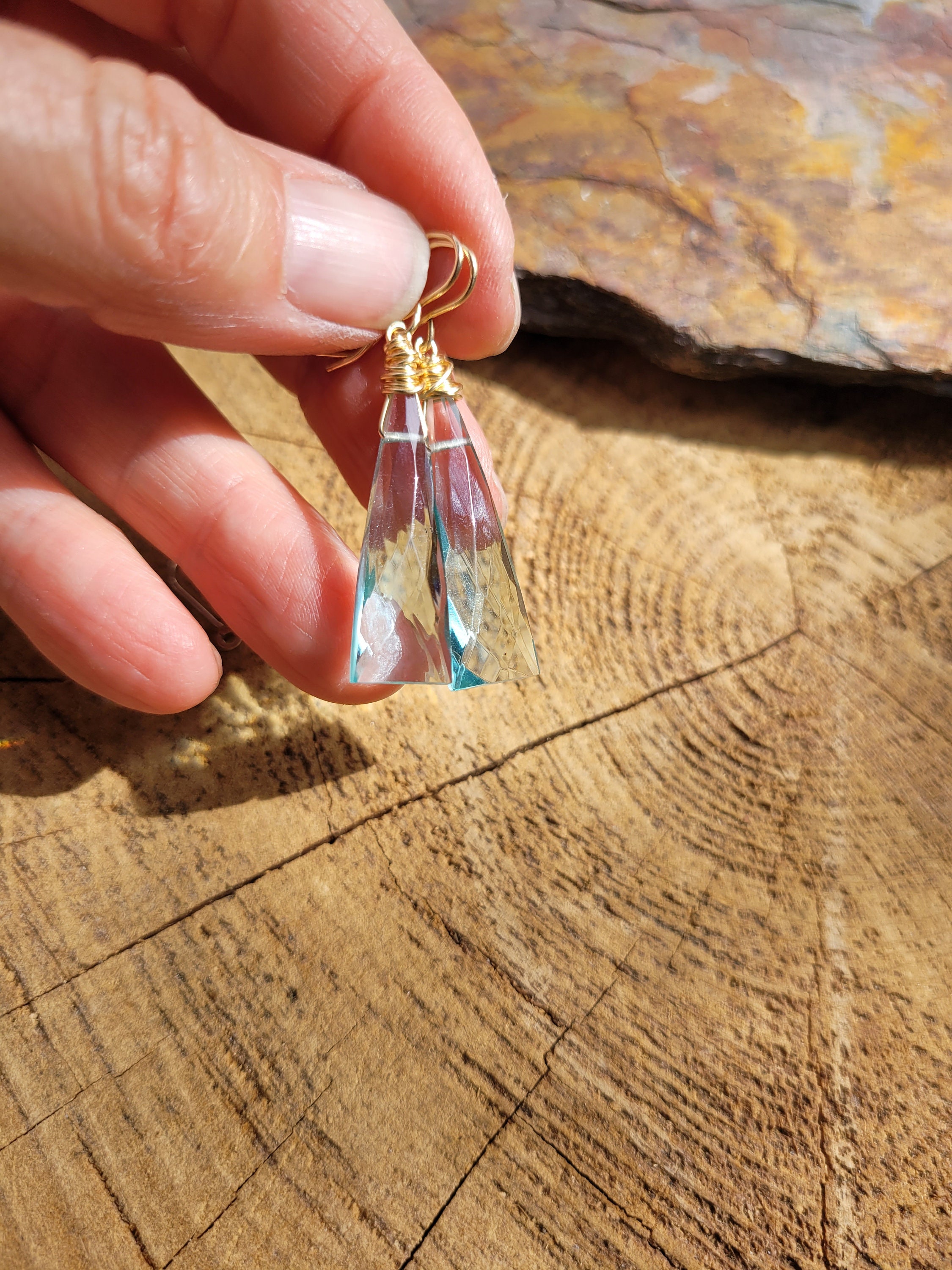 Unique cut of crystal clear aquamarine quartz earrings. Beautiful color of light blue gemstone in a long teardrop. Available in sterling silver only