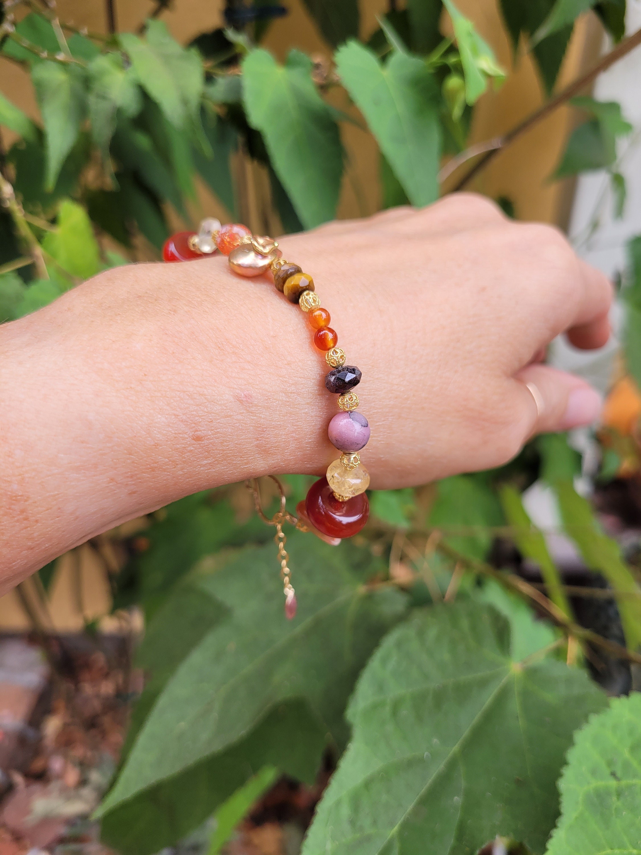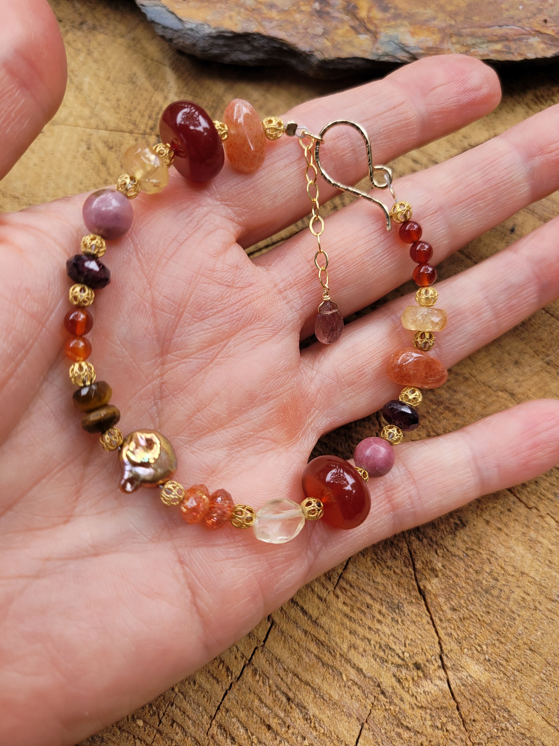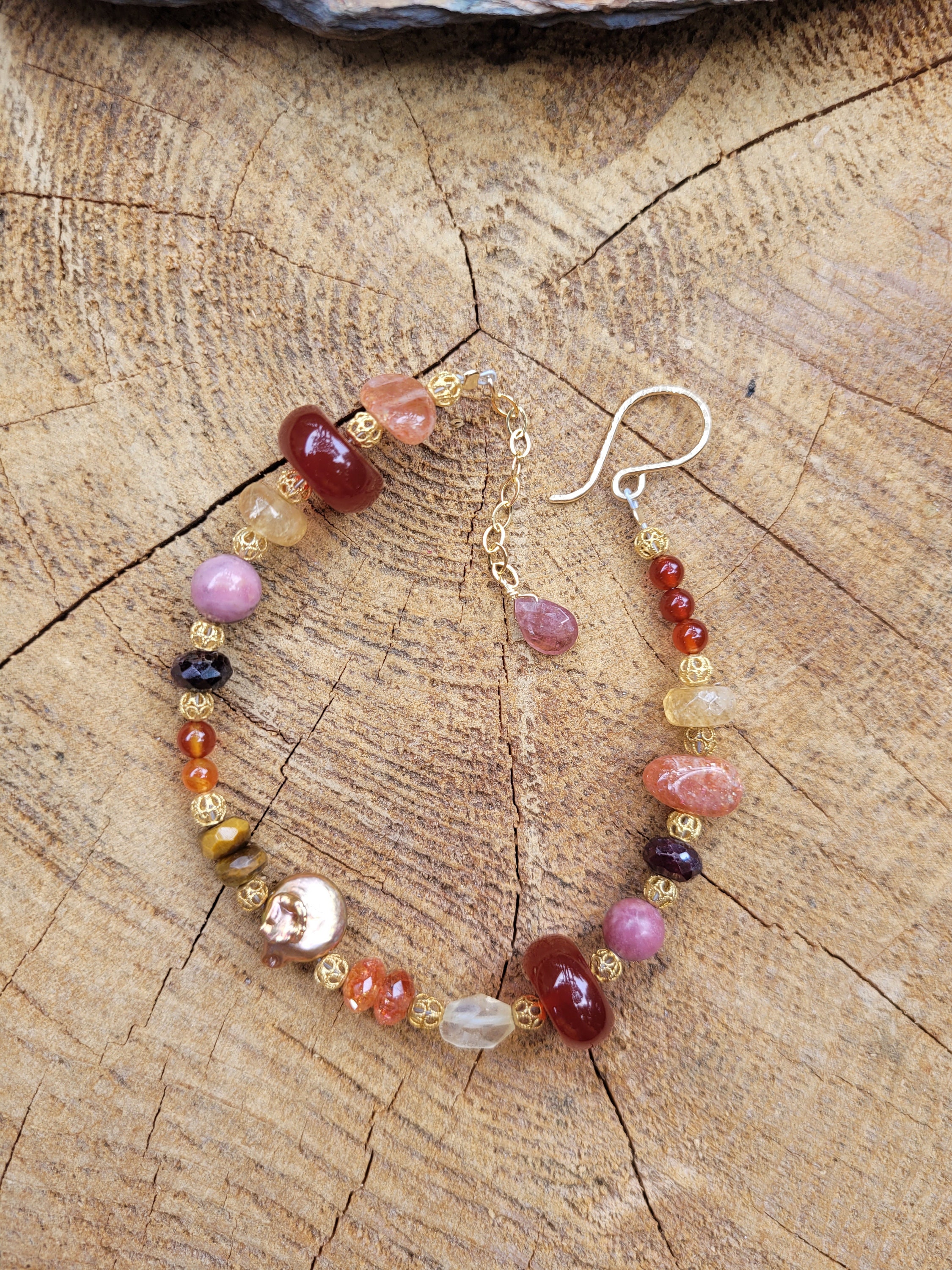 This bracelet is loaded with gorgeous natural stones. Sunstone, carnelian, citrine, rhodonite, garnet, pink tourmaline and tigers eye. Gold filled components. There is a dangle so it can be adjusted accordingly. Fits a 7 inch wrist. If you need and adjustment message me