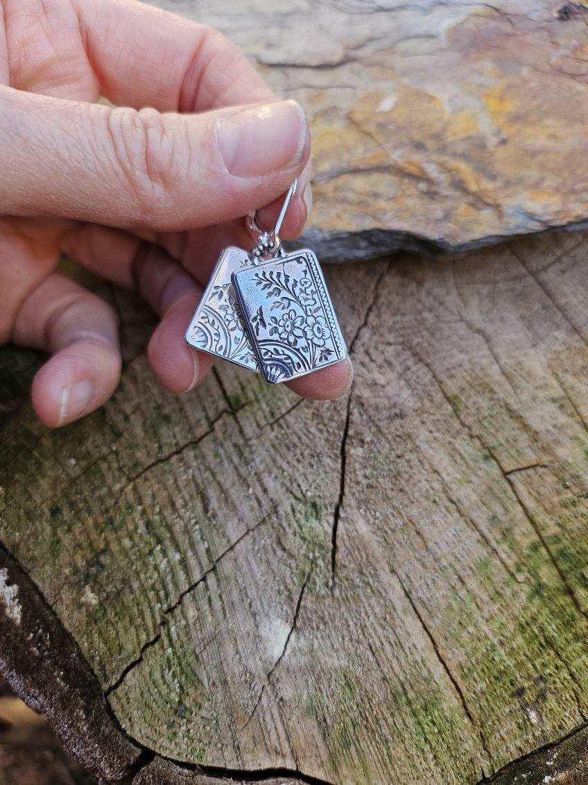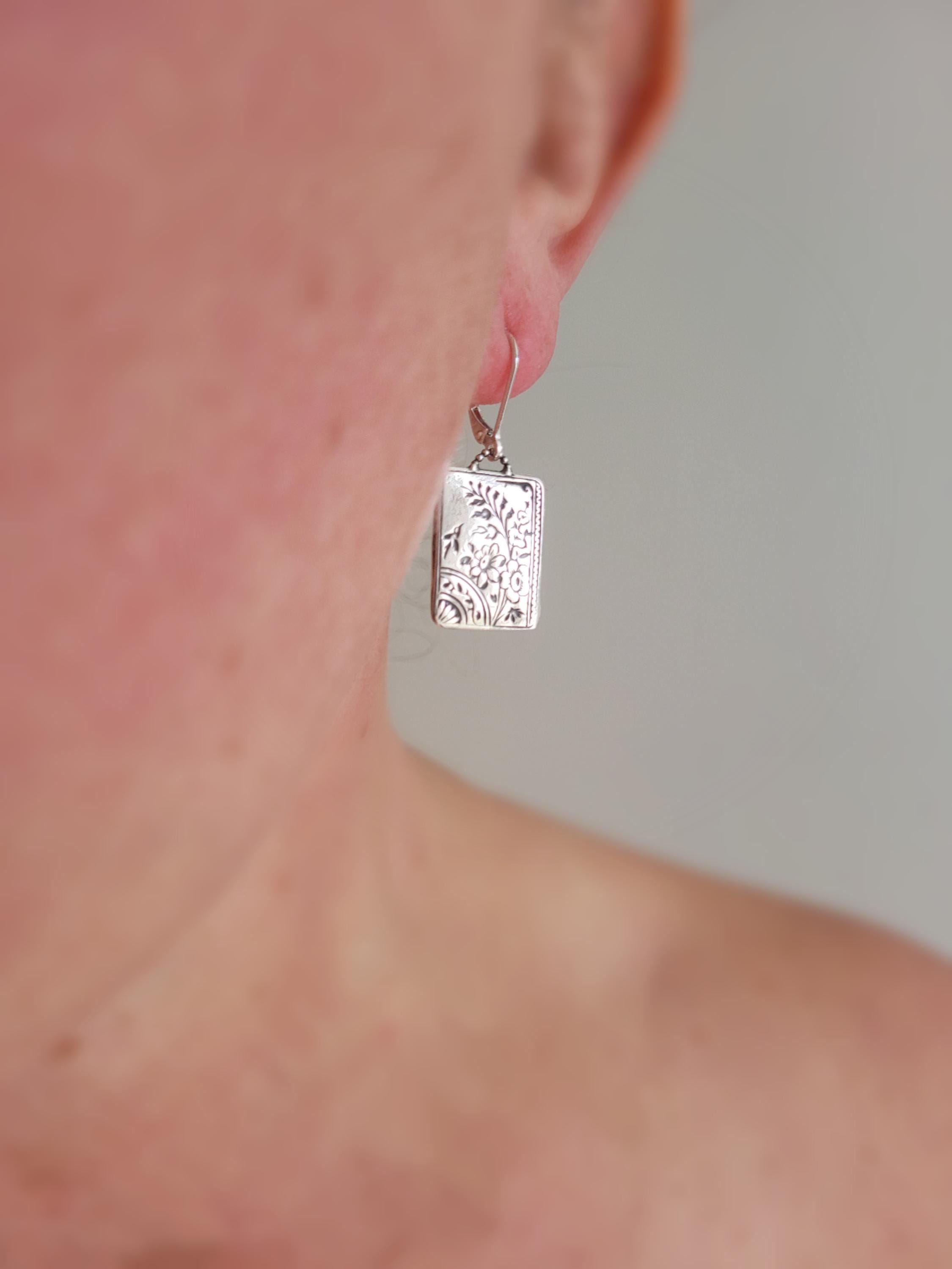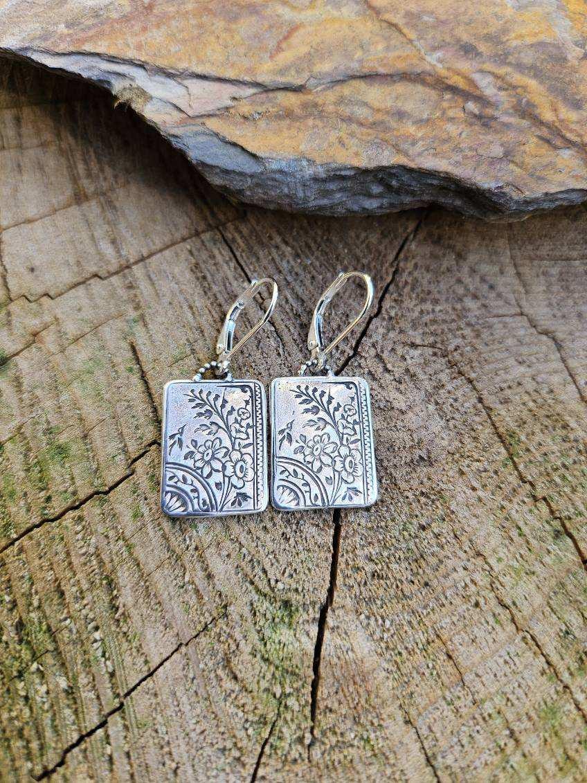 Sweet and dainty delicate storybook earrings. These are subtle and stunning. Very understated but the details are sweet and demure. Made from vintage die from early 1900's French collection. sweet details of flowers and a hummingbird captured in little detail making these just adorable!!