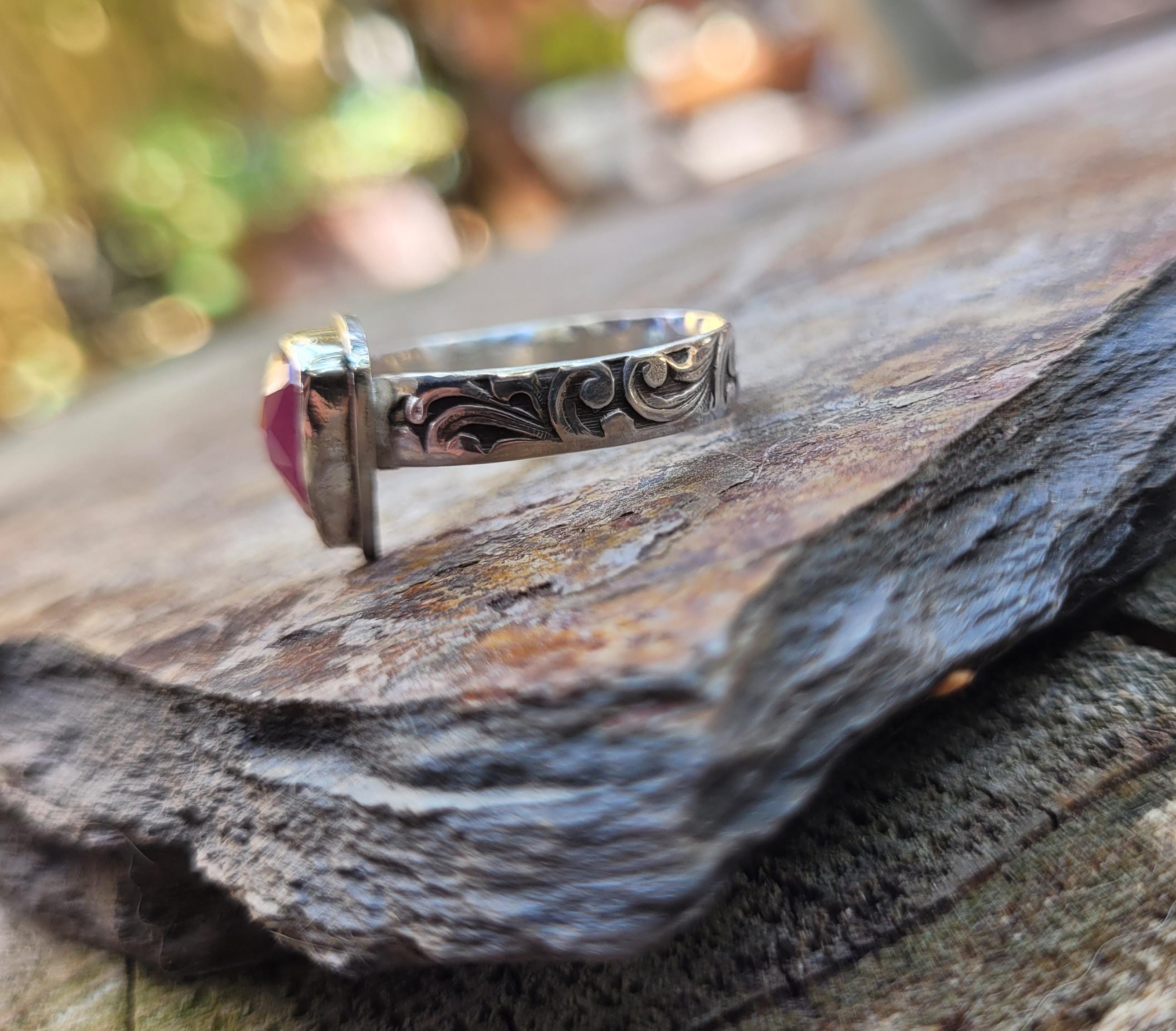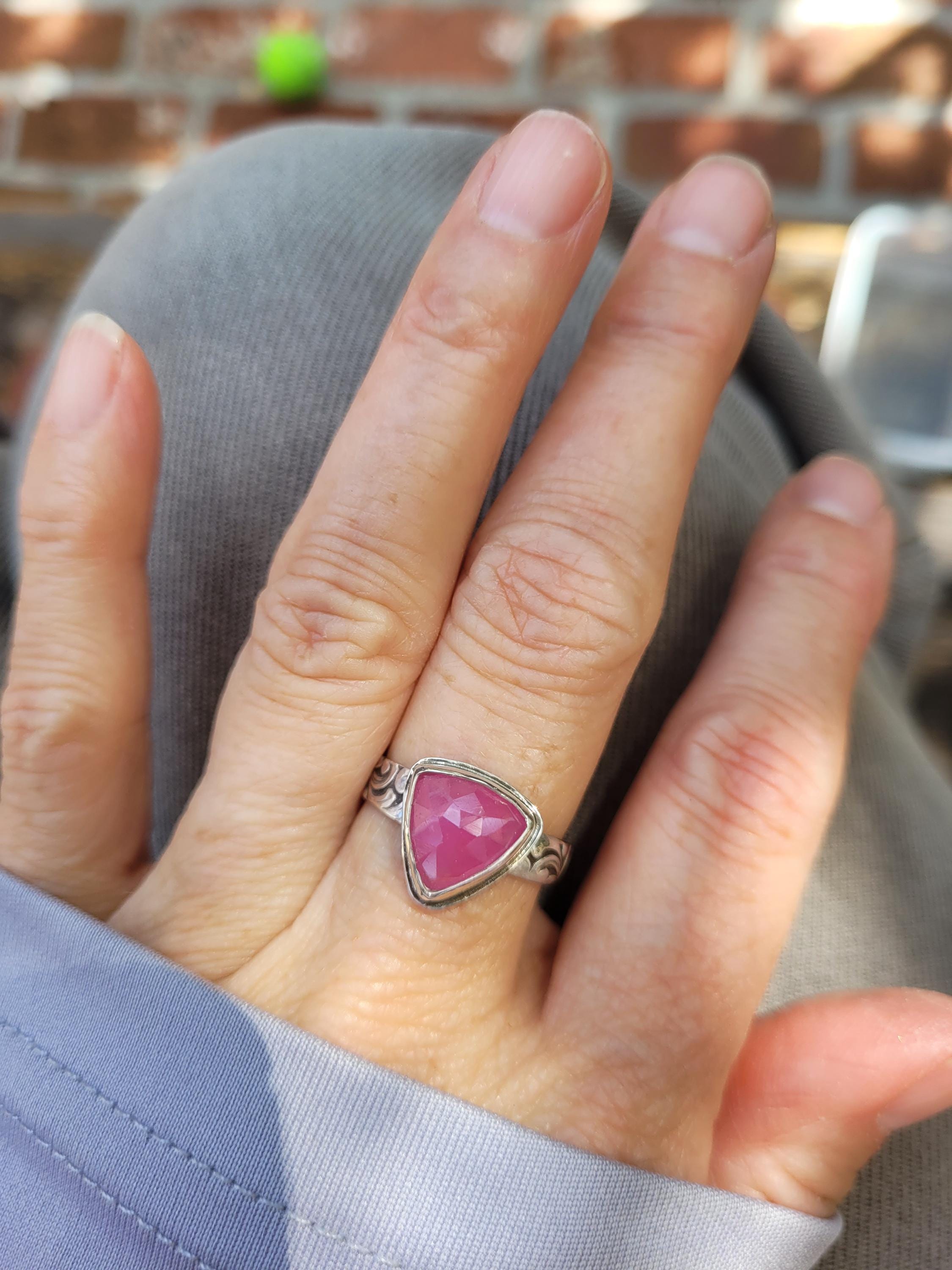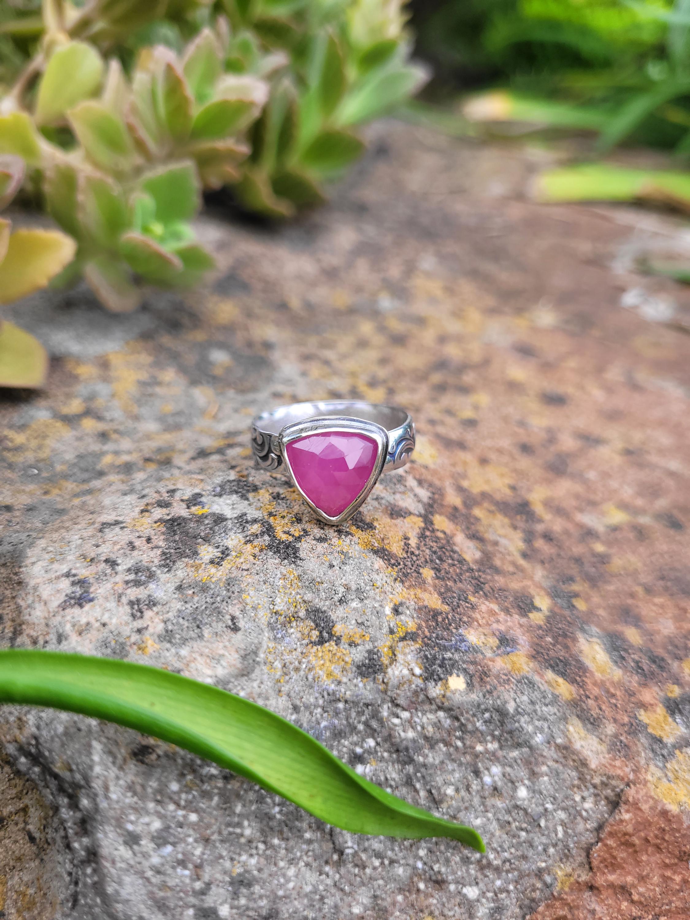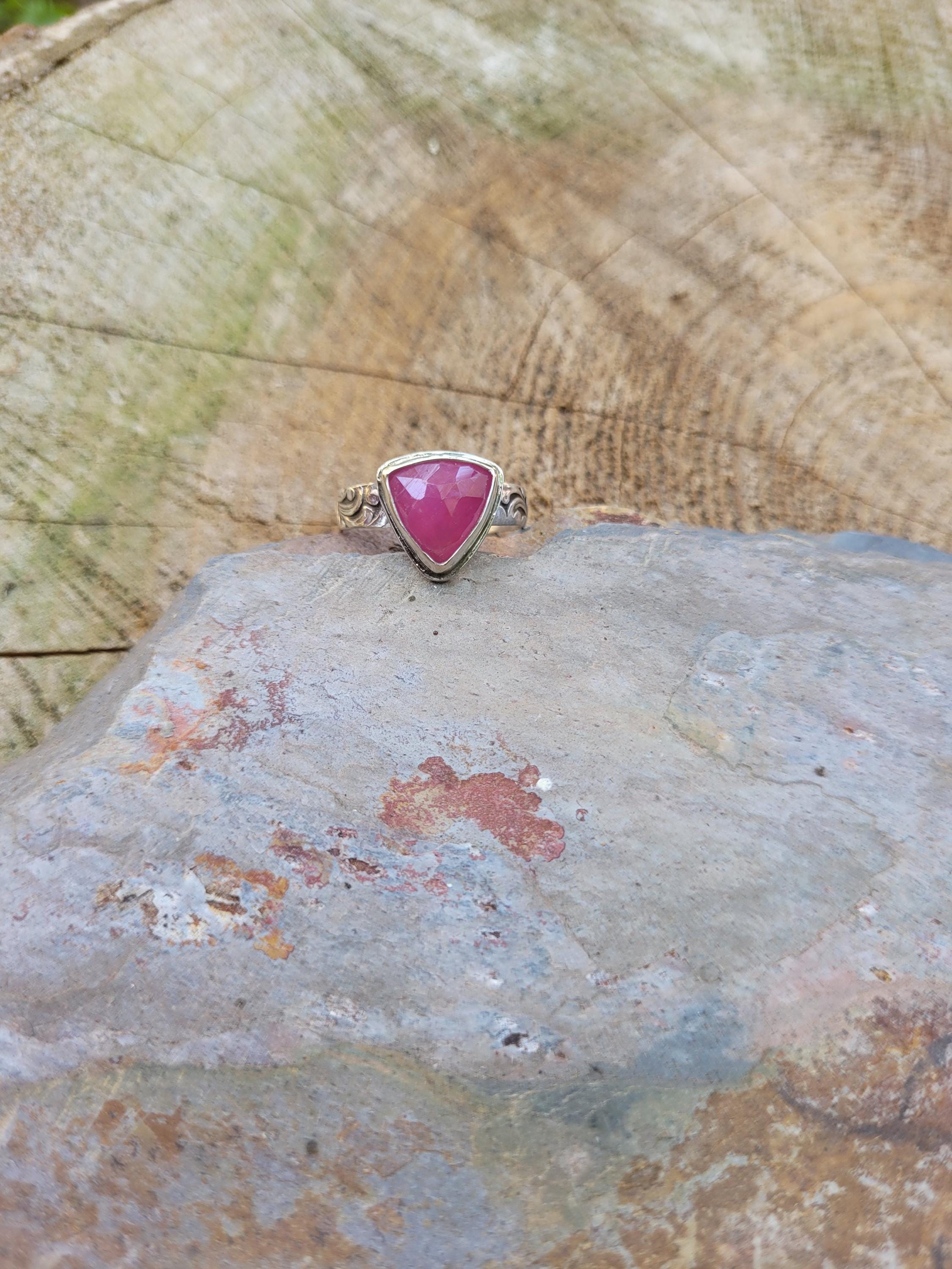 Shimmering triangle cut faceted sapphire ring. Sterling silver and delicately made with swirls on the band. Hand made with love. Size 8 and ready to ship.