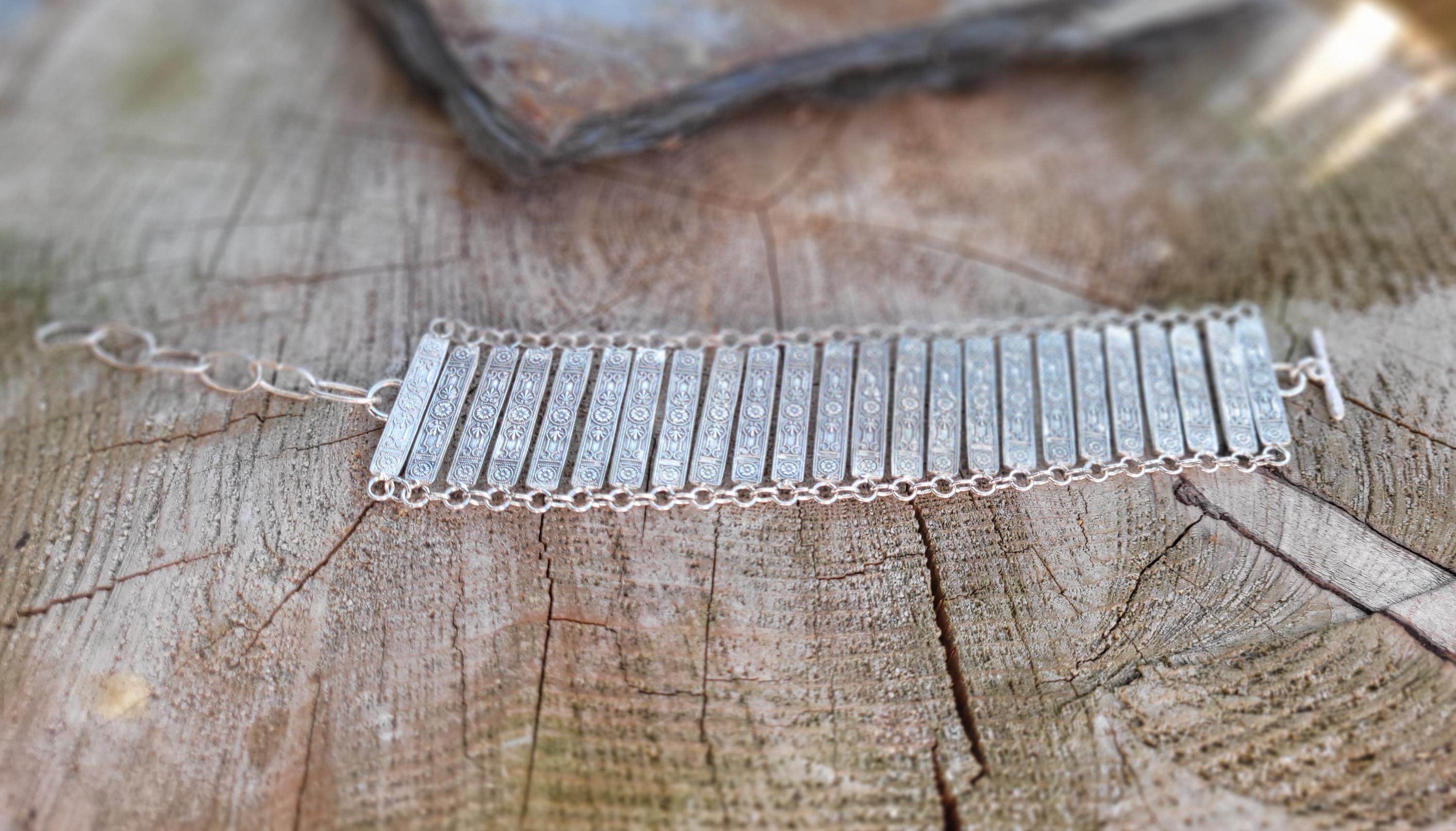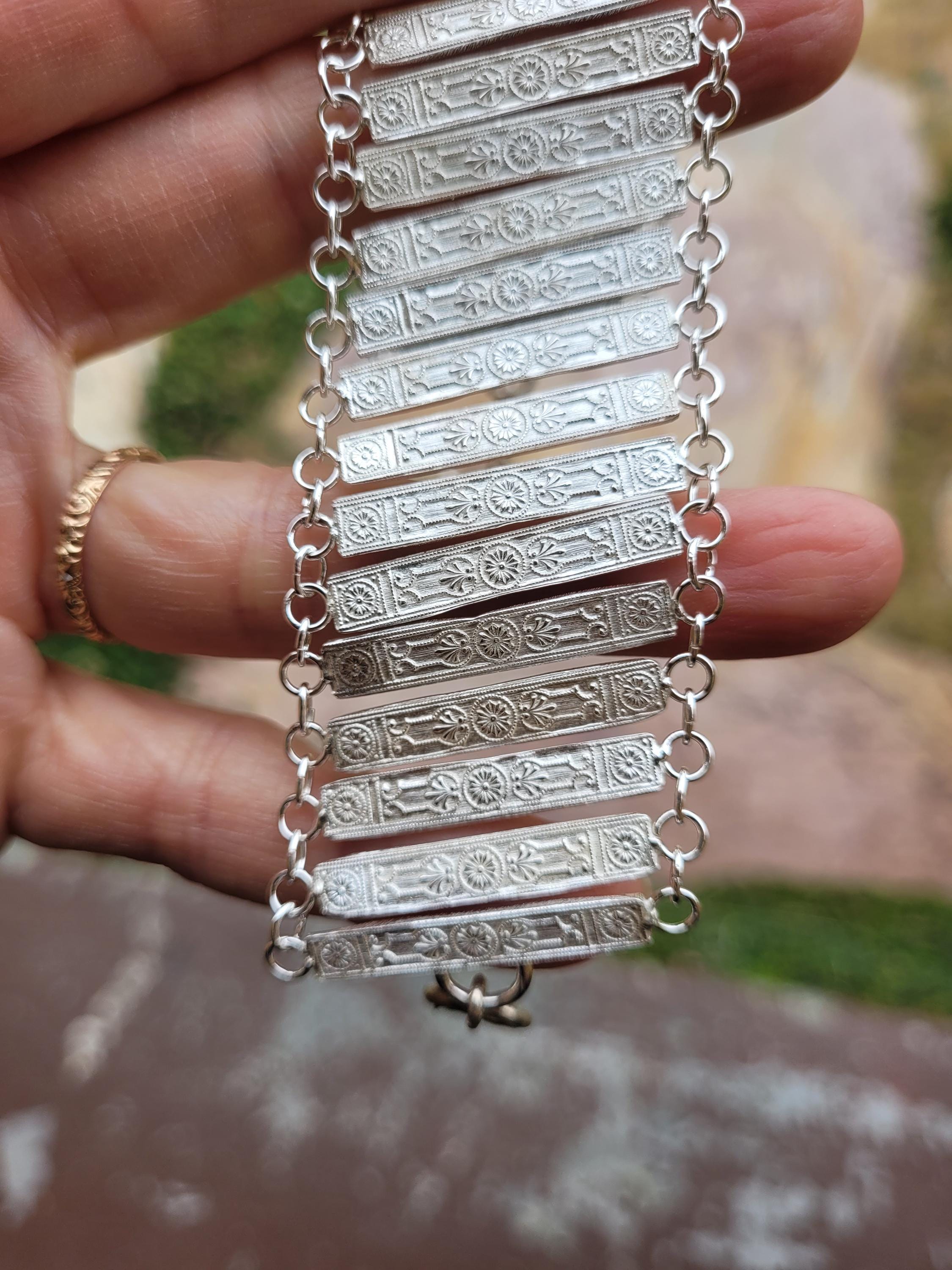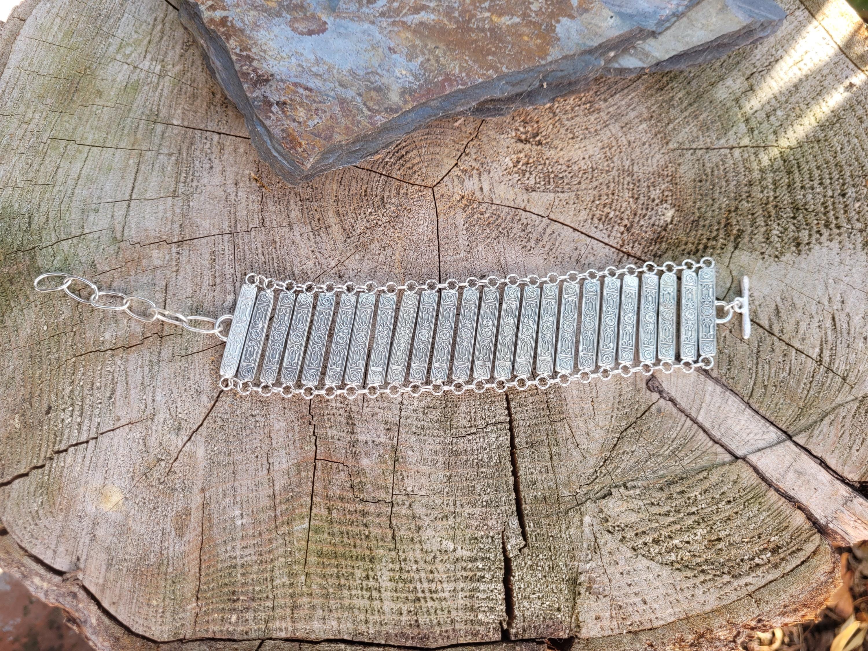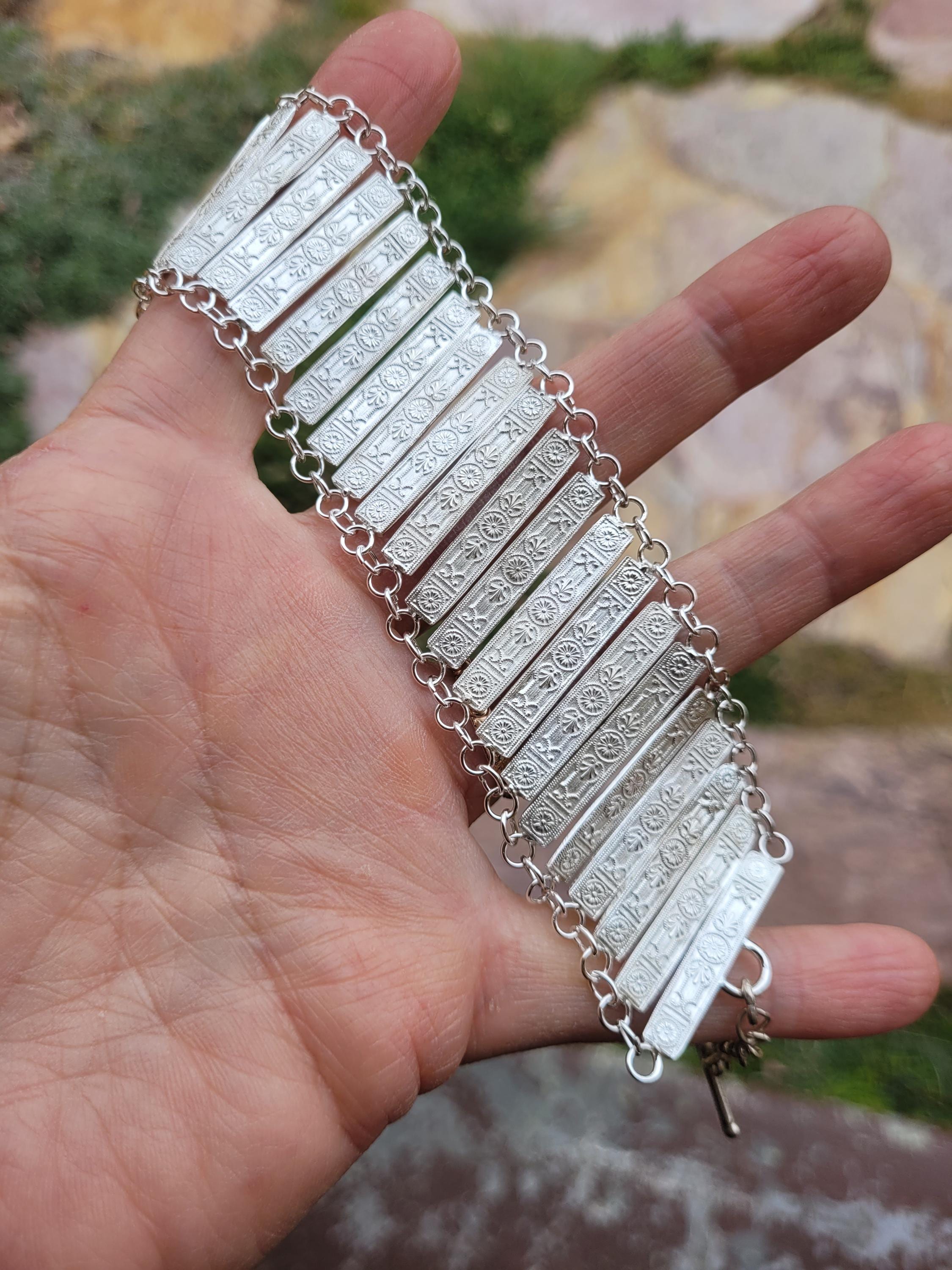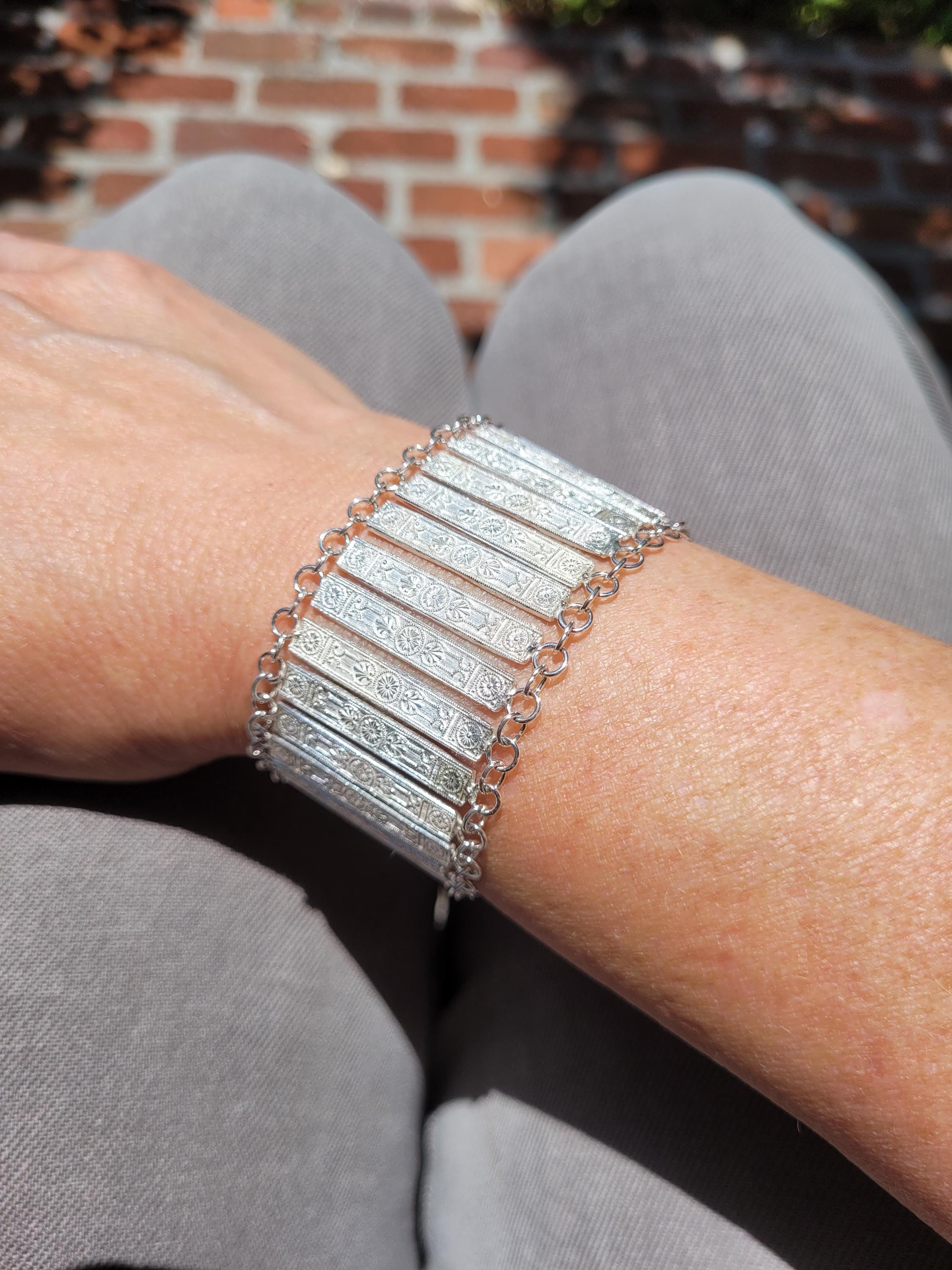 This one of a kind bracelet was hand made by me and was definitely a labor of love!! Delicate designs of art deco is simply stunning! This fits perfectly a "medium" to large wrist with wiggle room with the extension chain