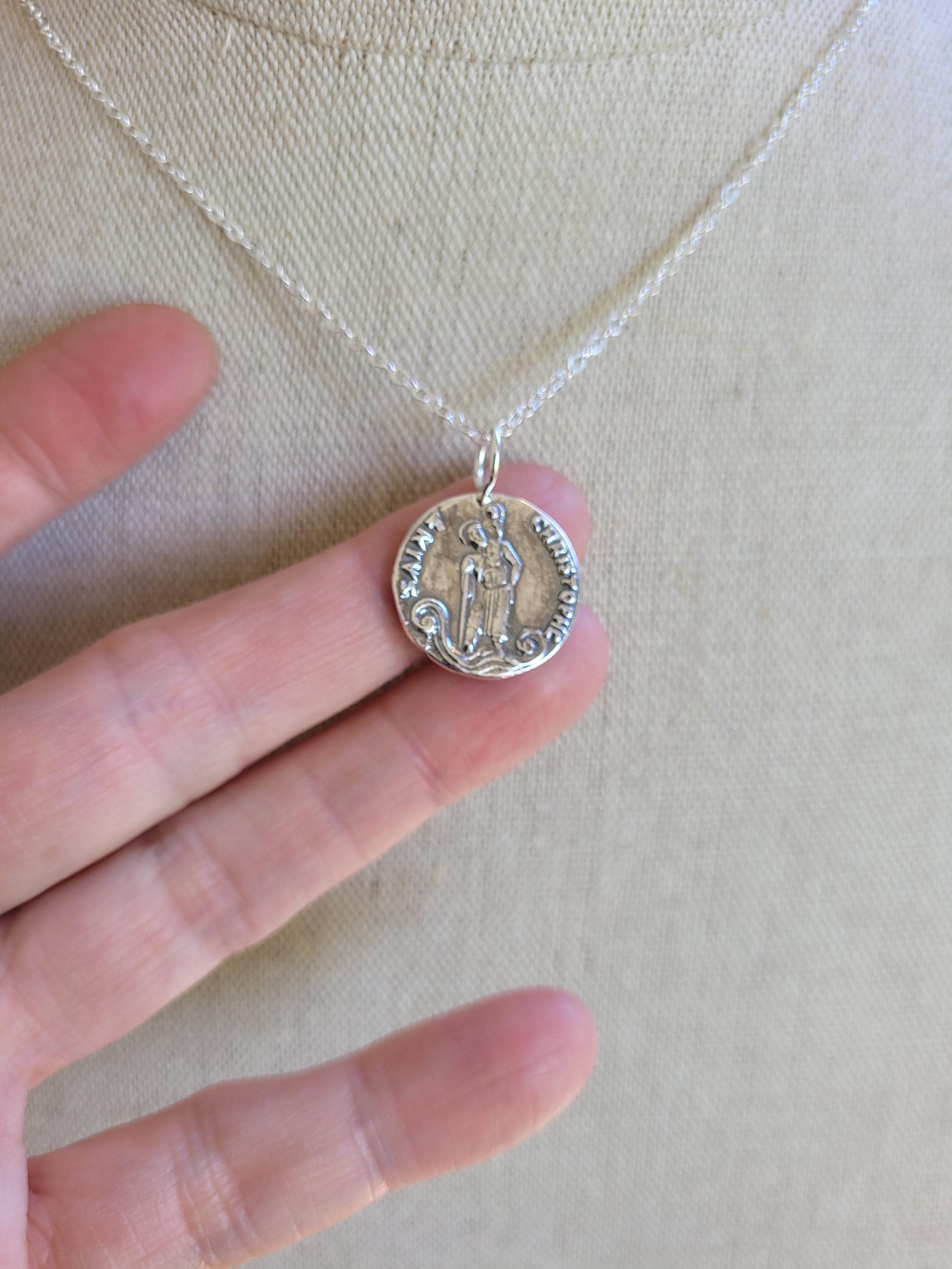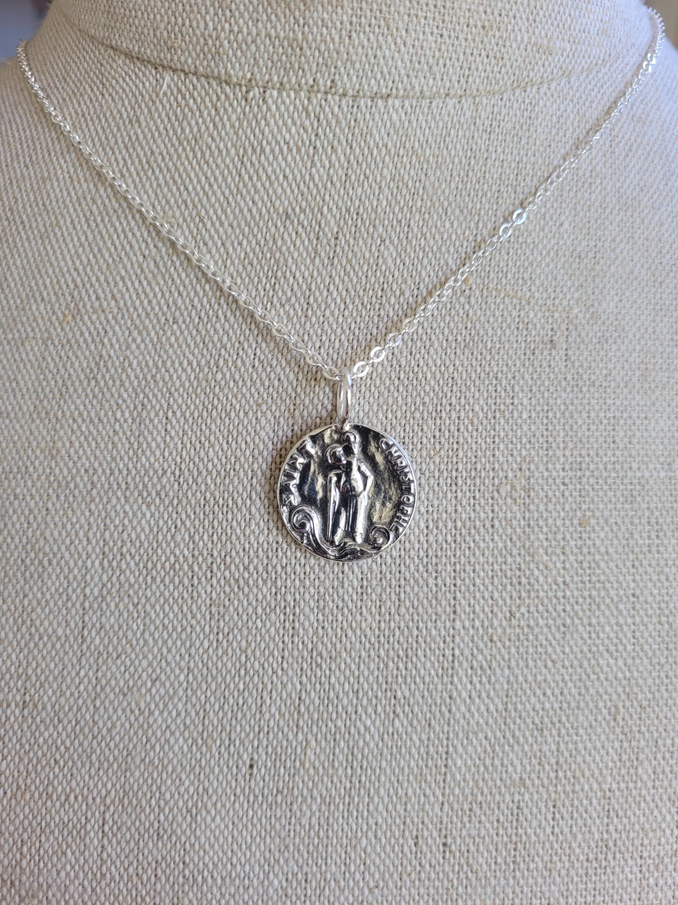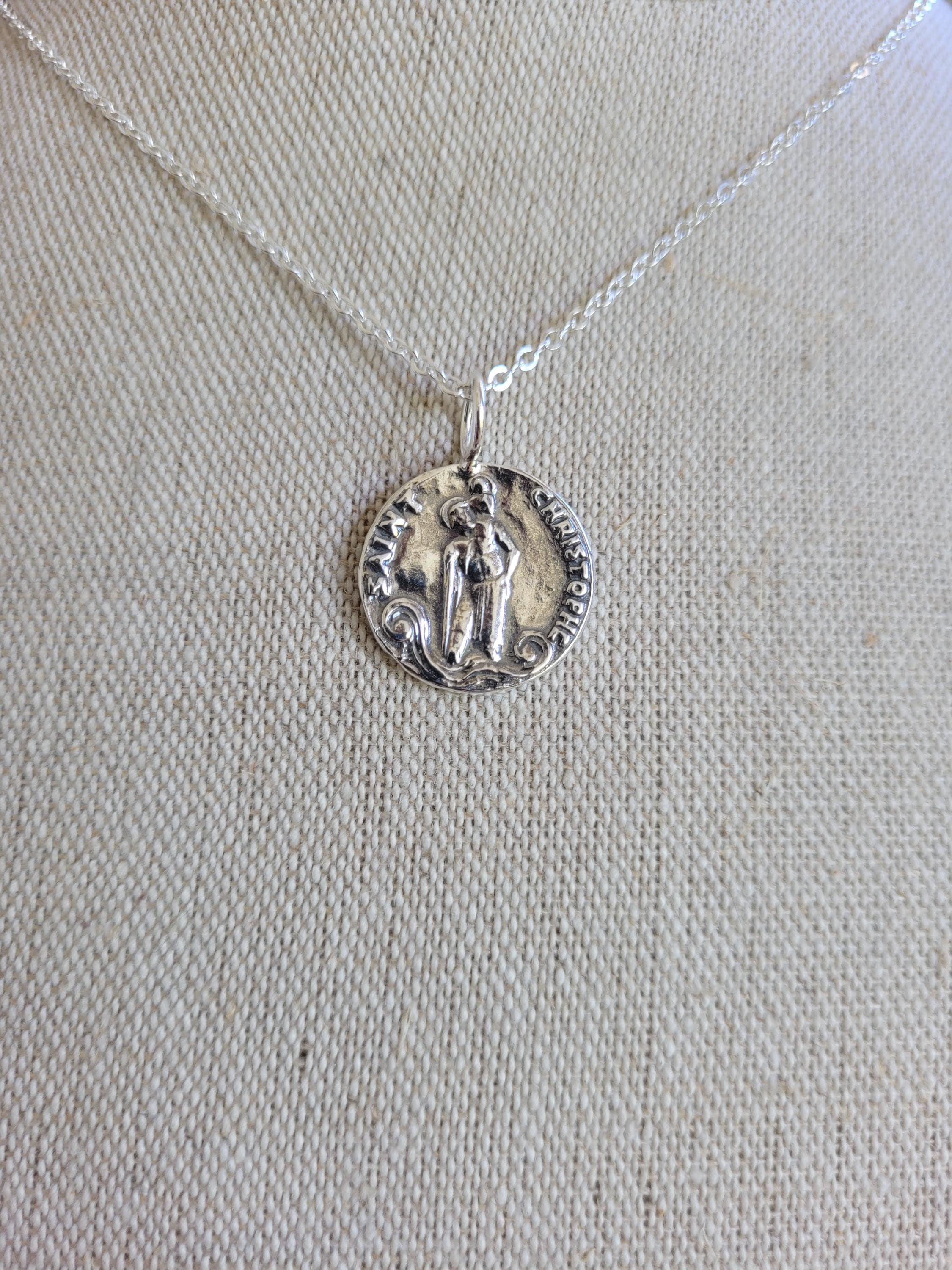 A Saint Christopher pendant is a religious medal, often worn as a necklace, that depicts Saint Christopher, the patron saint of travelers. It's a popular symbol of protection and safe passage, especially for those embarking on journeys. While traditionally associated with the Catholic faith, the pendant is now worn by people of various backgrounds as a general symbol of safety and good fortune.