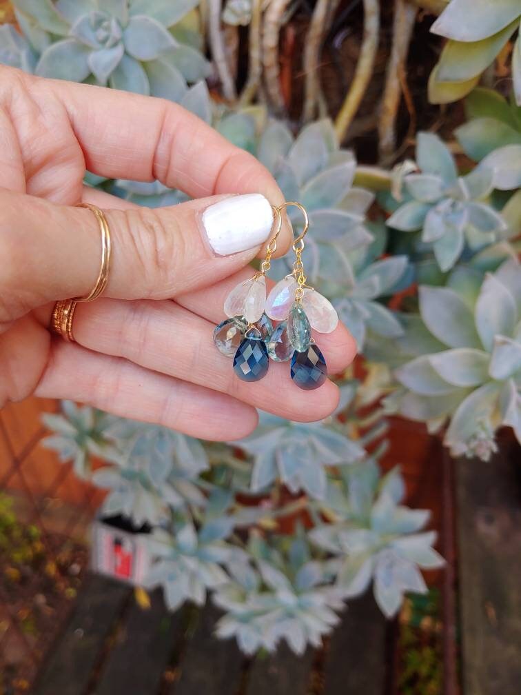 London blue topaz aquamarine moonstone earrings. Dangle approx 1.5 inch from earlobe. AAA quality gemstones on your choice of 14k gold filled, rose gold filled, or sterling silver earrings. Hand wrapped with love each gem is picked to compliment each other. Rainbow moonstone earrings