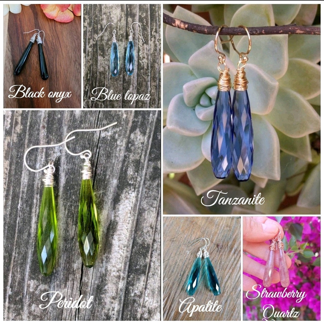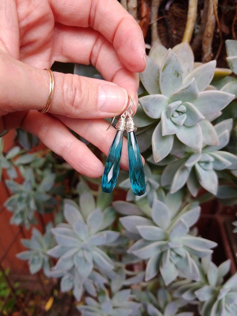 Unique cut of sky blue apatite quartz earrings. Beautiful color of emerald / sky blue quartz gemstone. Available in rose gold, gold filled or sterling silver. I only have 1 pair avail in this cut of gemstone. Truly dazzling with this perfectly imperfect wire wrap❤️