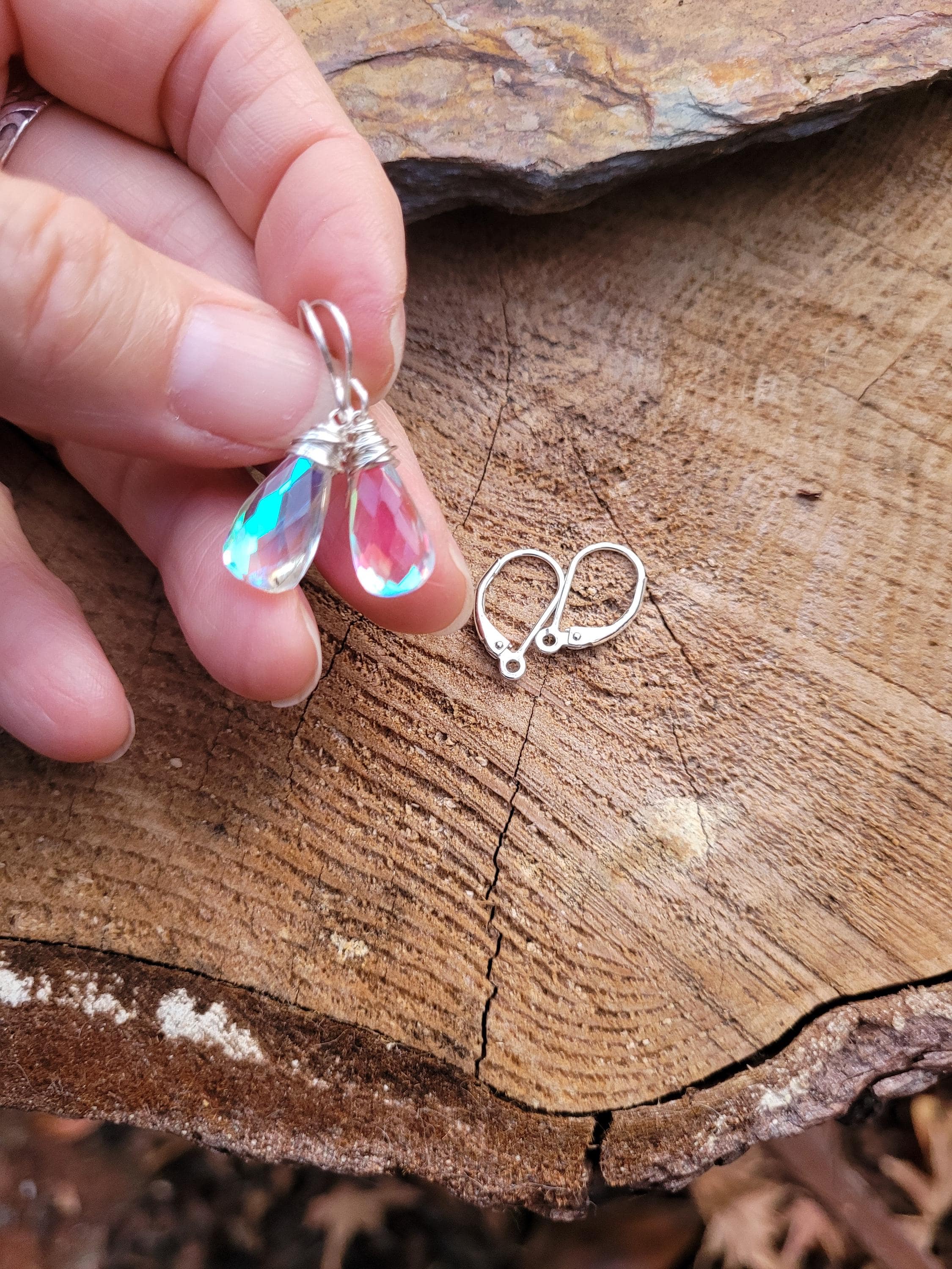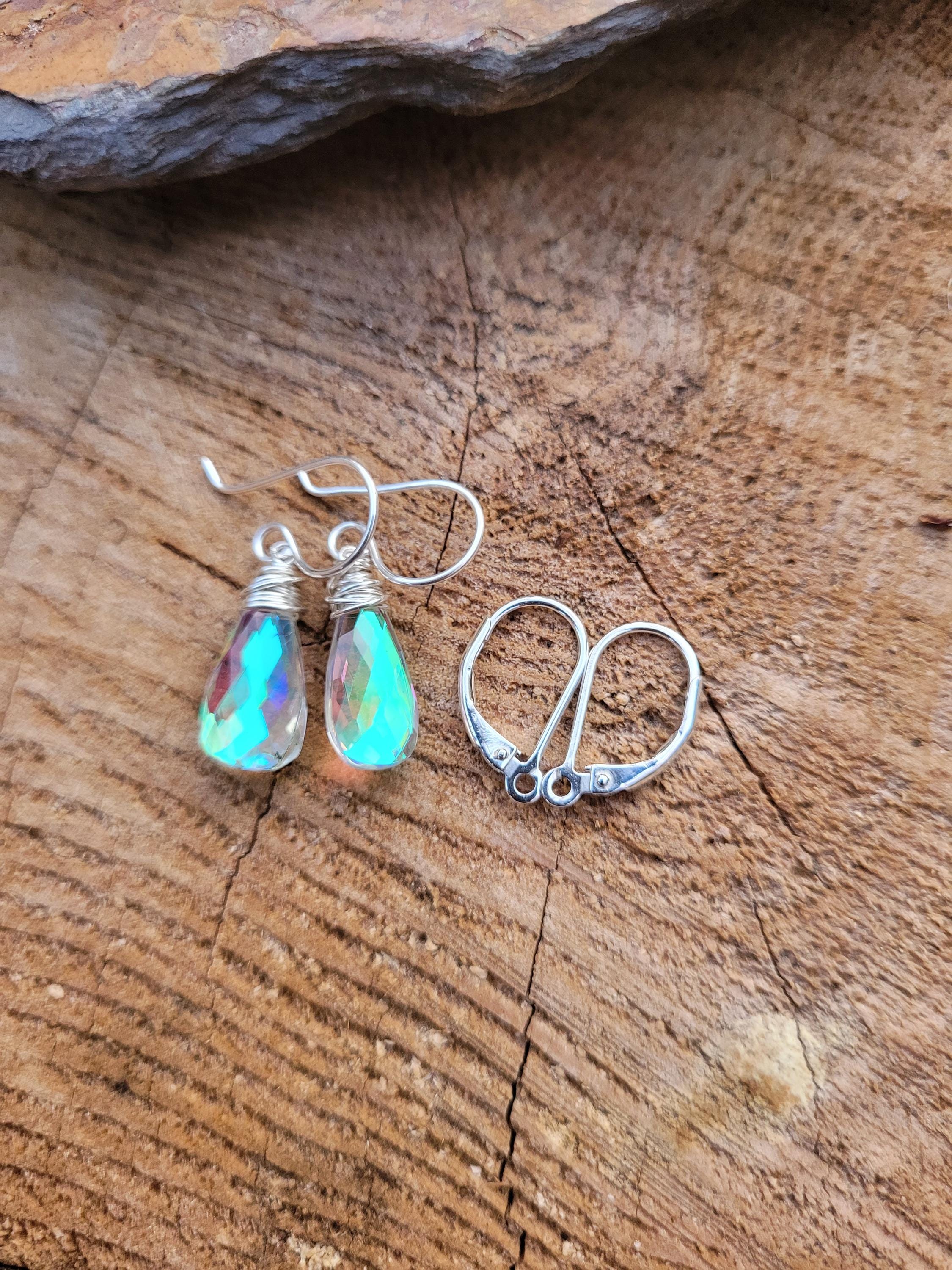 Rainbow quartz earrings dangle approx 1 inch from lobe. Elegant yet sweet these have amazing clarity and cut. Elegant earrings. Matching necklace available as well.