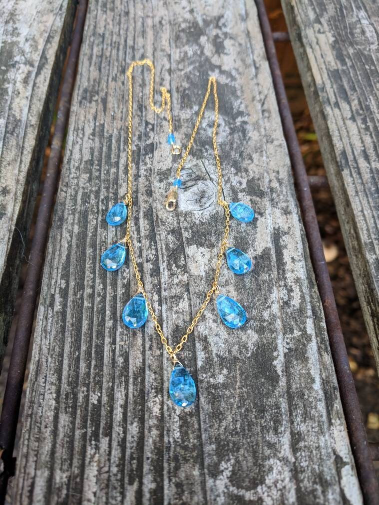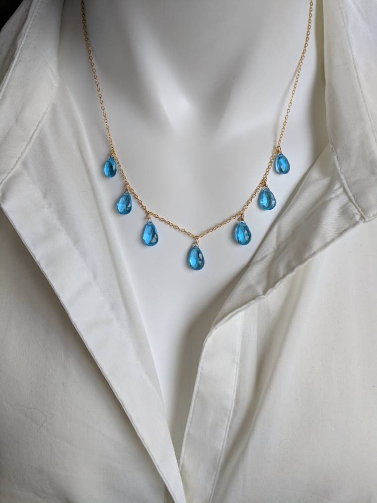 Stunning swiss blue topaz necklace. Quite the eye catcher with bright blue color on your choice of gold filled or sterling silver. This can be for that special occasion or just because.