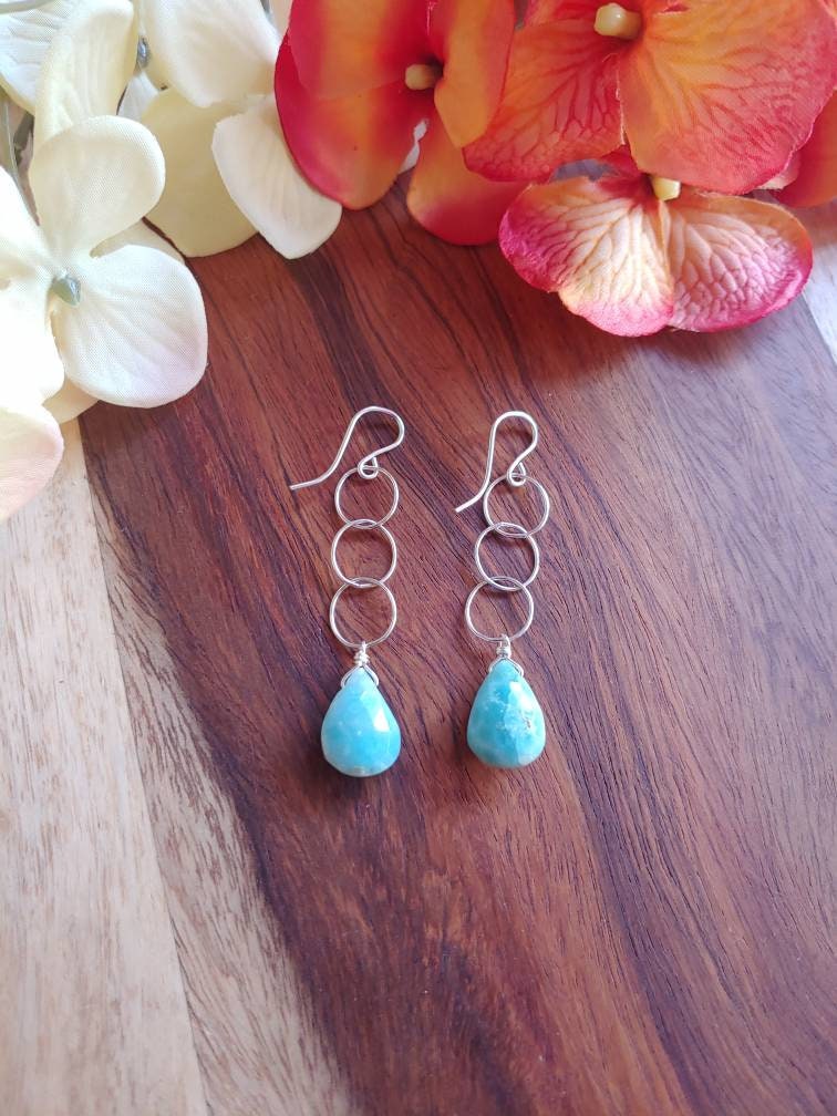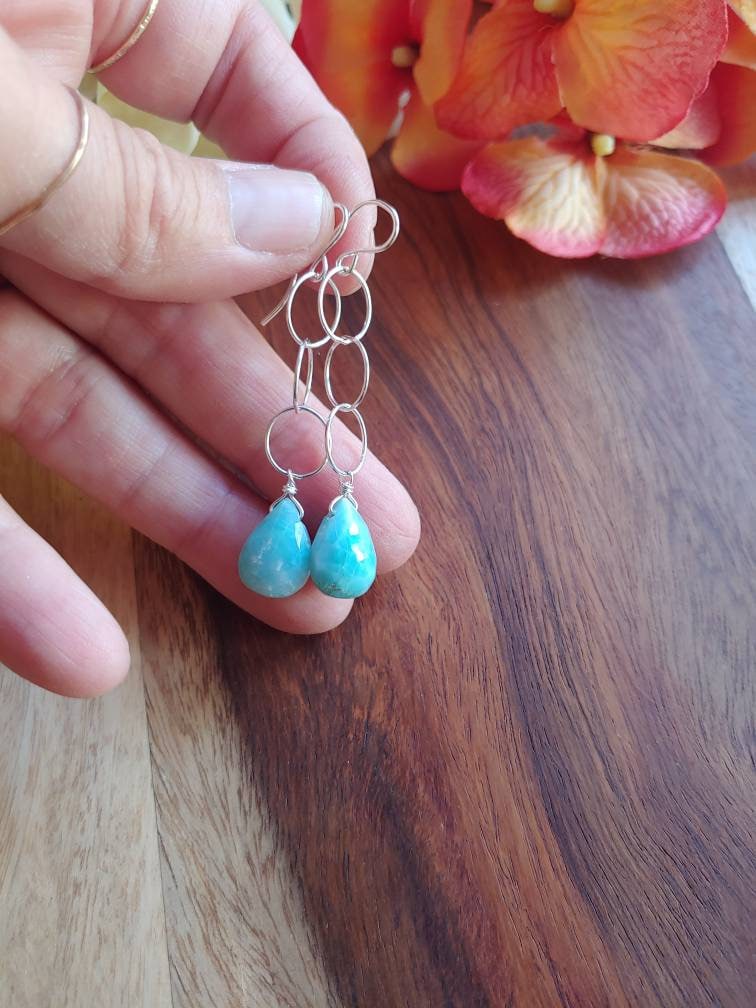 Dainty larimar earrings dangle approx 2 inches from lobe. Avail in Sterling silver or gold filled. Want to modify these? Want longer or shorter? Less links?