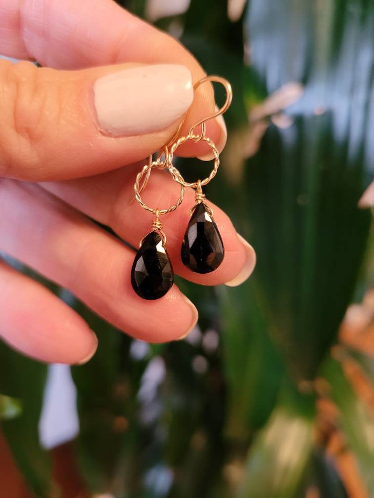 Dainty black tourmaline earrings. Hand wired with love on a twisted 9mm hoop. Faceted tourmaline gemstones. Unique back tourmaline earrings