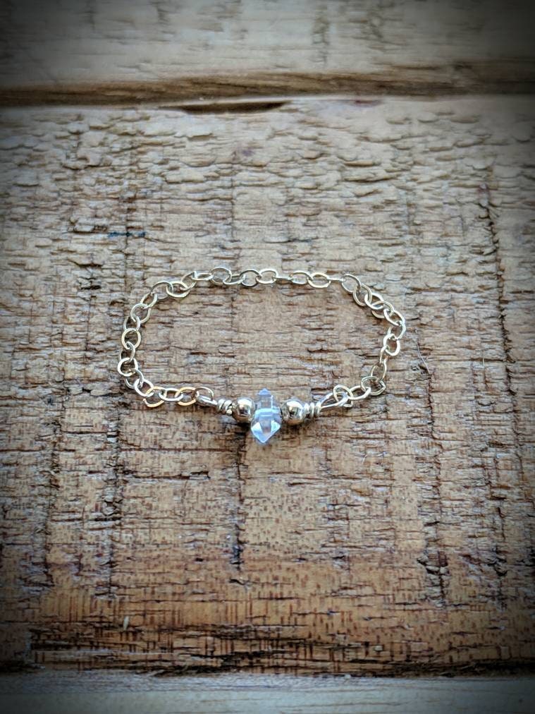 Sweet and charming Herkimer diamond ring. Available in gold filled, rose gold, or Sterling silver. Beautiful dainty midi ring. Hand wired with love! Gemstone is approx 2-3mm with beads on sides. Sweet and charming!