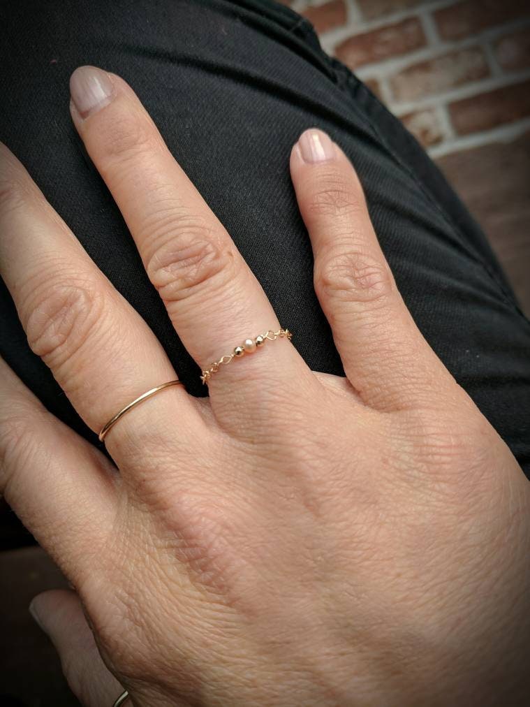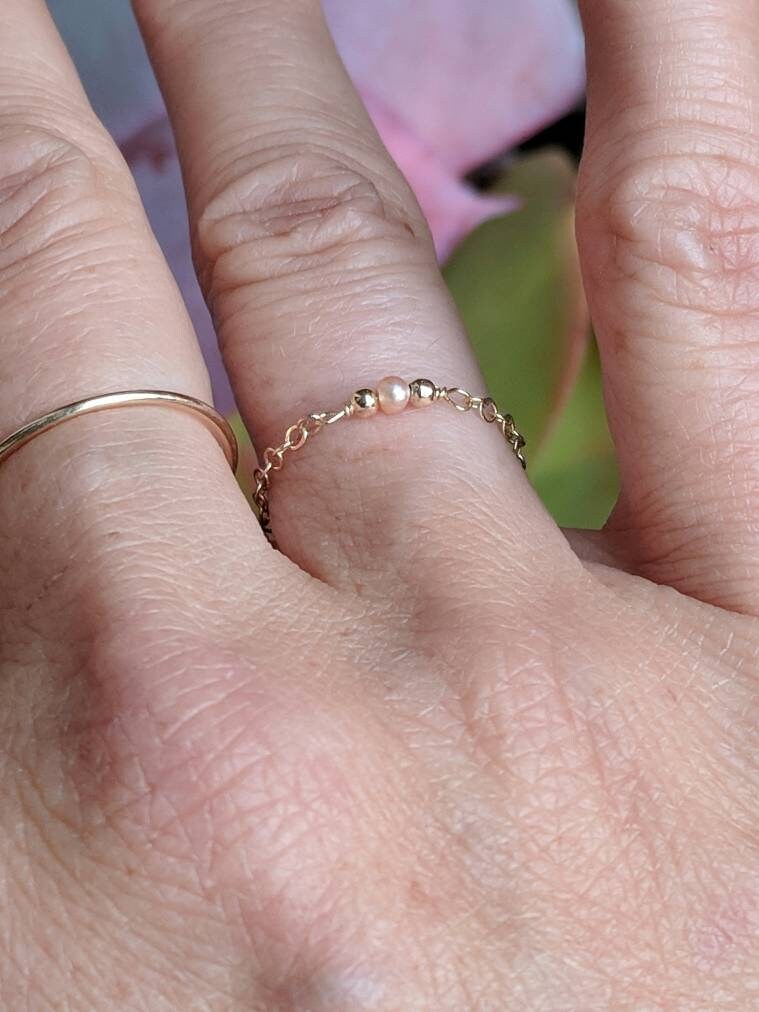 Sweet and charming pearl chain ring. Available in gold filled, rose gold filled, or Sterling silver. Tiny midi ring if you wanted as well. Sweet pearl ring. Hand wired with love! Pearl is approx 2mm with gold filled, rose gold filled, or Sterling silver beads. Sweet and charming!