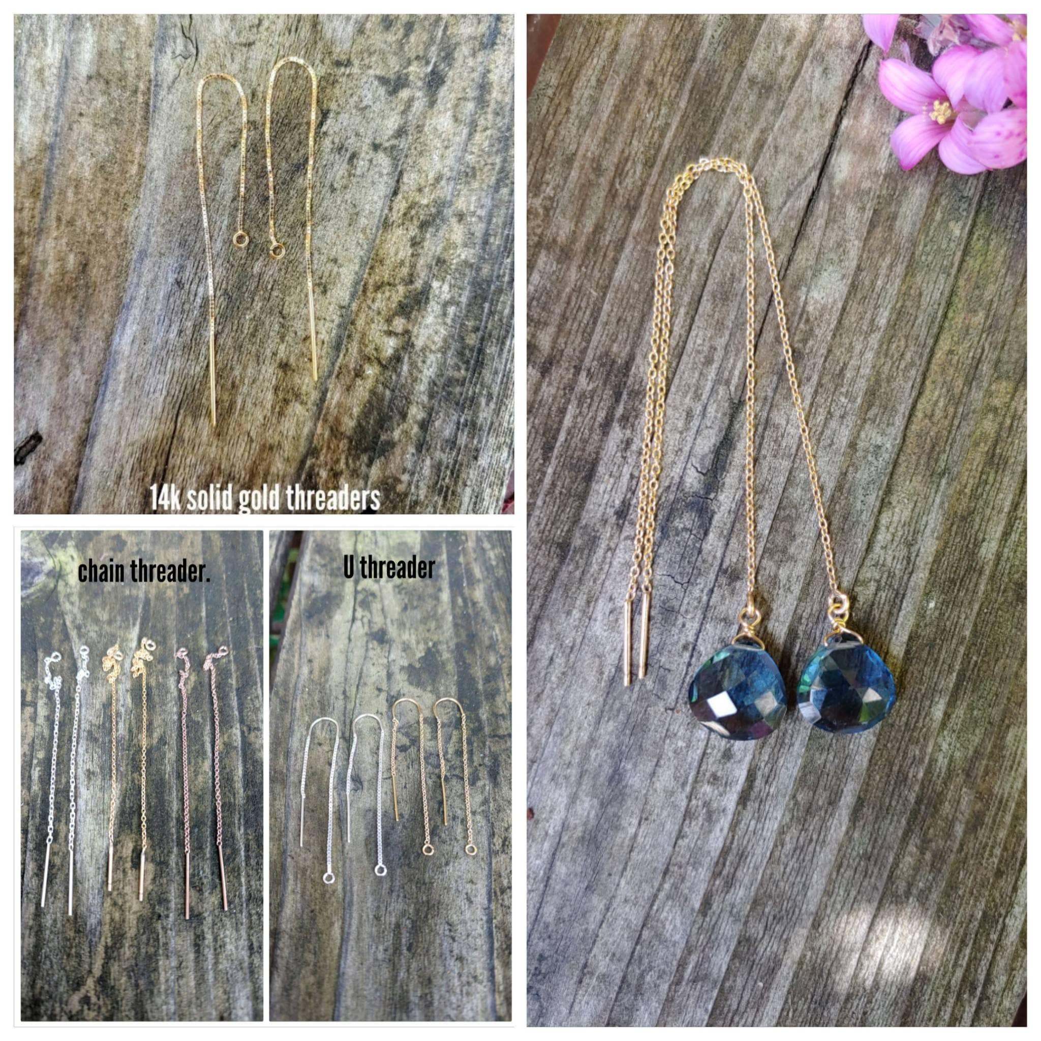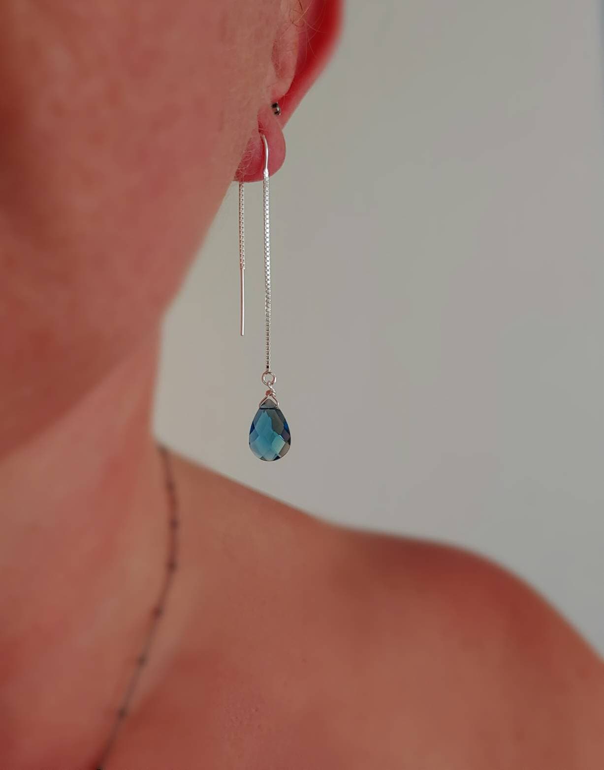 Dainty London blue topaz quartz threader earrings. Dangles approx 2.5 inches from earlobe.
